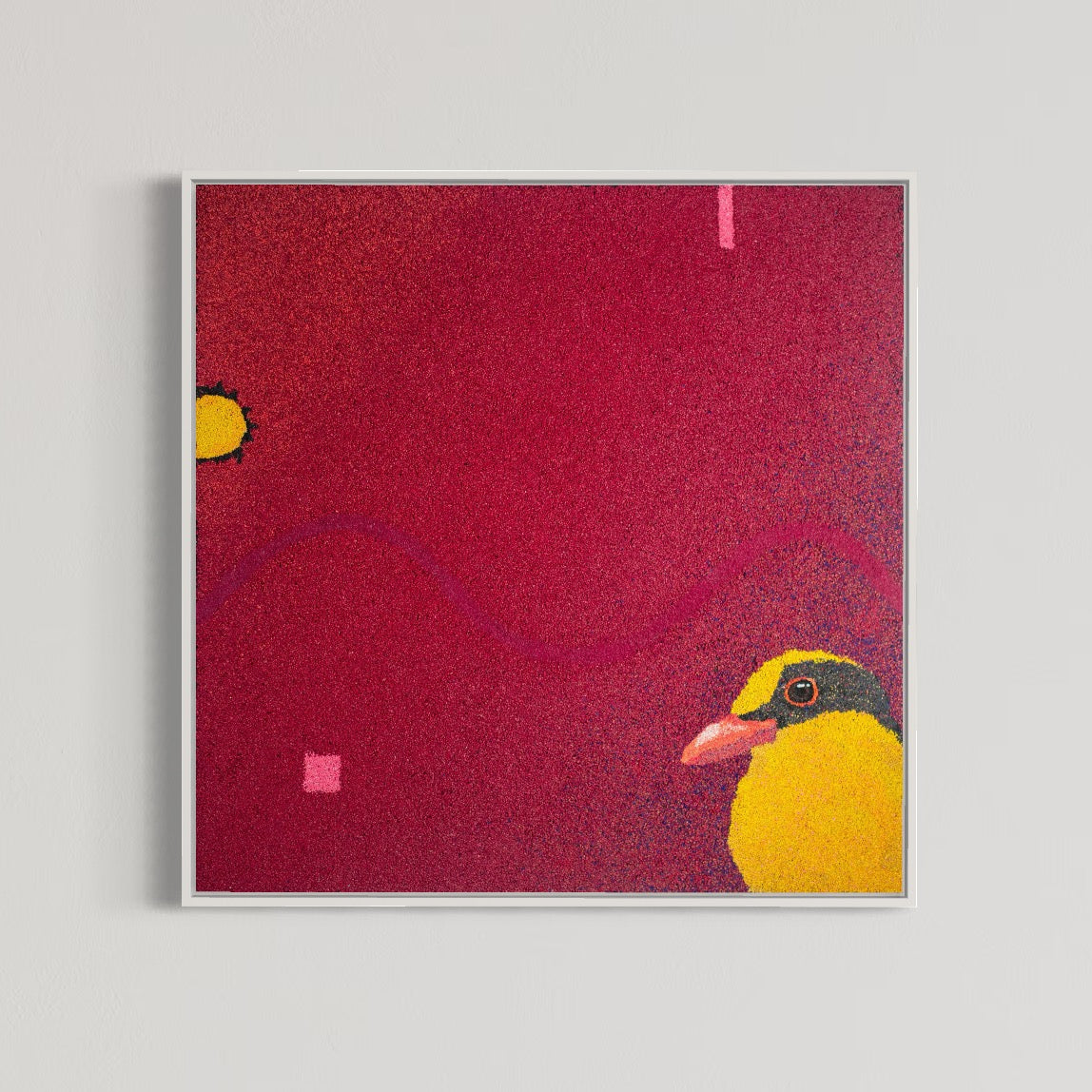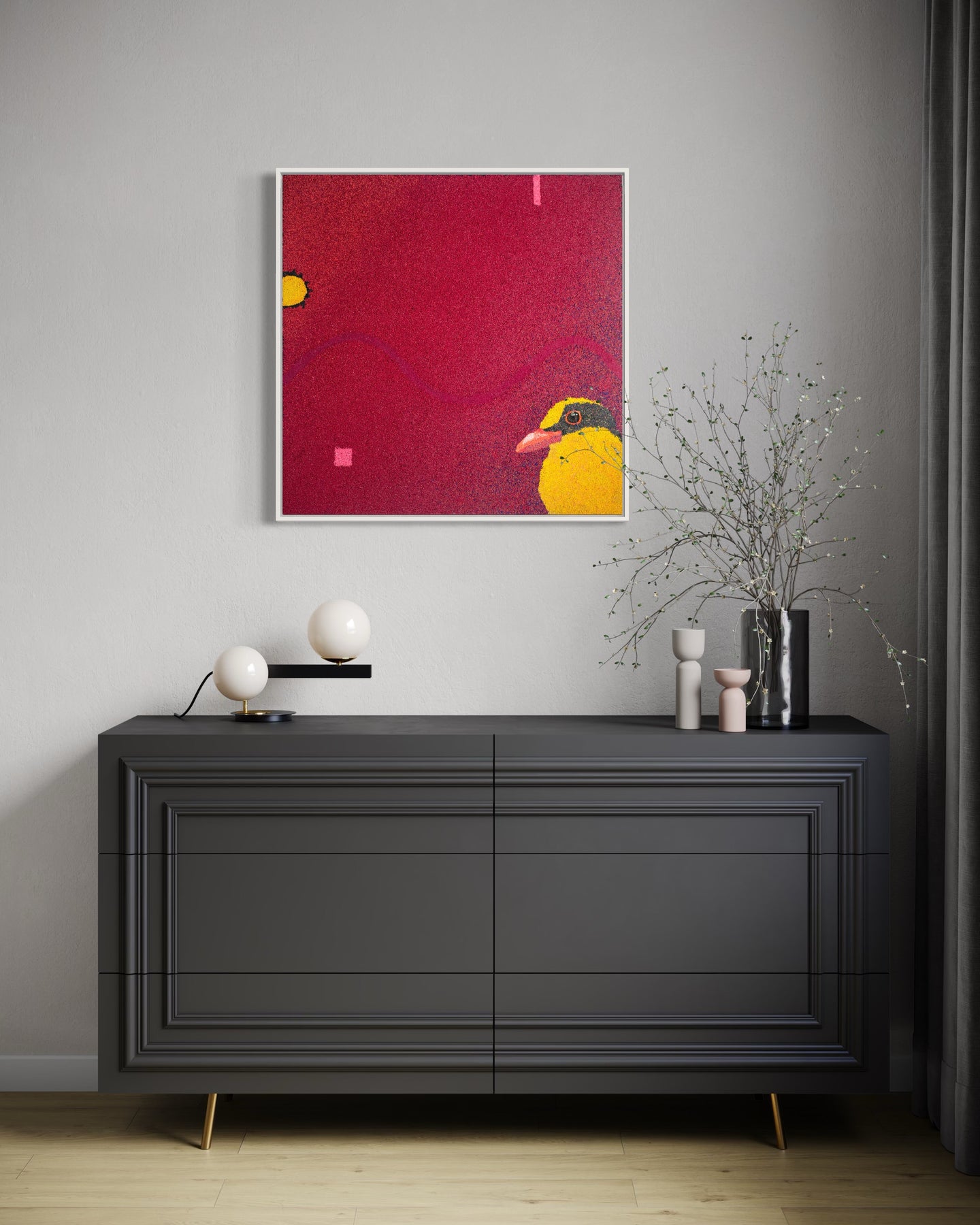 30"x30" abstract piece using crushed volcanic rock and acrylic paint with a bird and abstract forms over a red background.