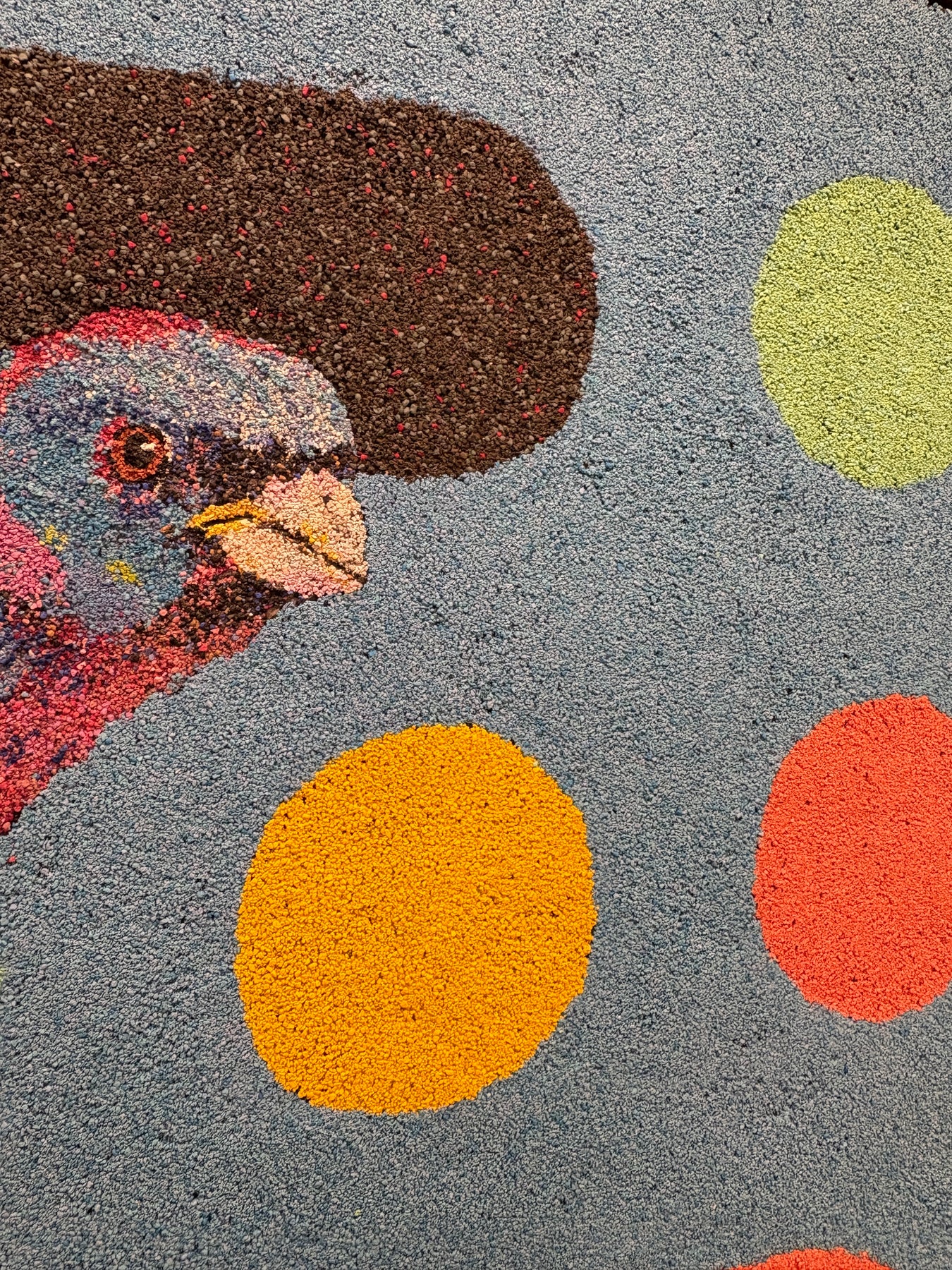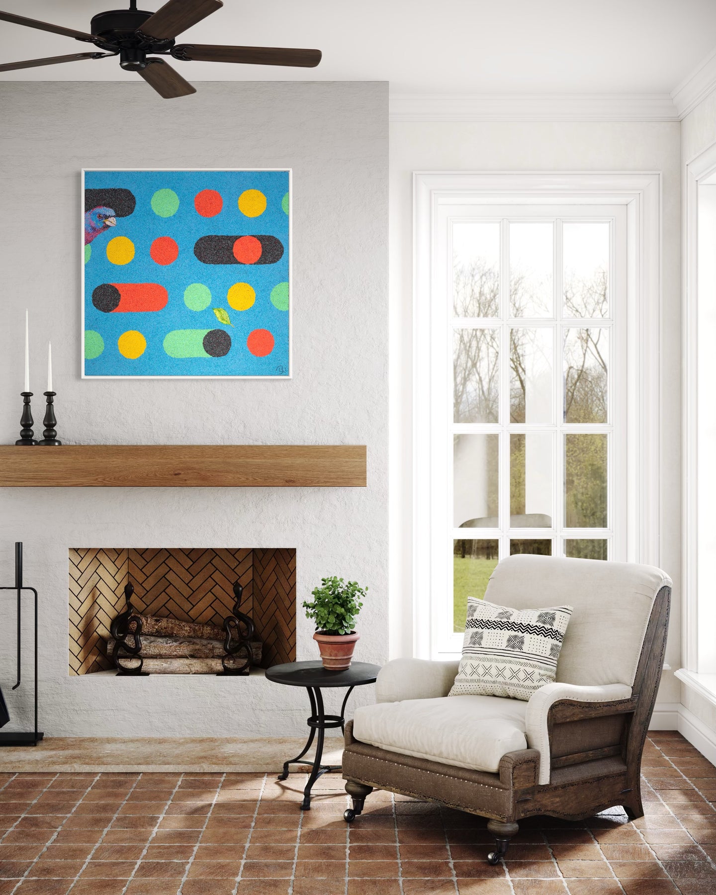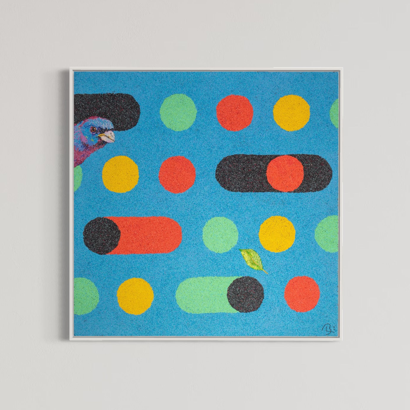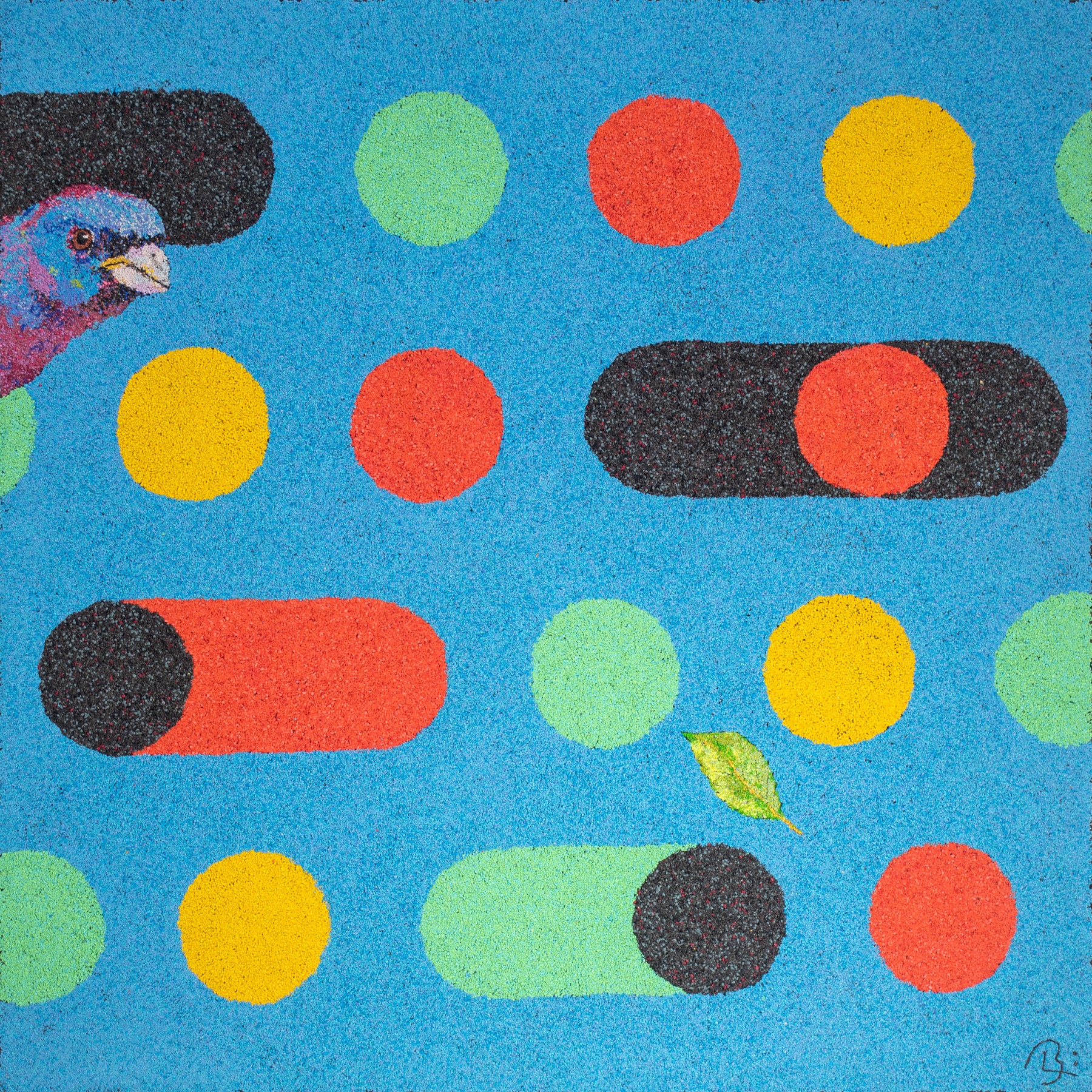 36"x36" abstract piece using crushed volcanic rock and acrylic paint with a bird and abstract forms over a blue background.