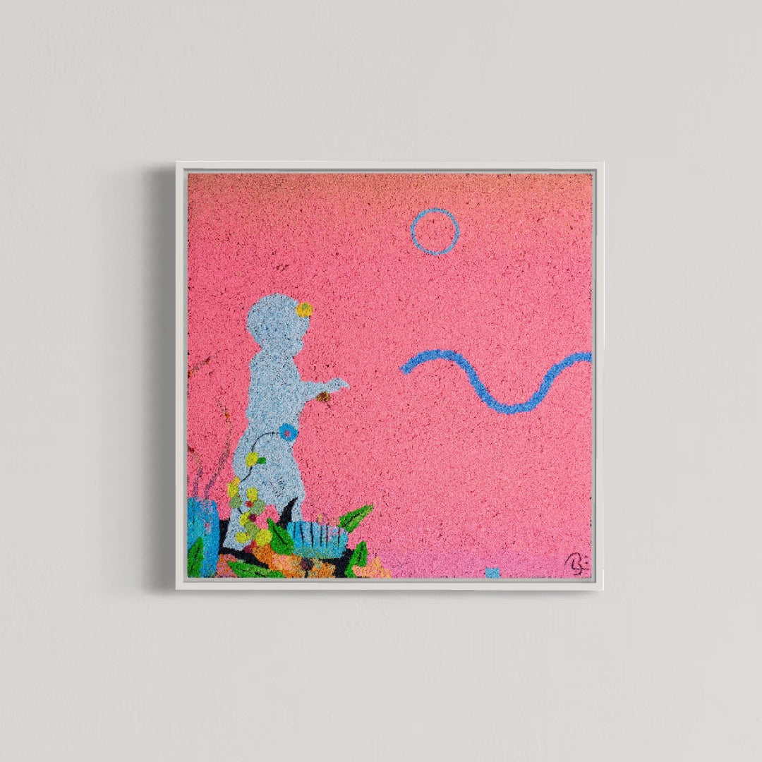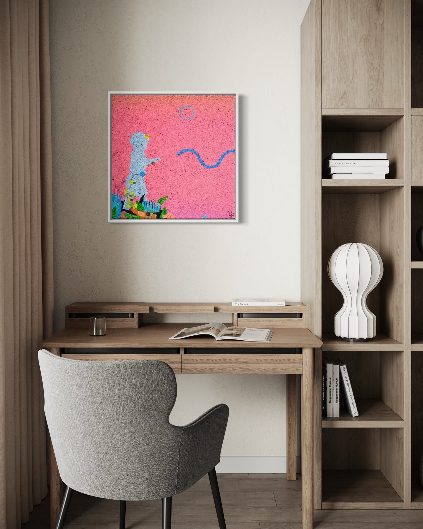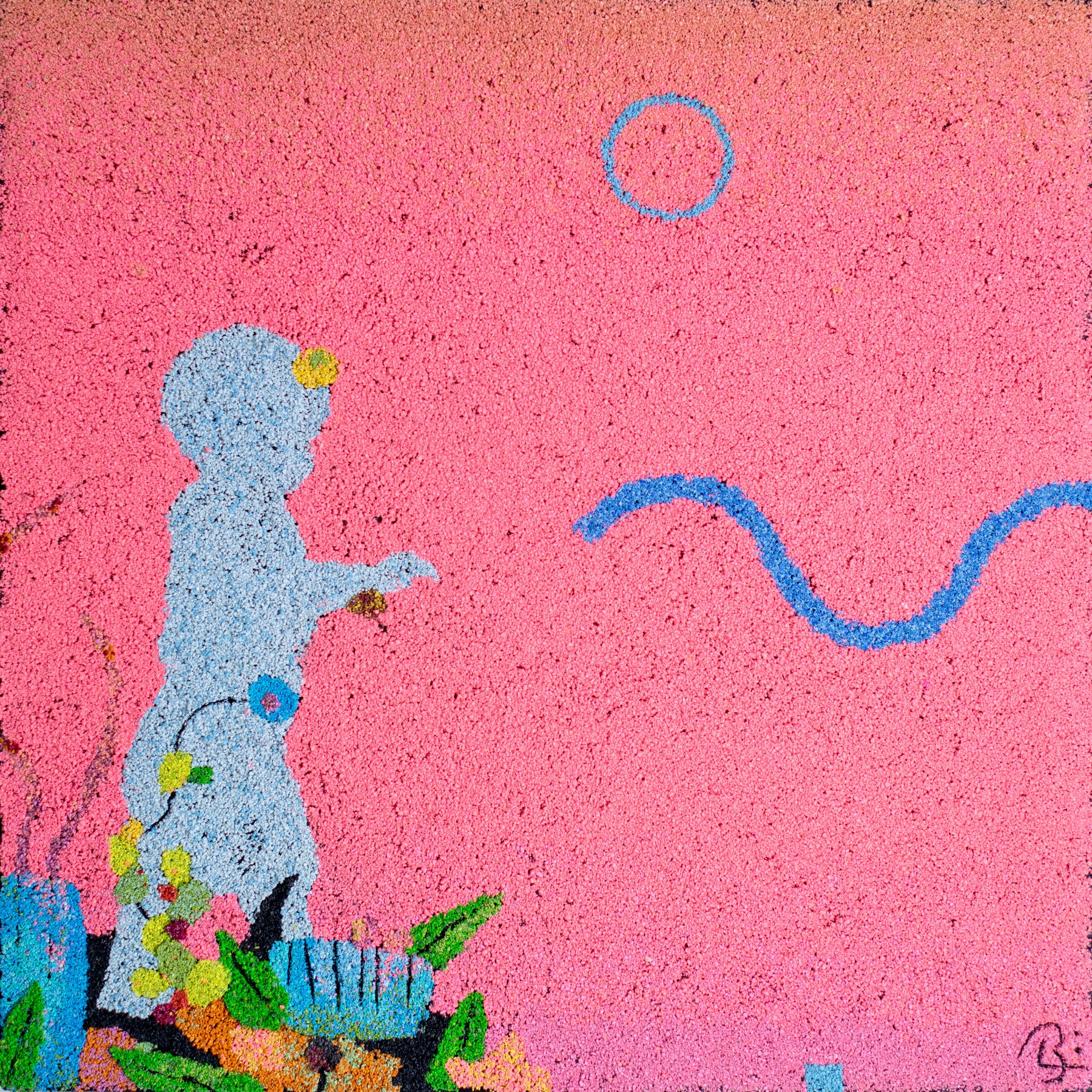 20"x20" abstract piece using crushed volcanic rock and acrylic paint with a child's silhouette and abstract forms over a pink background.