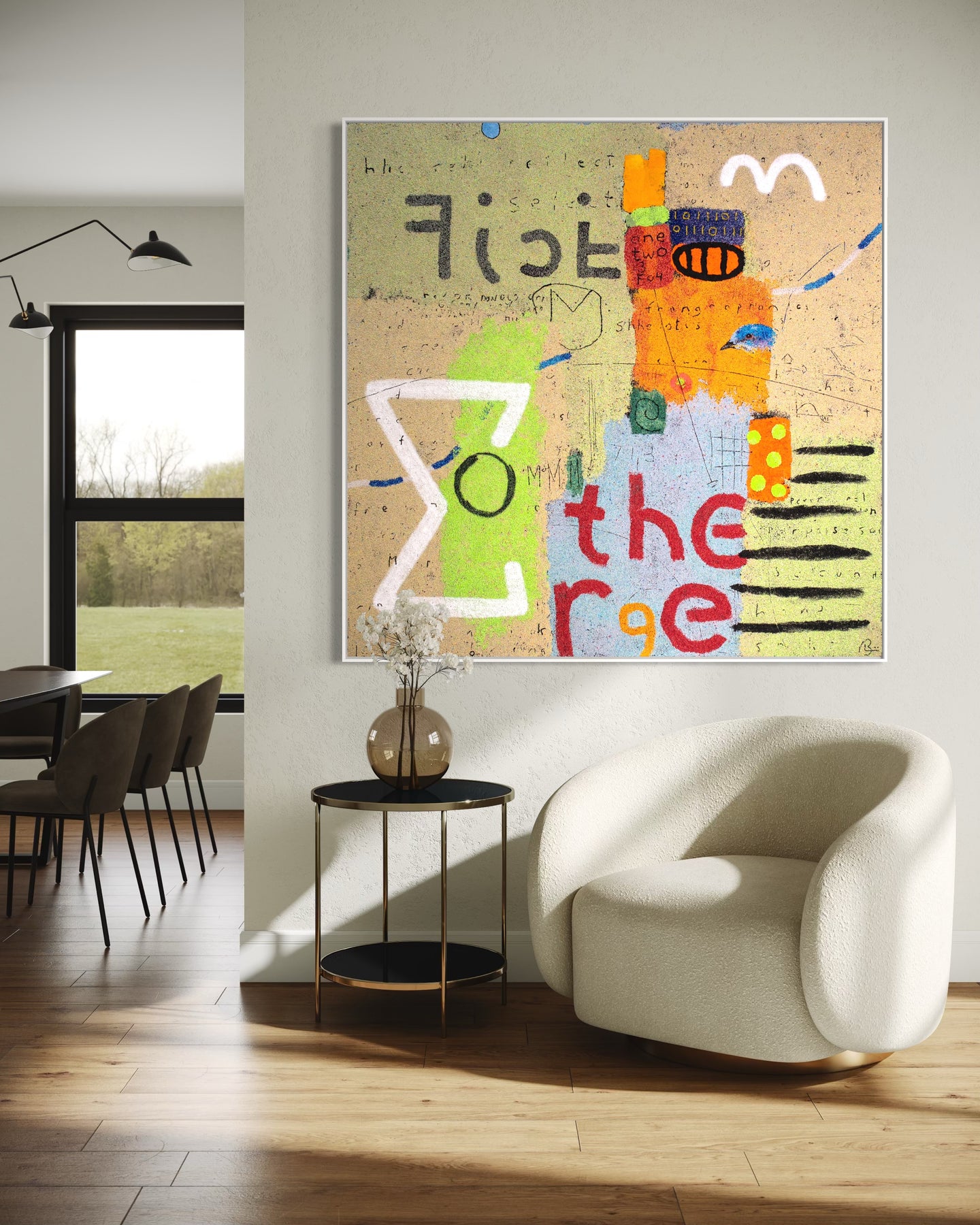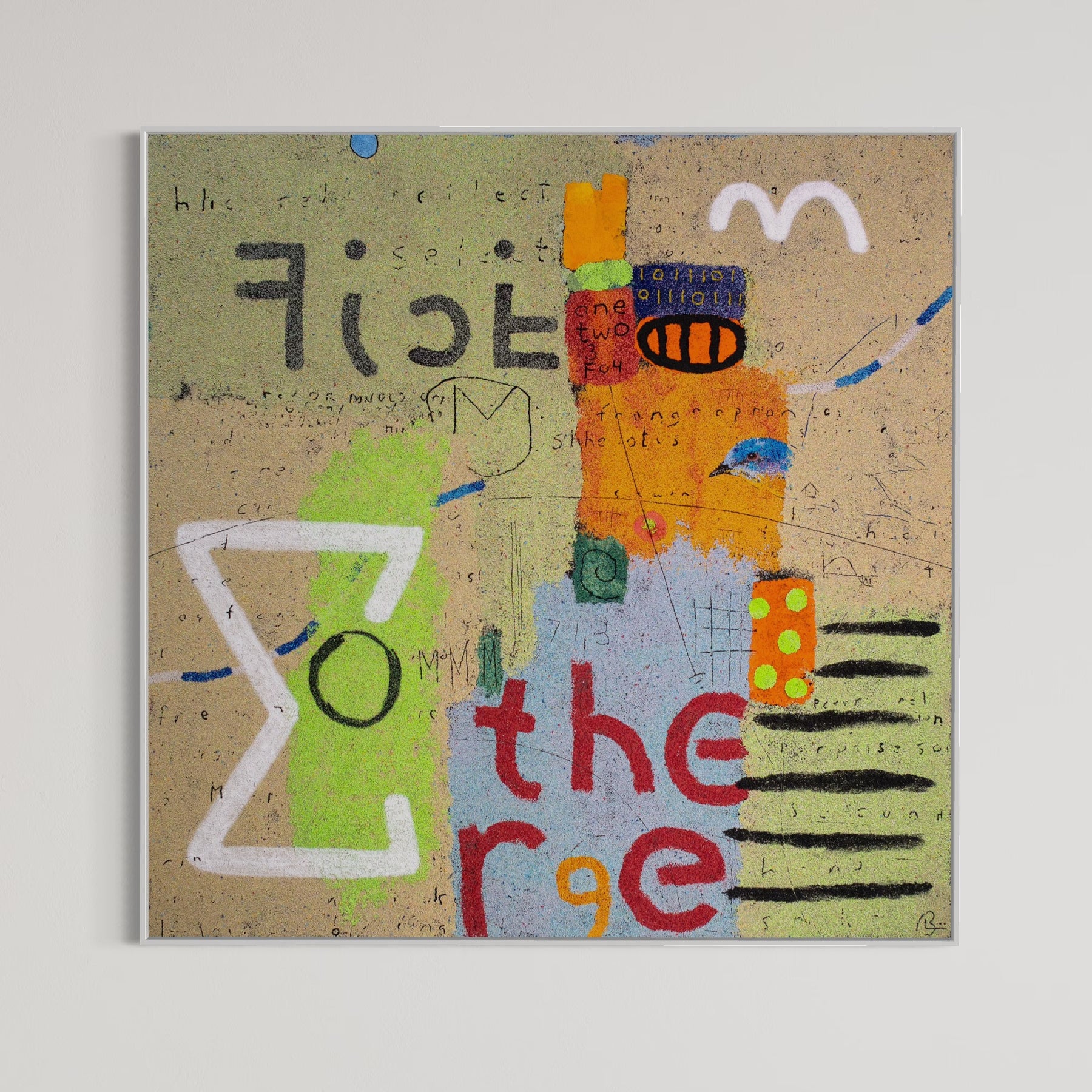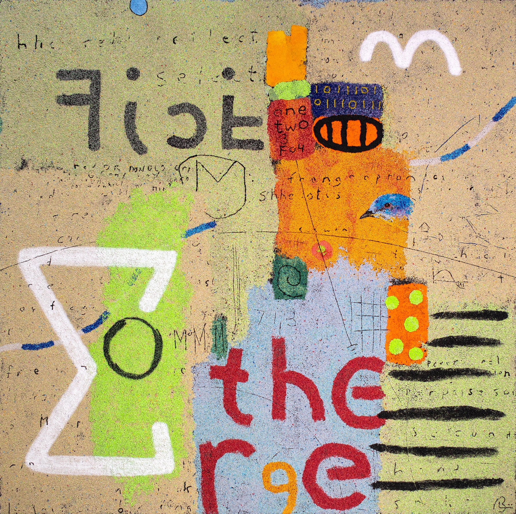 60"x60" abstract piece using crushed volcanic rock and acrylic paint featuring abstract forms over a green and beige background.