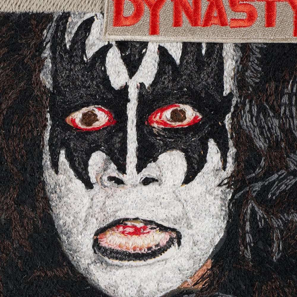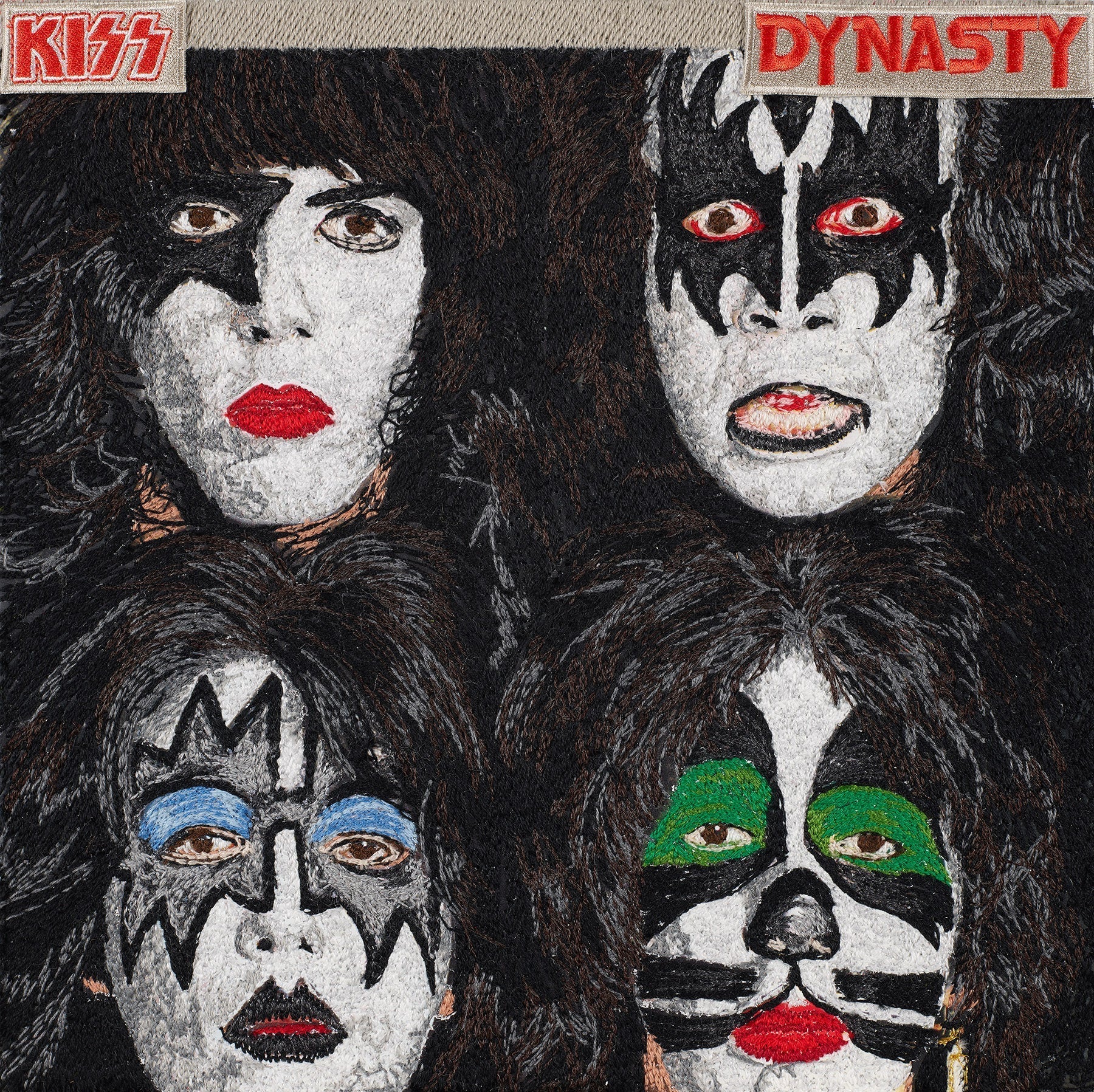 "Dynasty was released in 1979 following their hugely successful Love Gun album. The album contained the disco hit “I Was Made for Loving You”, possibly the only disco song by Kiss. This is my second Kiss album in this series following Destroyer. This album features close up photographs of all 4 band members collaged together. This is a very different cover style compared to earlier records and very challenging to reproduce in thread. I decided to stitch the whole album cover in thick wool thread. The faces were done using multiple layers of tight intertwined stitches in multiple colors. The layers of hair which comprise most of the photograph were created using very long stitches in multiple layers and colors. A big aspect in the art of digitizing is controlling how different layers of thread in different stitch lengths interact with each other. The finished piece has over 100,000 hand placed stitches. The logo and album title were created as patches and collaged onto the album as a final step." – Stephen Wilson