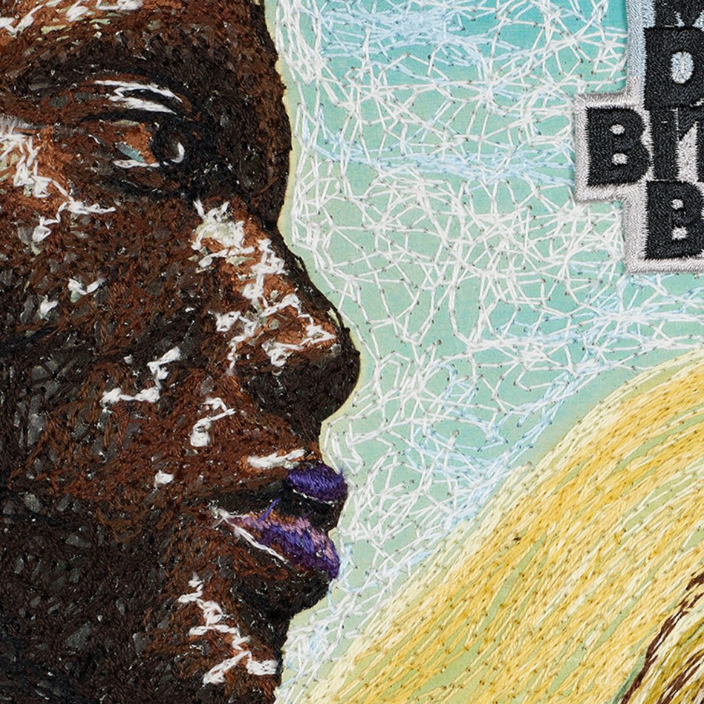 "Miles Davis is a jazz icon that went through a lot of different musical phases during his storied career. From traditional jazz to explosive jazz fusion. For my first Miles Davis album I chose Bitches Brew, his 1970 release. The album cover is a painting with multiple focal points. There is a couple on the beach, swirling clouds, a giant flower and a face in profile. I embroidered the whole cover using wool thread in varying stitch lengths and densities. The album title was created as a gradient patch and mounted onto the album." - Stephen Wilson