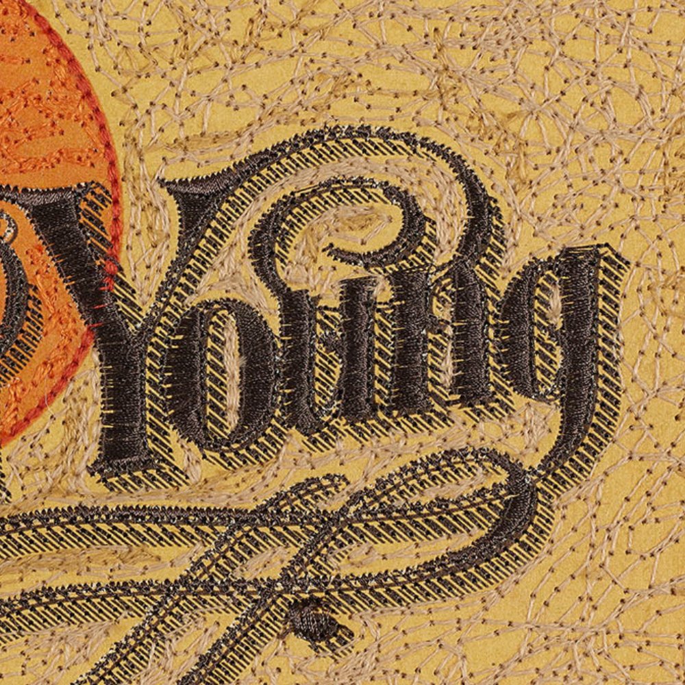 "Neil Young’s request to the record label when designing this album cover was that he wanted it to slowly degrade after it was removed from the shrink wrapping. Inevitably this didn’t happen but when embroidering this album i wanted it to look and feel really old. For this to occur I searched for really vintage, worn albums. The more tattered the better. I then stitched thousands of stitches in shades of brown and tan to age the cardboard even more. The logo was created by stitching directly through the albums with thousands of more stitches. When I finished, the album truly looks like it was embroidered almost 50 years ago, when Harvest was originally released." – Stephen Wilson