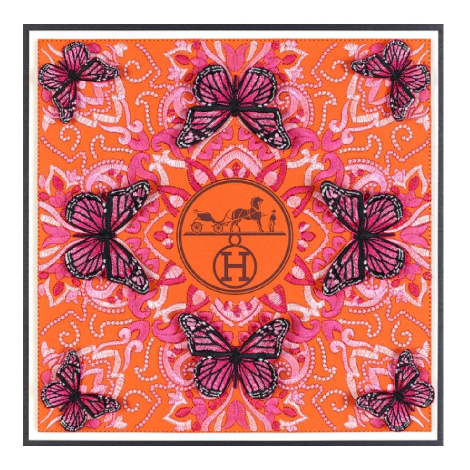 The symmetry pieces were created by first designing and embroidering a vintage bandana pattern right through a luxury box. The colors of thread that are used are always bright and vibrant. Once the embroidery is complete tonally embroidered butterflies are added to the background in a symmetric pattern. Experience the ultimate blend of art and fashion with Custom Symmetry.