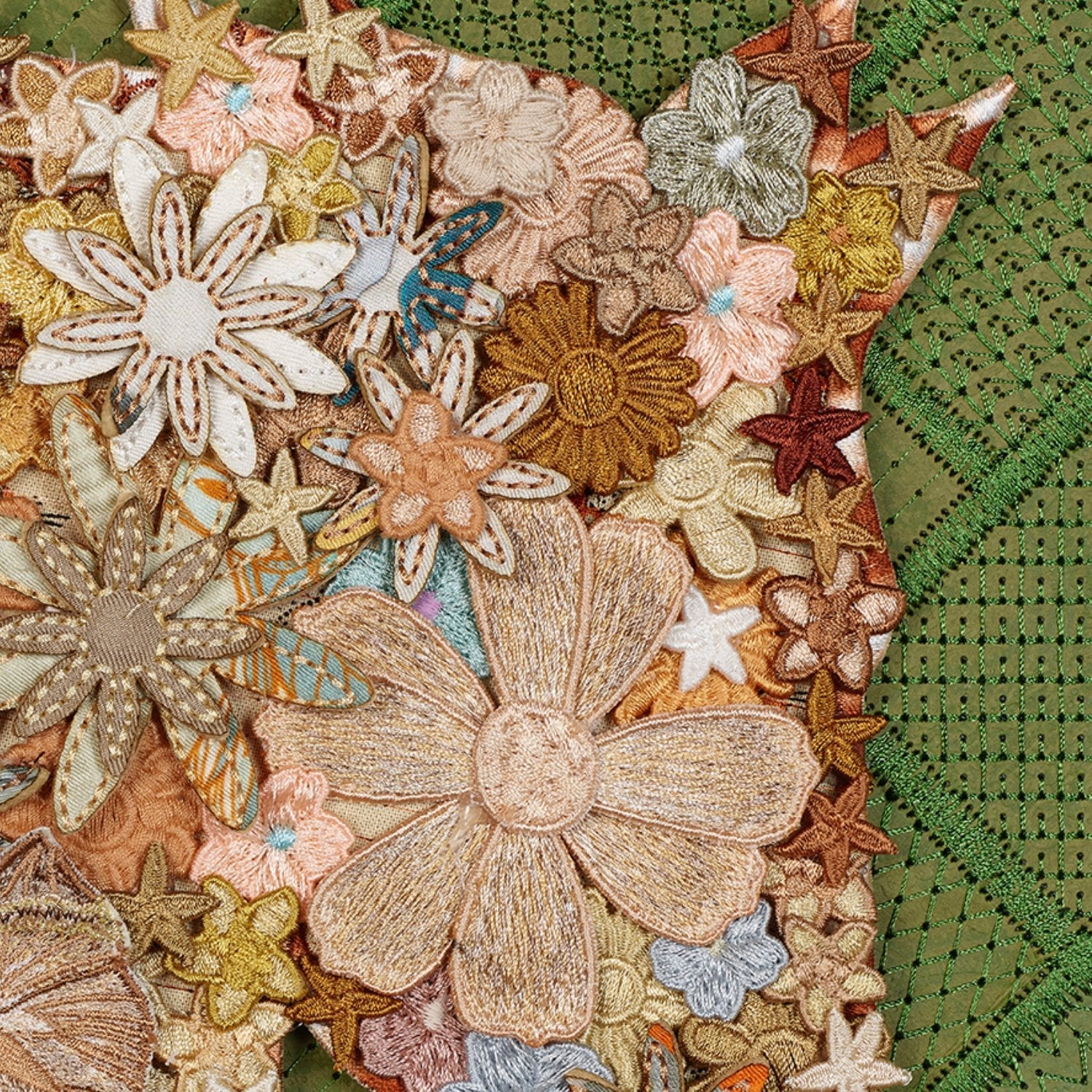 All of the gypsy pieces are made out of multiple types of elements in each piece, the main element is the Gypsy Flowers. The Flowers, lace flowers, patches and of course butterflies. Once the pieces are embroidered or trimmed they are sorted by color. He starts with a silhouette of the design and then slowly builds the layers of flowers and elements, mixing all of these styles and colors together to form something completely new.