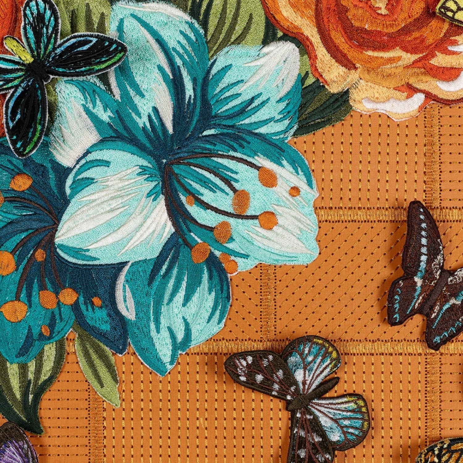 The floral corners start with an embroidered luxury box or bag. The embroidery is stitched directly through the box using tonal thread to create an intriguing background. The flowers in the corners are designed, embroidered and added to the background as a collage. The butterflies are also embroidered in the studio and add to the box as a final step. Each box or bag is a fusion of art and fashion, truly a one-of-a-kind masterpiece.
