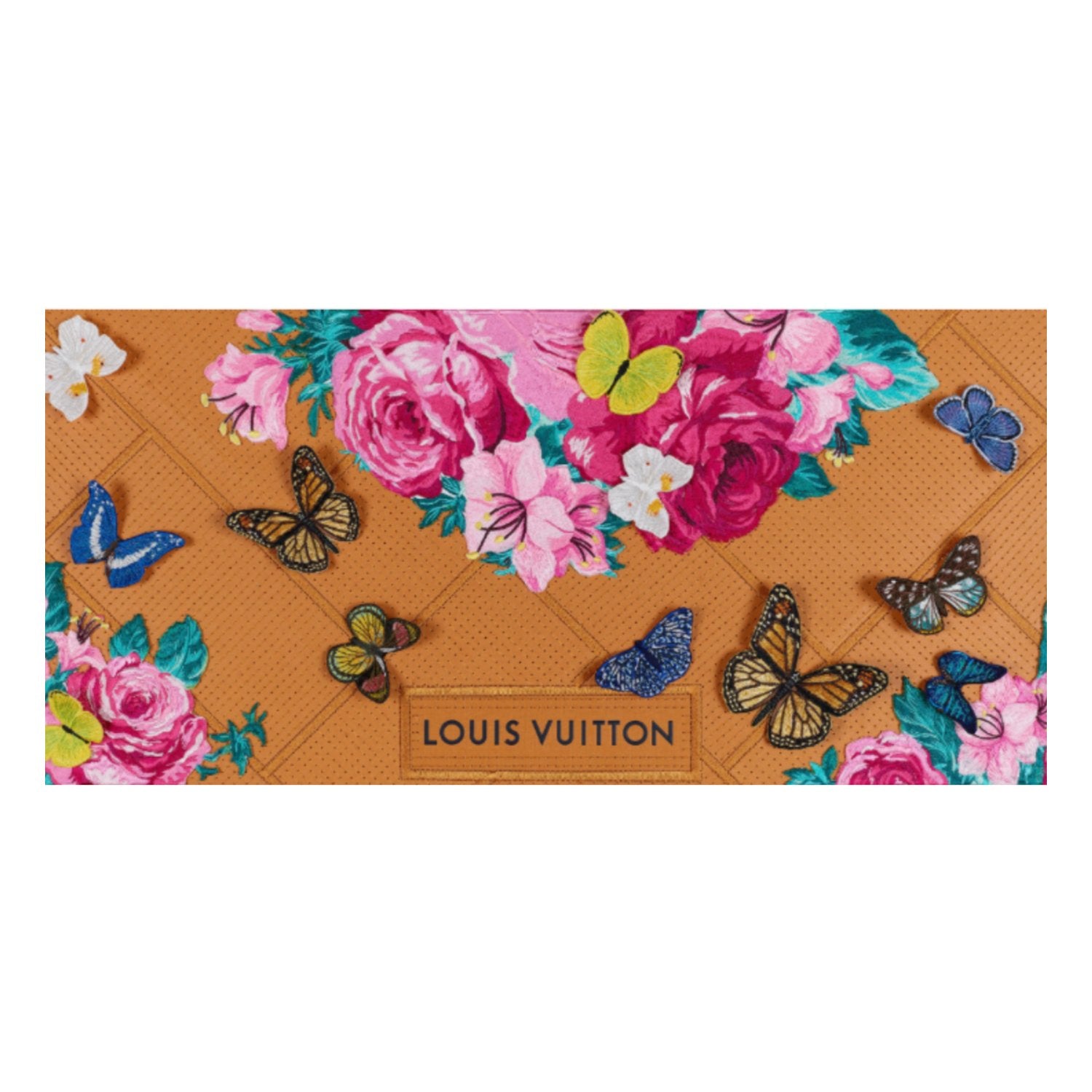The floral corners start with an embroidered luxury box or bag. The embroidery is stitched directly through the box using tonal thread to create an intriguing background. The flowers in the corners are designed, embroidered and added to the background as a collage. The butterflies are also embroidered in the studio and add to the box as a final step. Each box or bag is a fusion of art and fashion, truly a one-of-a-kind masterpiece. Delivery time for a custom Floral Corner is 4 weeks.