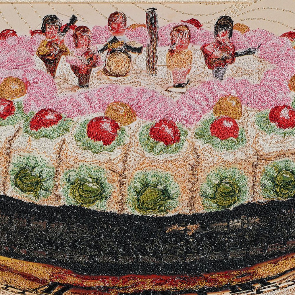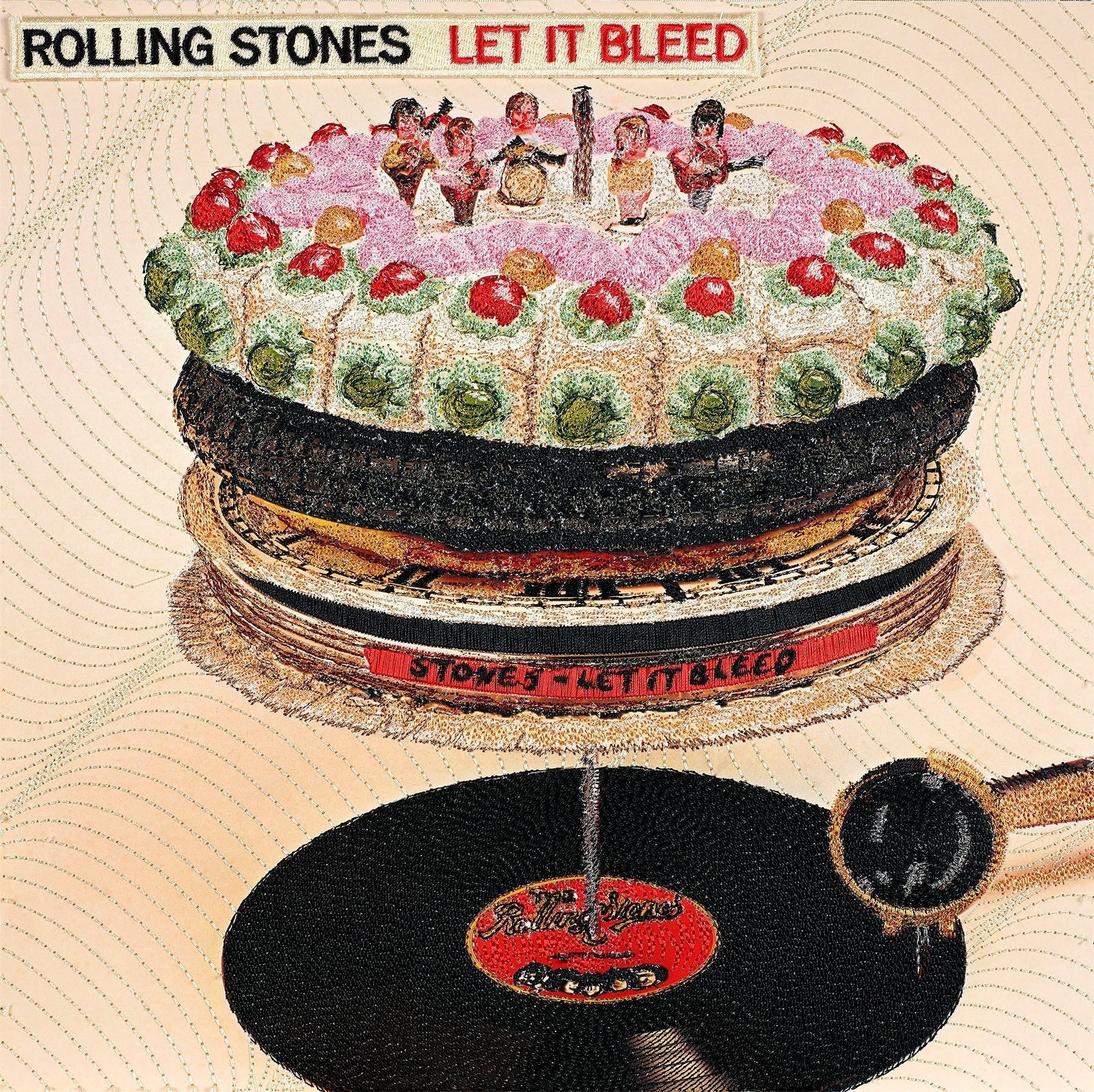 "The cover for this album is a photograph of a sculpture created to look like a a cake. Everything is perched over an album on a turntable--film reels, a tire, a clock face as well as frosting and mini figures of the band. This album has been on my wall for a while waiting for me to start it, this was a very difficult project and I kept putting it off. Someone commissioned it so it went into the lineup. I started by stitching a waxy geometric background in tonal threads to give the background some interest and then the cake. There are over 75 different colors of thread in this piece and over 100,000 painstakingly placed stitches in the project. The end result is amazing. The thread gives Let it bleed dimension and depth. The album title was created as a patch and mounted to the album as the finishing step." – Stephen Wilson
