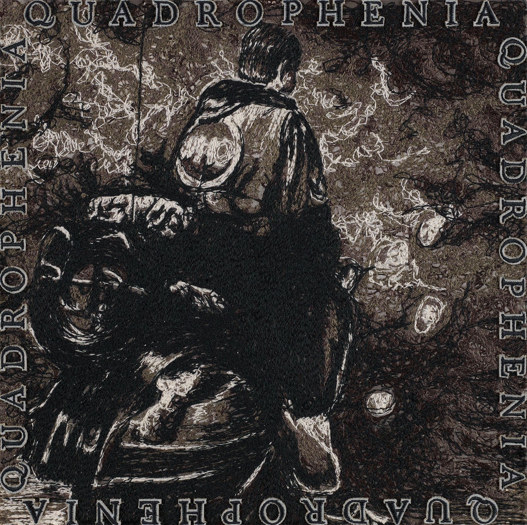 "Released in 1973, Quadrophenia was an album whose tracks held a larger meaning collectively. The double album actually inspired the making of a film of the same name. The name Quadrophenia refers to the diagnostic term schizophrenia, to reflect the four distinct personalities of the opera’s protagonist. It is also a play on the term “quadrophonic sounds.” The visuals for the album cover is the back of the main character of the story standing on a motorcycle surrounded by smoke. The pictures of the band are hidden in the rear view mirrors of the motorcycle and the text surrounds the main image on all 4 sides. Since the image is black and white with lots of swirling smoke I decided to embroider this with multiple layers of abstract tonal threads. I used different threads; wool, cotton, rayon and polyester. The different threads create nice textural variations. The lettering was created as patches and then mounted to the album last." – Stephen Wilson