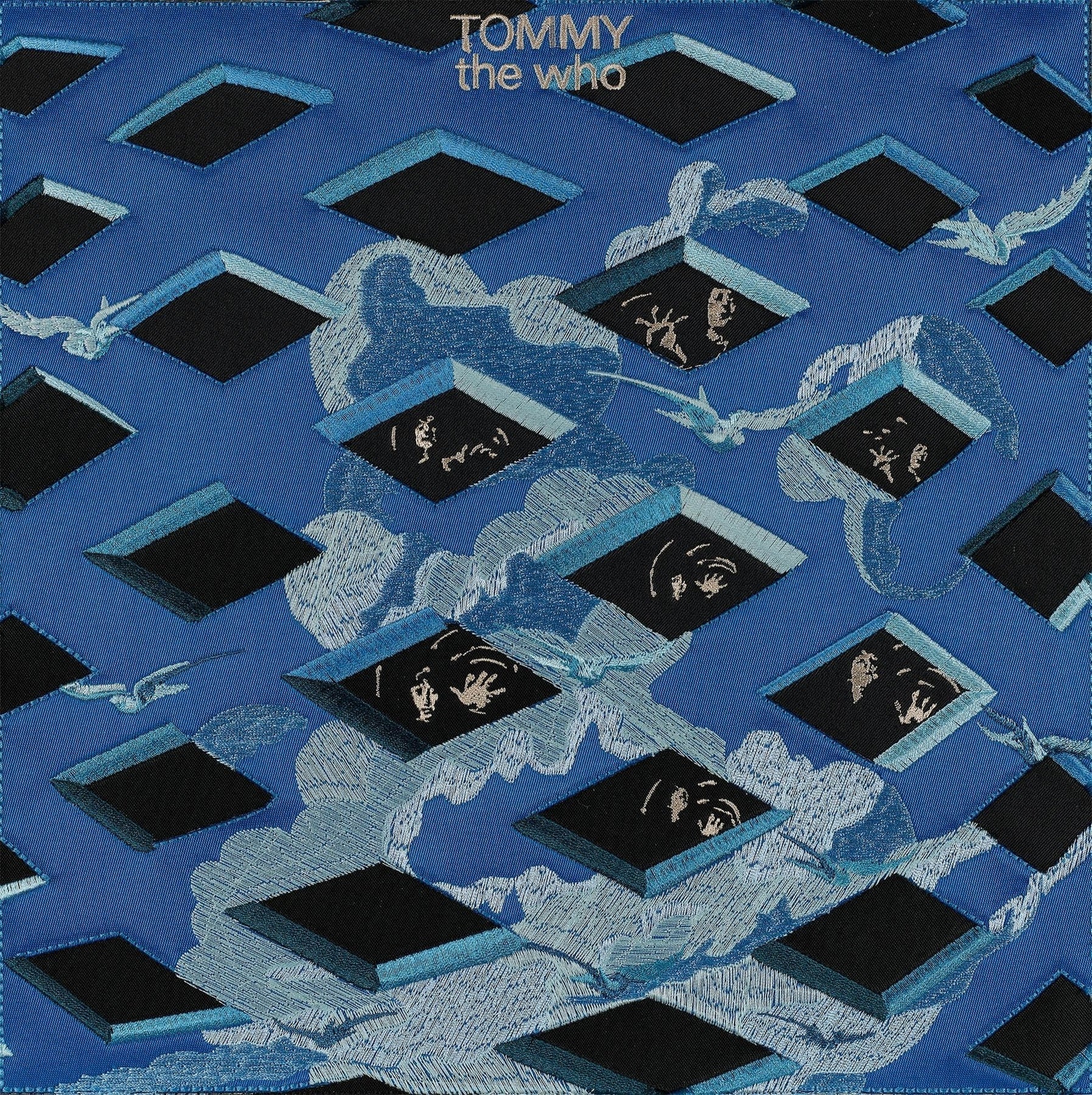 "Tommy was a rock opera created by The Who in 1969 and over the years it became one of their most popular and endearing albums. There have been musicals, movies and countless covers of the songs from Tommy over the last 50 years. The cover features a graphic of the band behind a geometric orb with airbrushed clouds and birds on it. I wanted to use multiple layers of fabric to create the background and foreground. I started with black glitter fabric for the background and then stitched the band members in rayon thread on top of the fabric. I then appliquéd the blue foreground fabric and laser cut the holes out of the fabric to expose the background. The clouds and birds were stitched in multiple layers of blue and white rayon thread with the logo stitched right through the fabric. " – Stephen Wilson