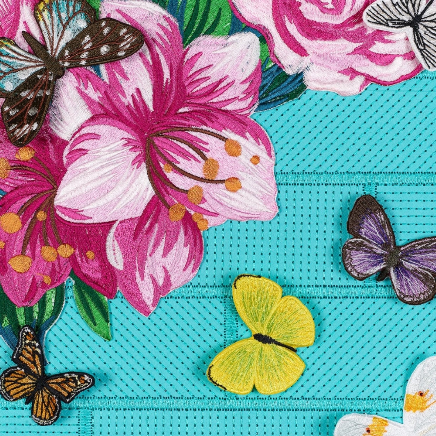 The floral corners start with an embroidered luxury box or bag. The embroidery is stitched directly through the box using tonal thread to create an intriguing background. The flowers in the corners are designed, embroidered and added to the background as a collage. The butterflies are also embroidered in the studio and add to the box as a final step. Each box or bag is a fusion of art and fashion, truly a one-of-a-kind masterpiece. Delivery time for a custom Floral Corner is 4 weeks.