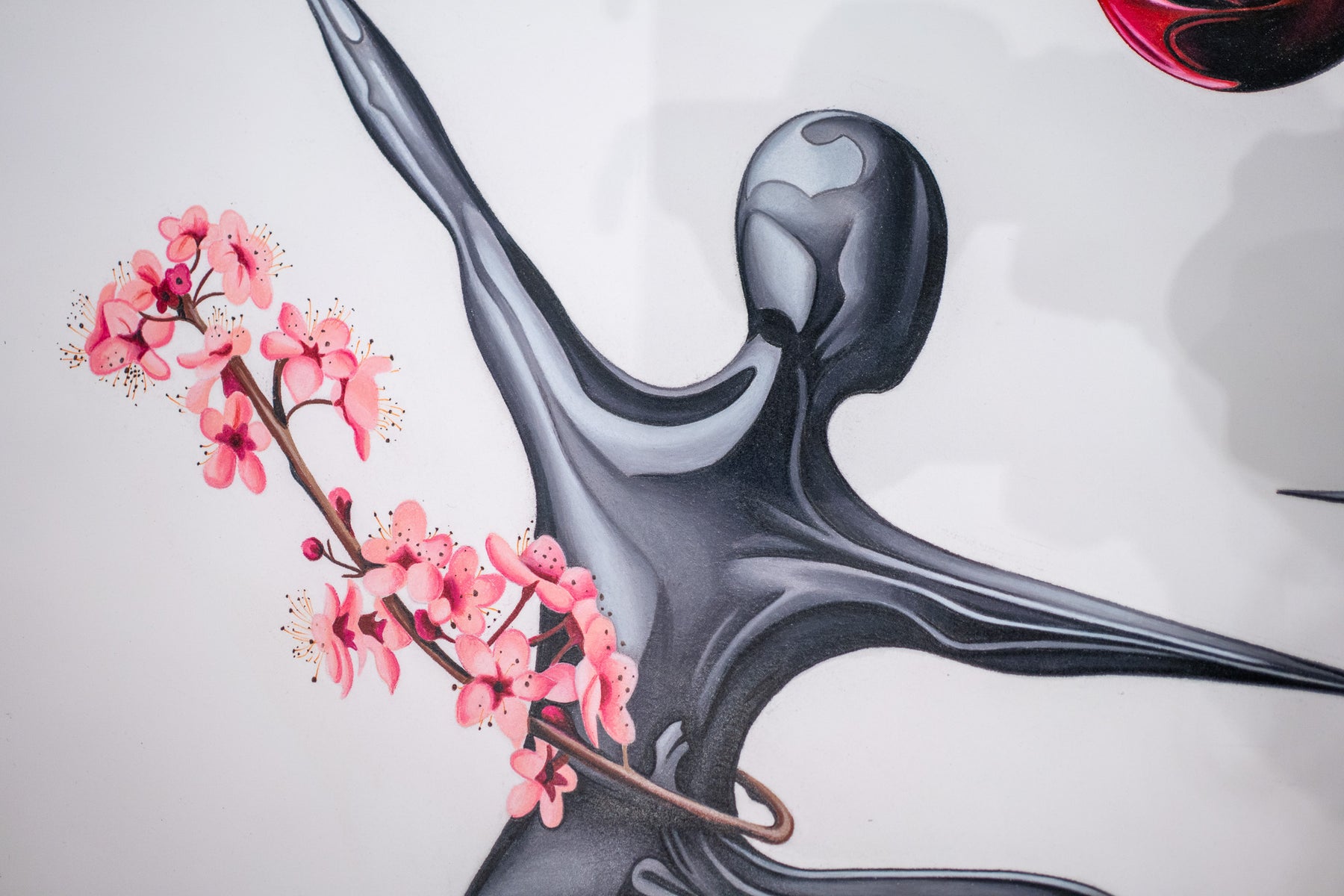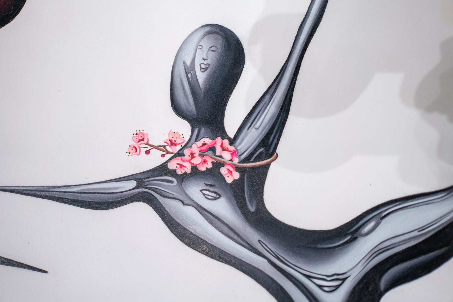Tanner Valant creates hyper-realistic, unexpected image pairings—fish swim around M.C. Escher-like spheres, paint-dripping hands hold bonsais, and classical busts are drenched in mercury-like liquid—challenging viewers to explore themes of balance, duality, and human interaction through dark, mystical elements. At just 19, Valant, an emerging artist at the Art Institute of Chicago, achieves stunning precision using colored pencils, pens, airbrushes, and markers. As his technique evolves, he aims to engage critically with society, incorporating familiar objects to reflect our changing world.