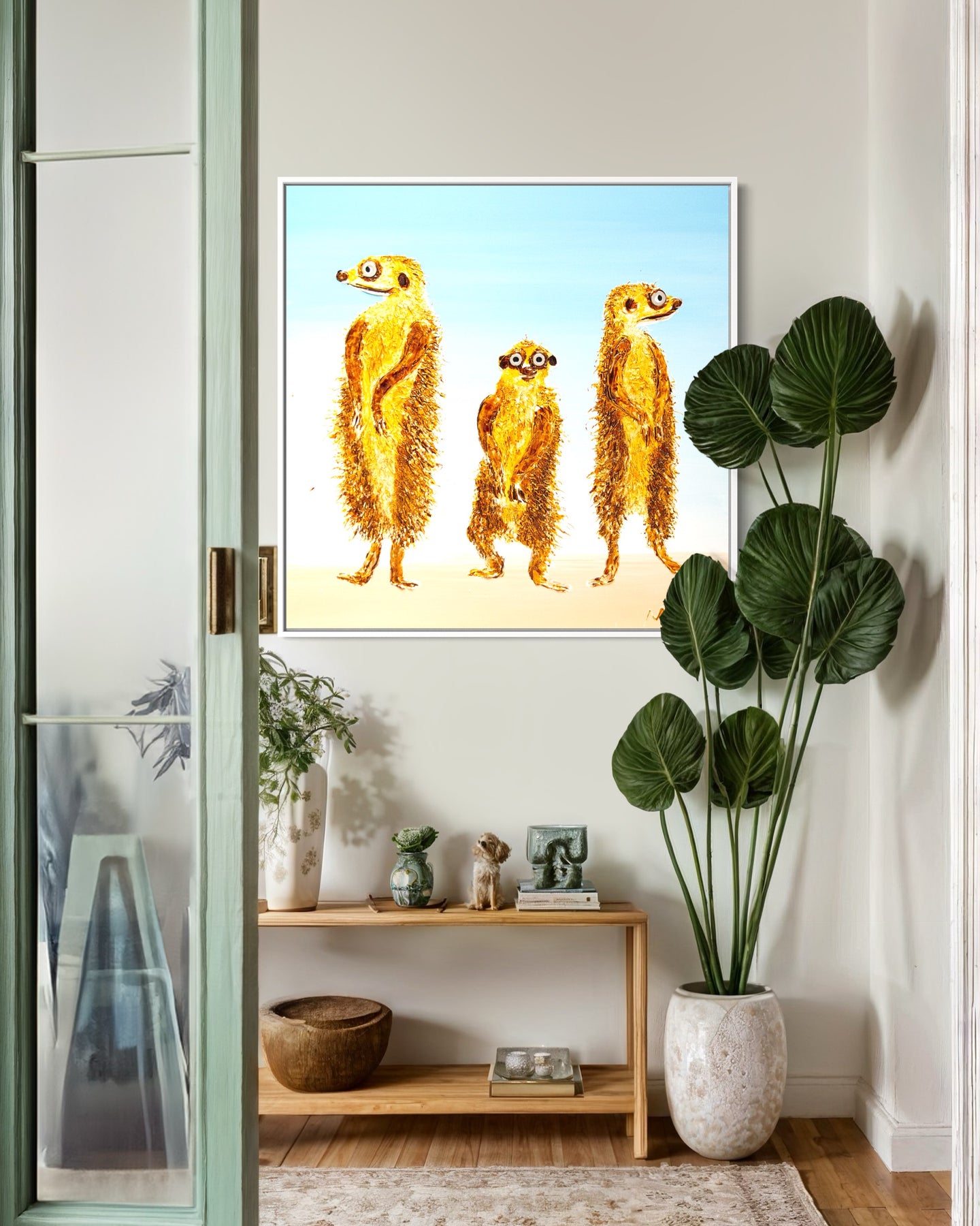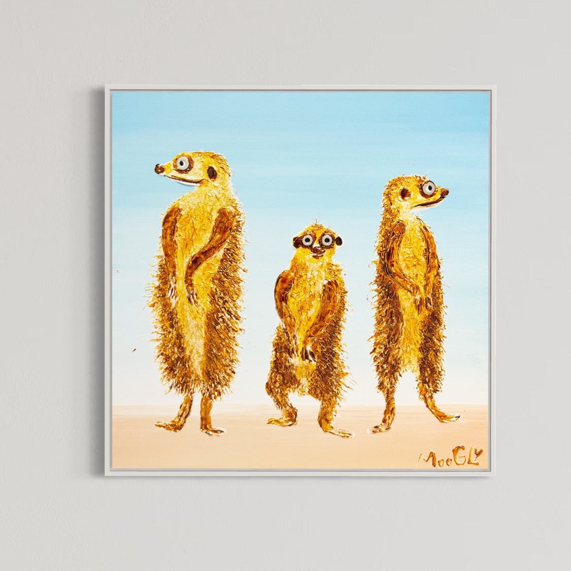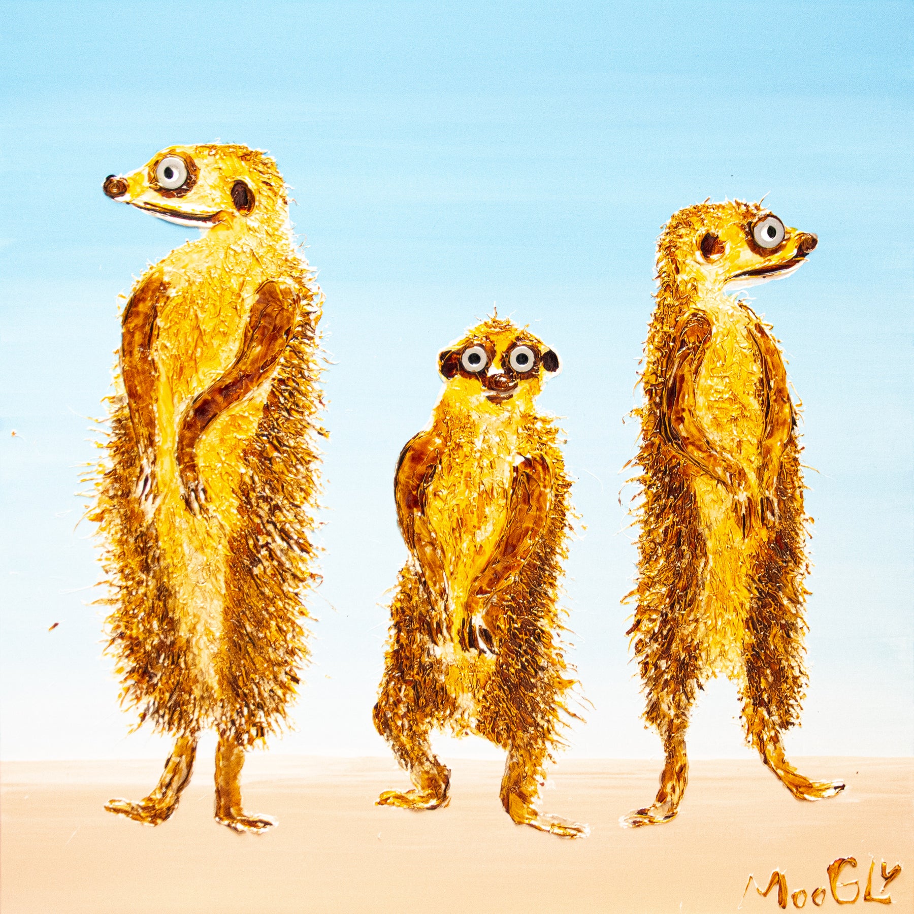 30” x 30” painting by French artist Moogly of three goldish-brown merecats. The two merecats on the sides look left and right while the smallest one in the middle looks straightforward with a light blue background. The merecats are made out of resin, giving them a textured and shiny finish. Their eyes are made out of washers that the artist has adhered to the canvas.