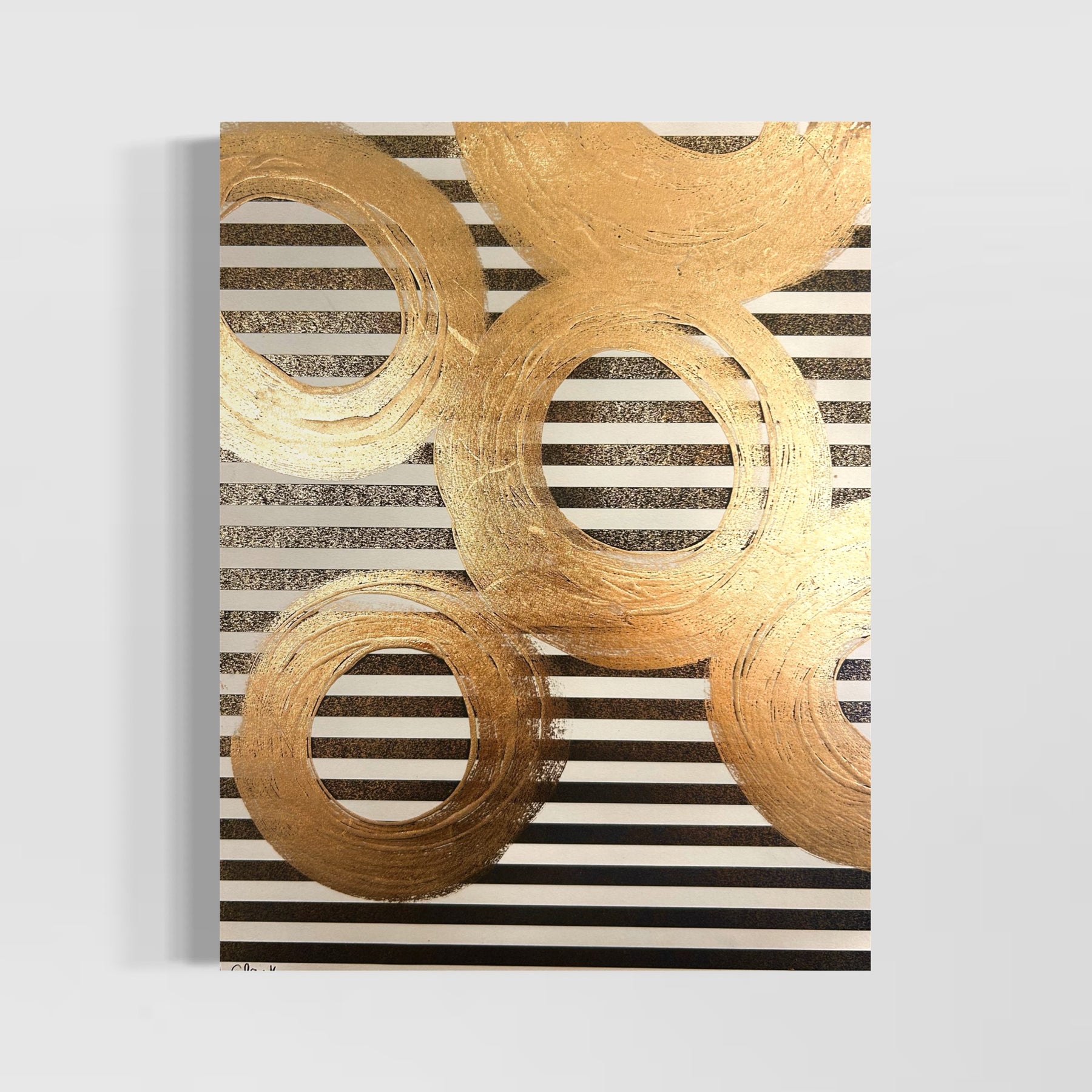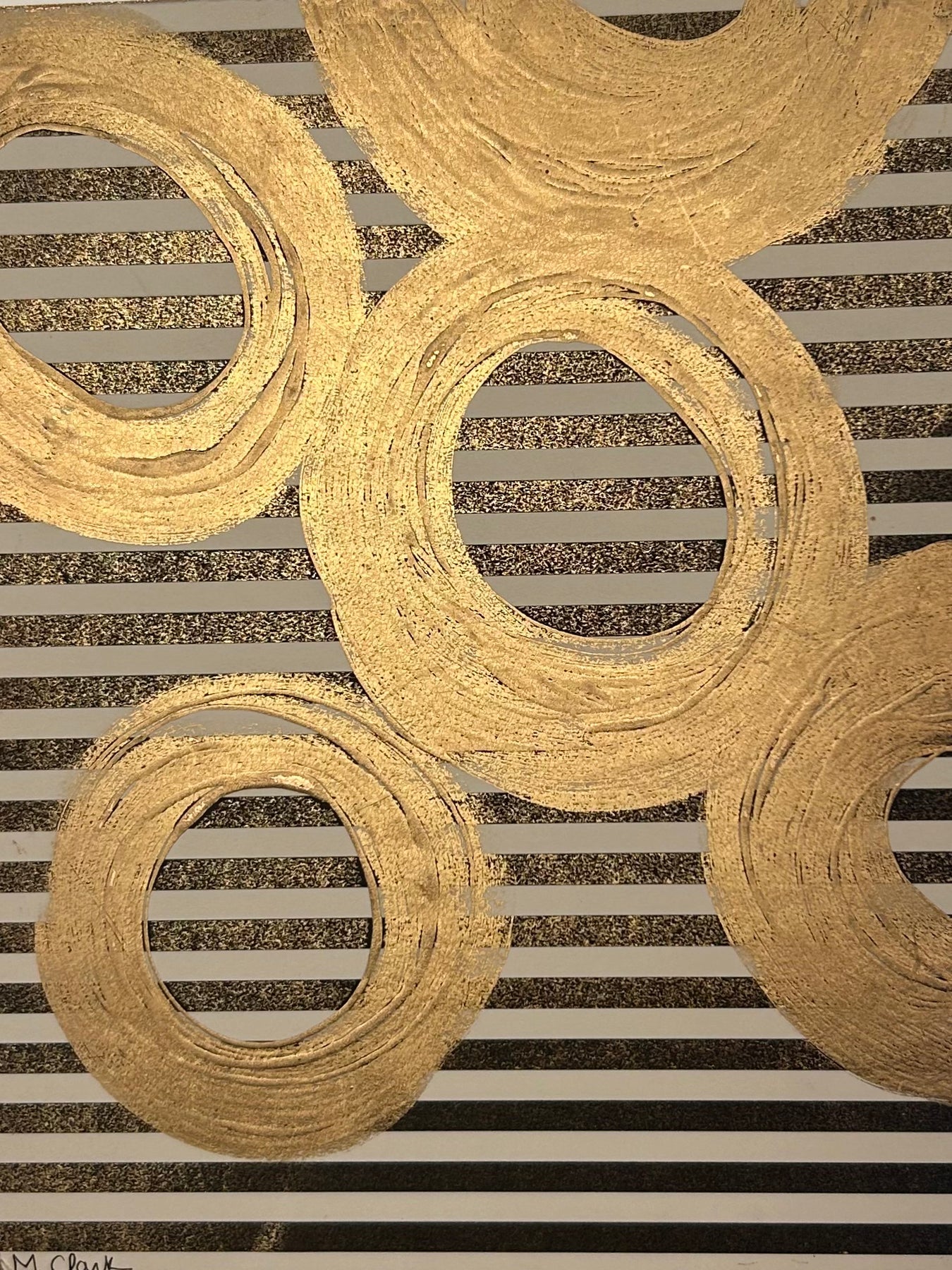 NYC based artist, M. Clark, creates light-reflecting works wherein the artist manipulates heat and pressure to fix metallic foil onto various surfaces -- there is no paint on her artworks, only gold, copper, or silver foil. Clark often uses a palette knife to help texturize her highly reflective, modern and minimalist works of art.