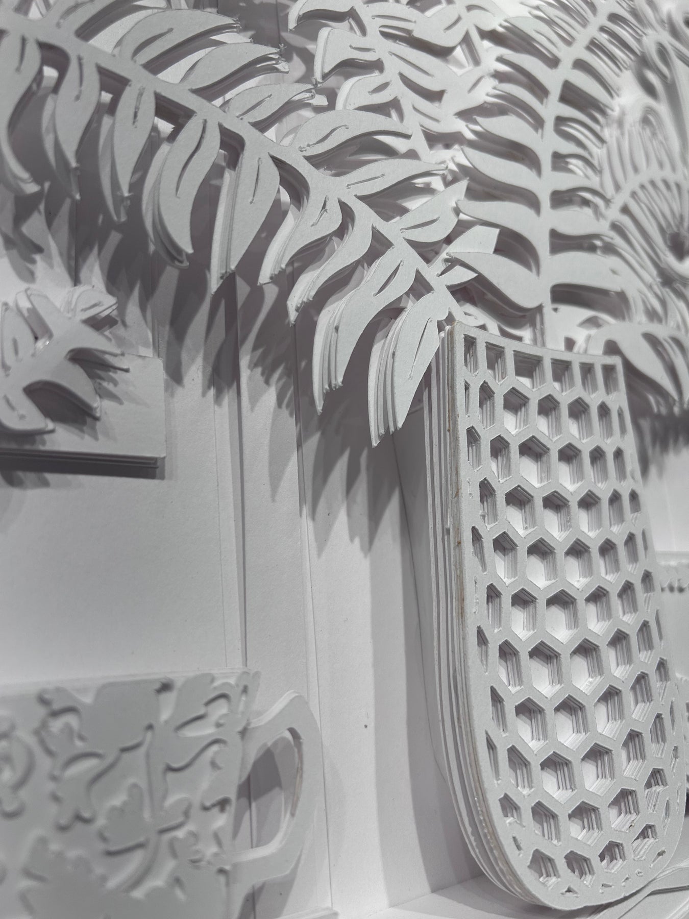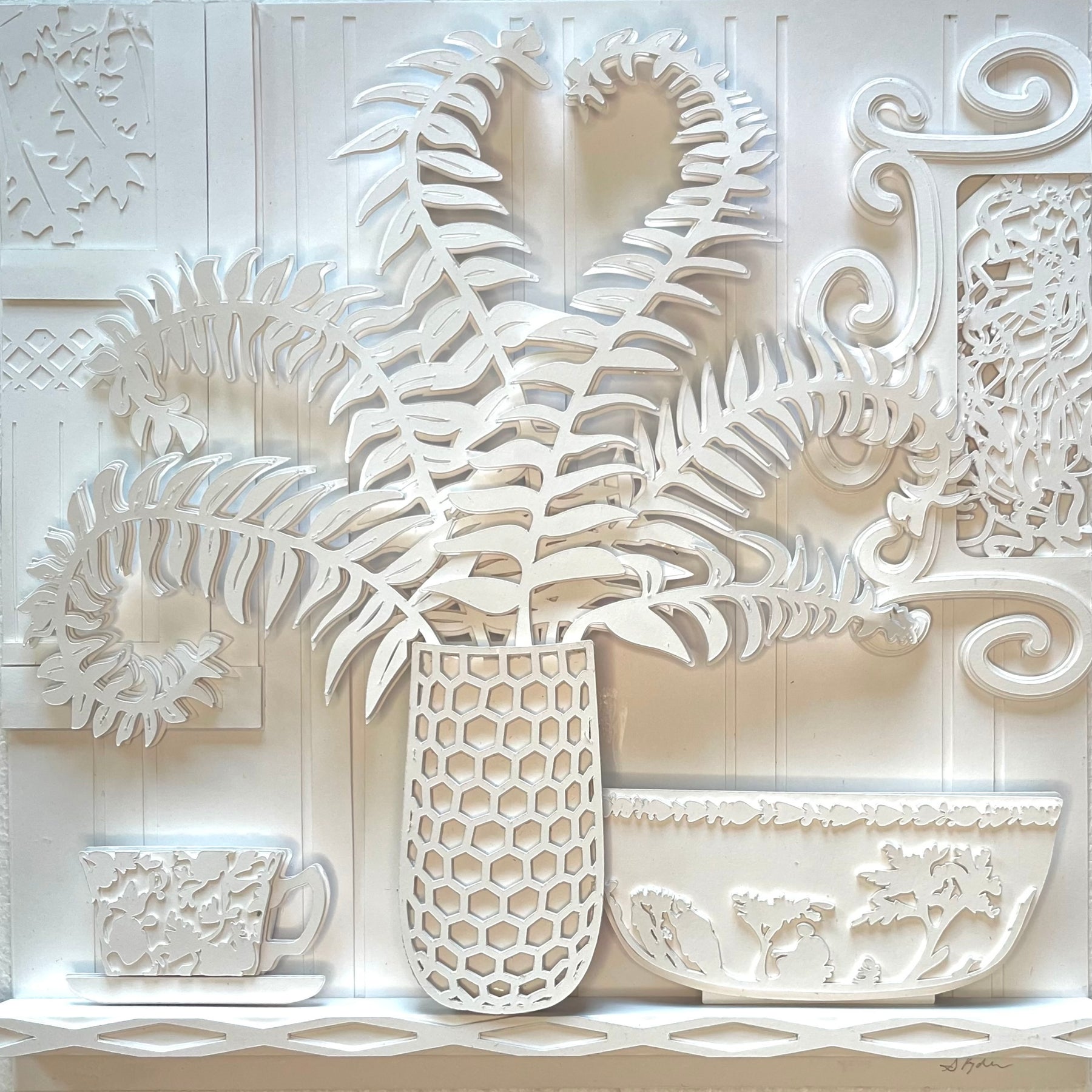 Susan Ryder's art is created by meticulously cutting and layering crisp white paper, distanced just a few millimeters apart. This technique allows for a full spectrum of colors to emerge solely from the shadows. The use of all white paper is important to allow the shadows to exist without distraction. The result is a dynamic sketch, rich with overlapping shadows that shift and change with the movement of light.