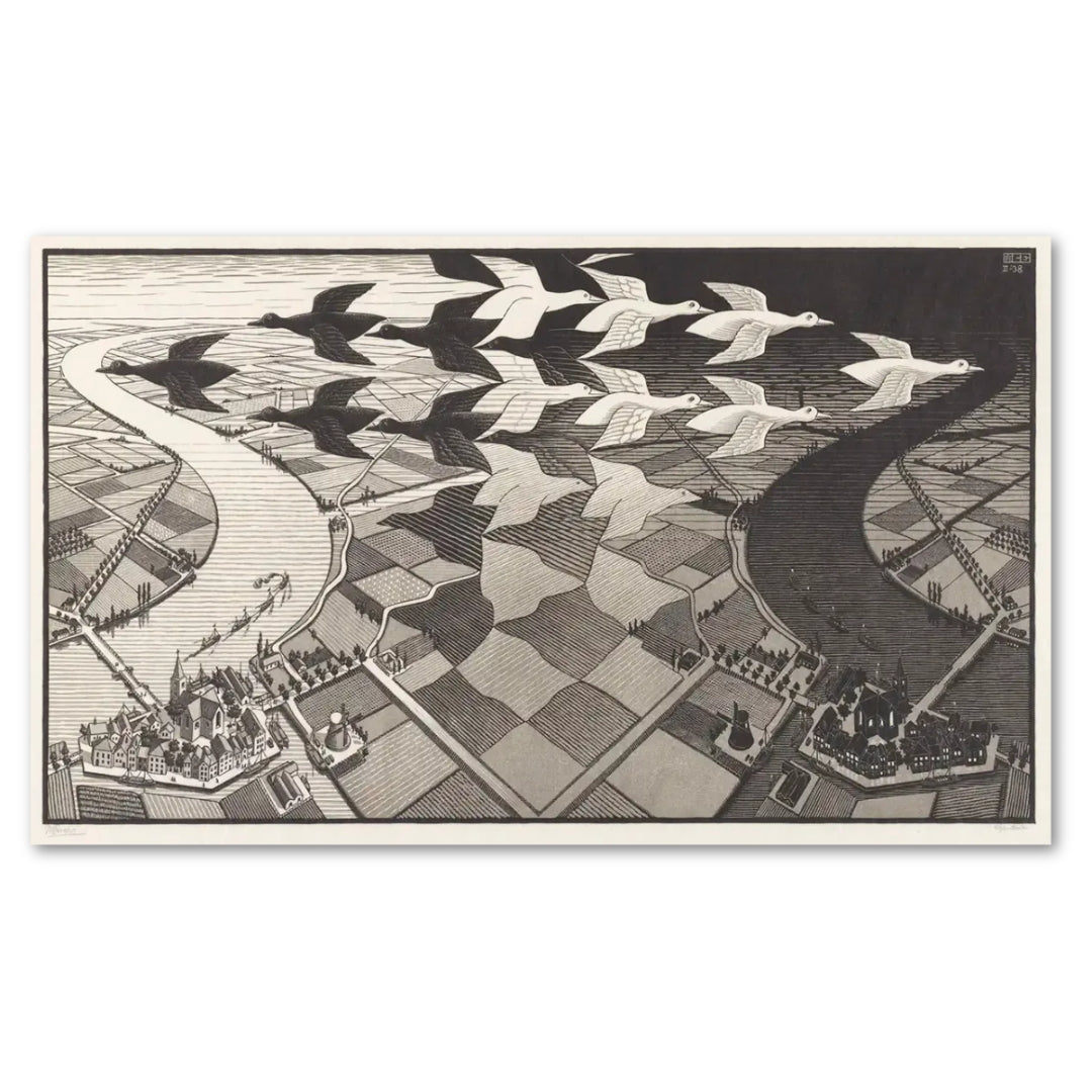 Maurits Cornelis Escher (1898-1972) is one of the world’s most famous graphic artists and is known for his iconic optical illusions. His lithographs, woodcuts, engravings, and drawings expressed a high level of technical expertise and meticulous attention to detail. Their puzzling depictions of tessellating staircases and interlocking spaces offered up visual conundrums to the viewer.