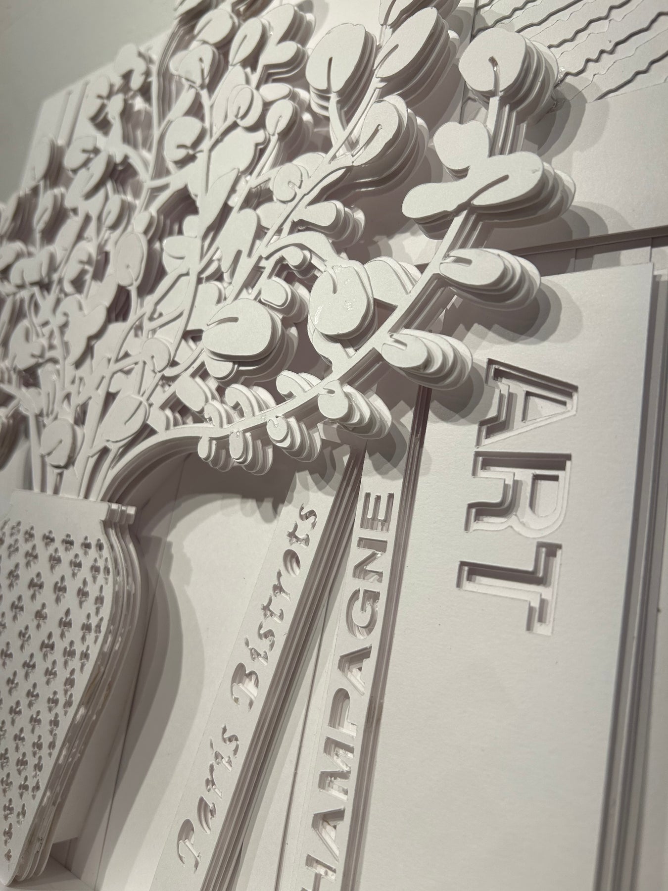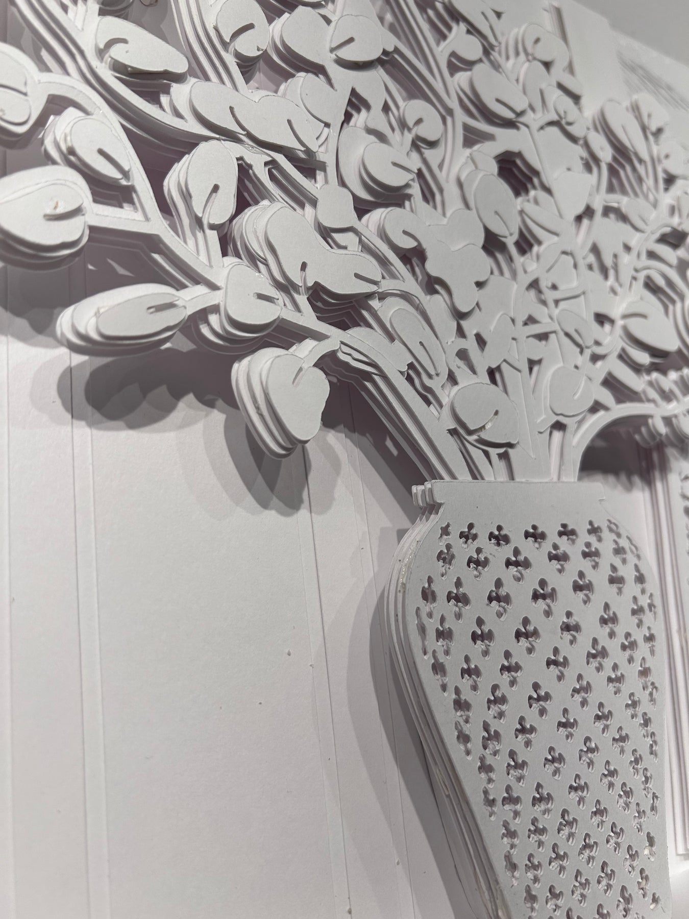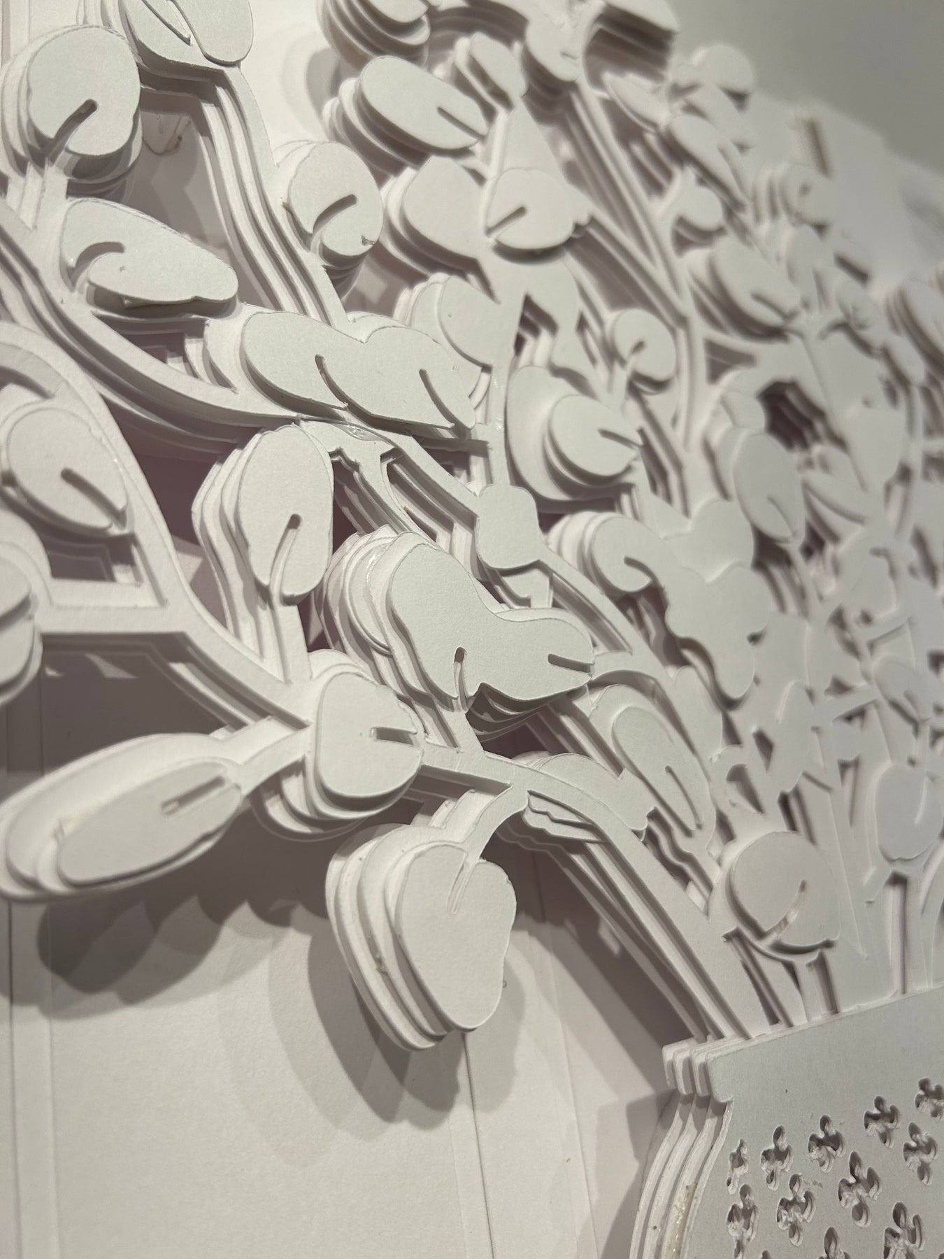 Susan Ryder's art is created by meticulously cutting and layering crisp white paper, distanced just a few millimeters apart. This technique allows for a full spectrum of colors to emerge solely from the shadows. The use of all white paper is important to allow the shadows to exist without distraction. The result is a dynamic sketch, rich with overlapping shadows that shift and change with the movement of light.