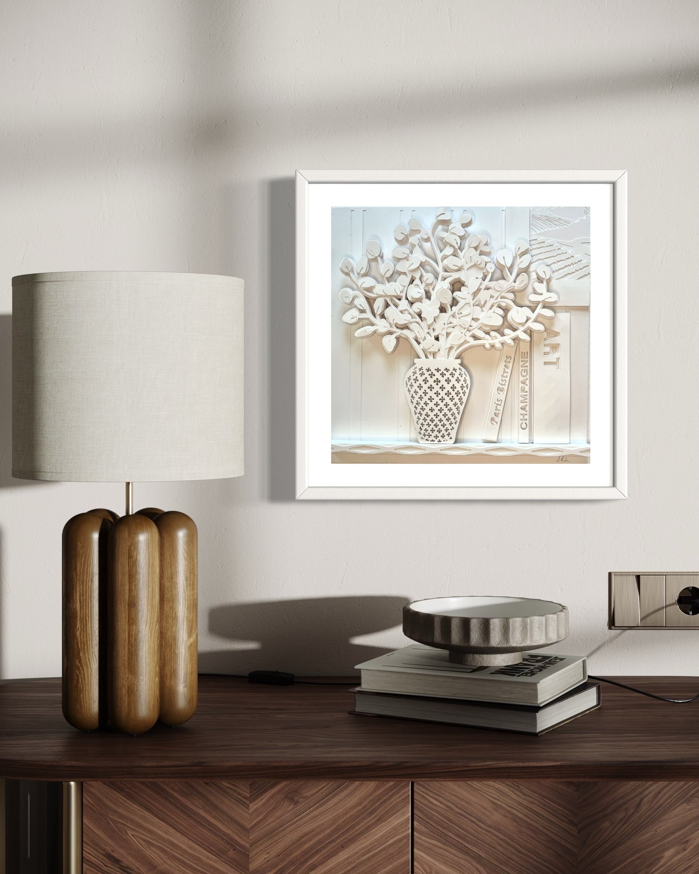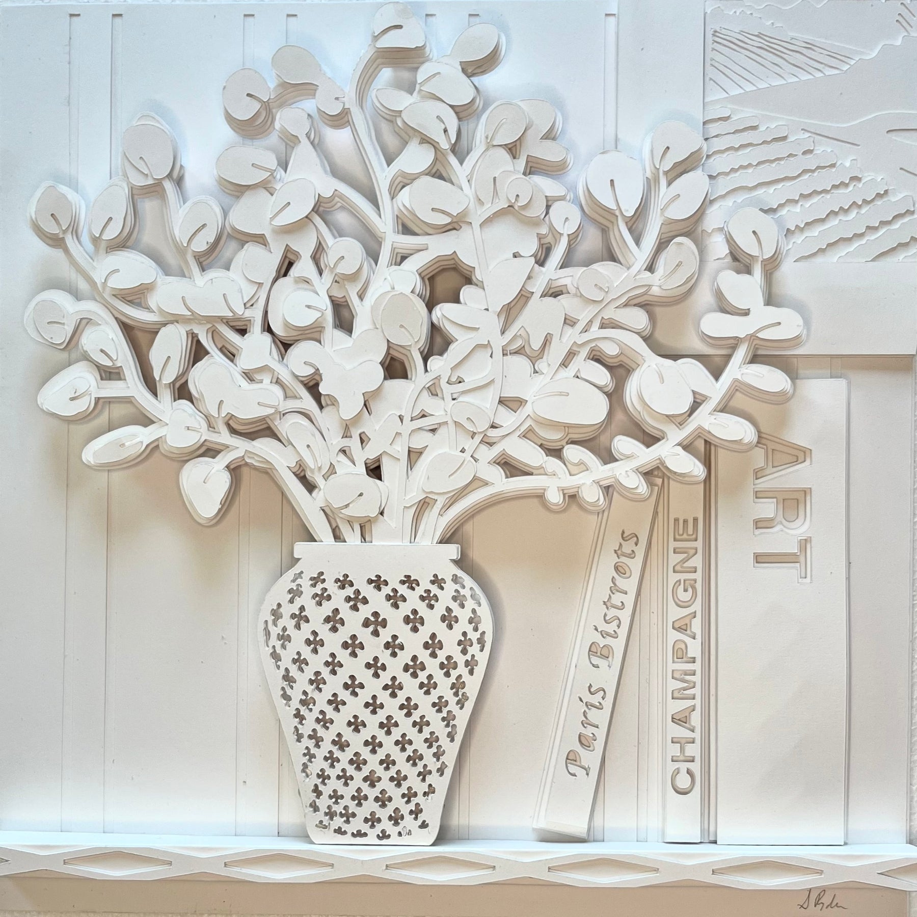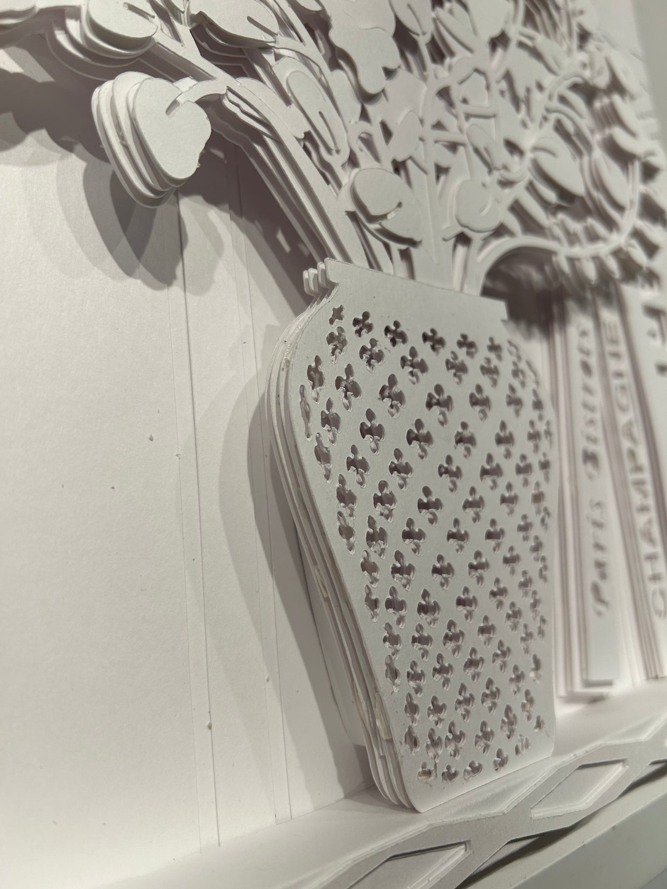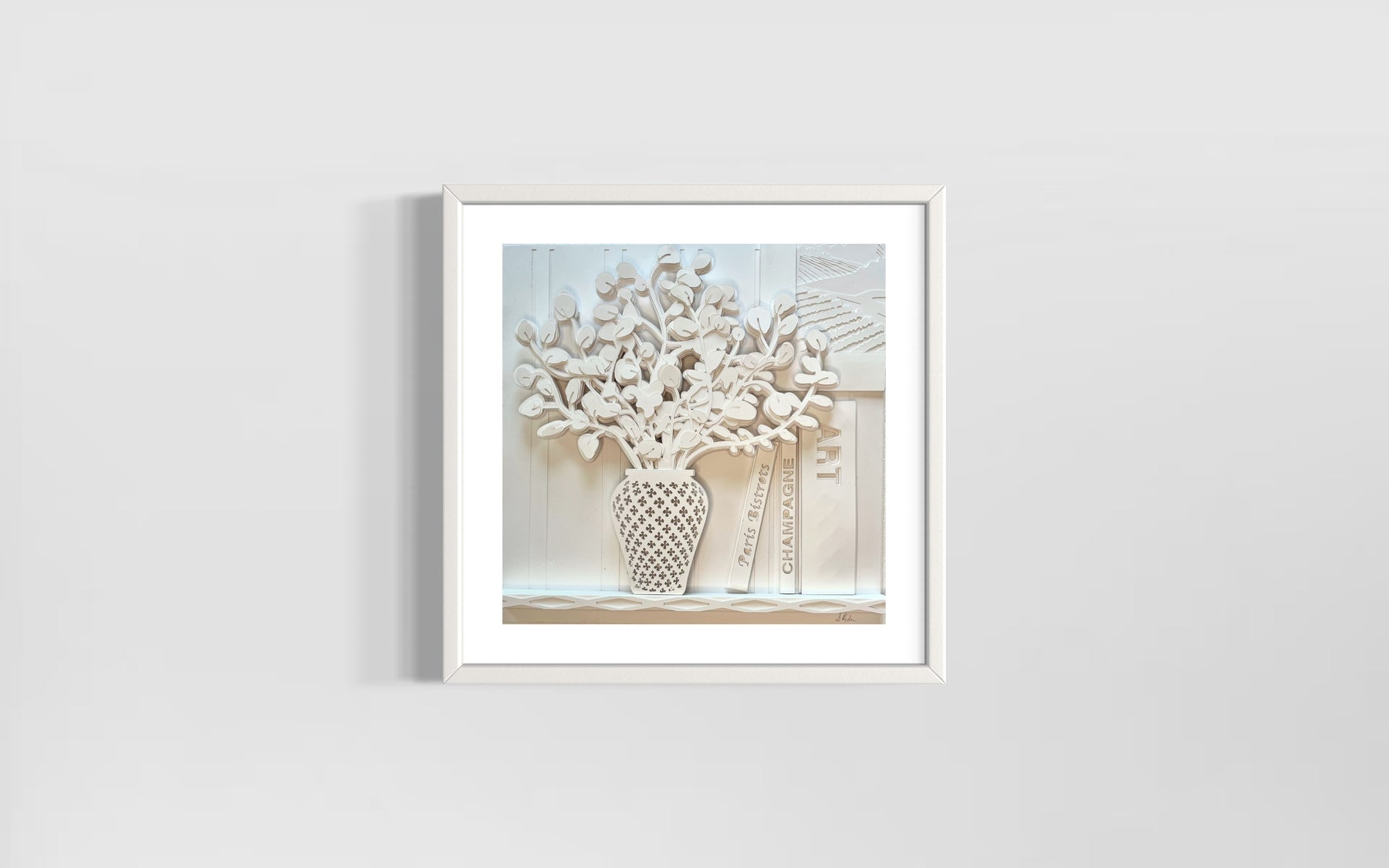 Susan Ryder's art is created by meticulously cutting and layering crisp white paper, distanced just a few millimeters apart. This technique allows for a full spectrum of colors to emerge solely from the shadows. The use of all white paper is important to allow the shadows to exist without distraction. The result is a dynamic sketch, rich with overlapping shadows that shift and change with the movement of light.