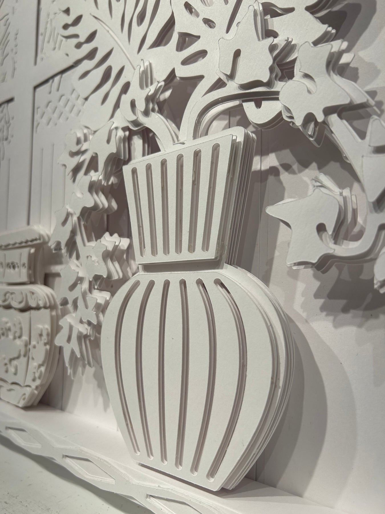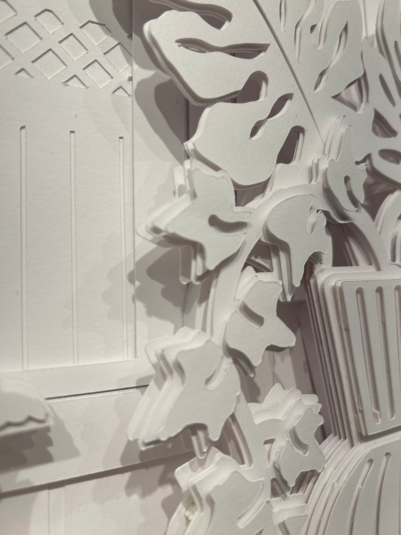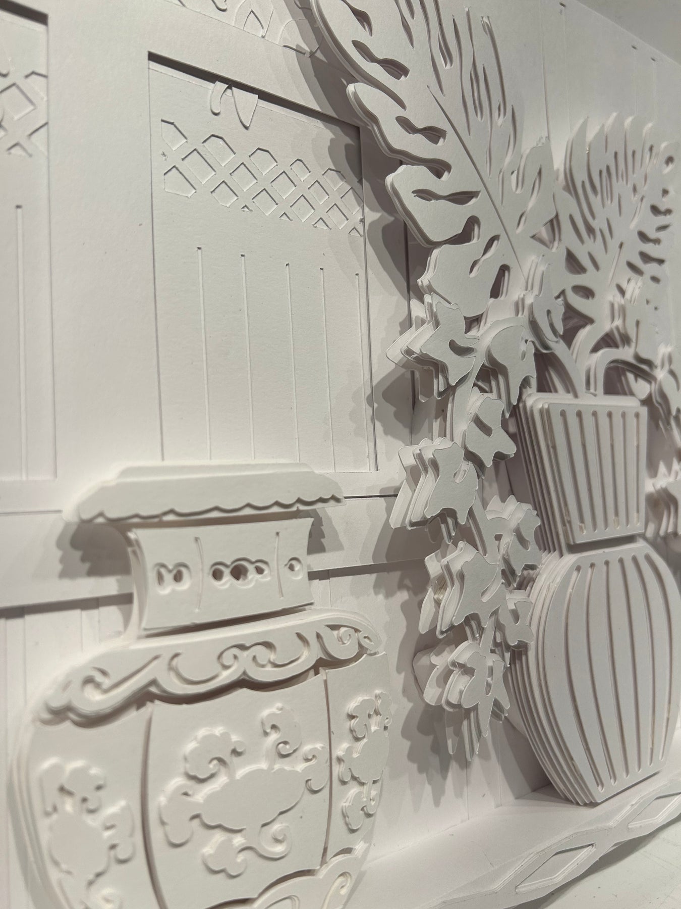 Susan Ryder's art is created by meticulously cutting and layering crisp white paper, distanced just a few millimeters apart. This technique allows for a full spectrum of colors to emerge solely from the shadows. The use of all white paper is important to allow the shadows to exist without distraction. The result is a dynamic sketch, rich with overlapping shadows that shift and change with the movement of light.