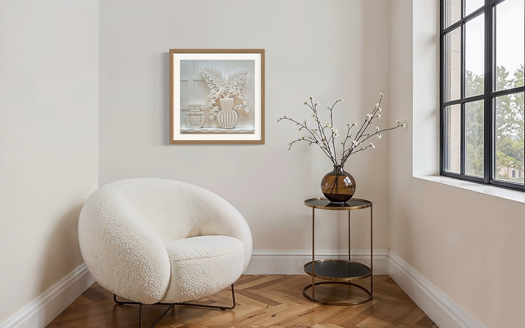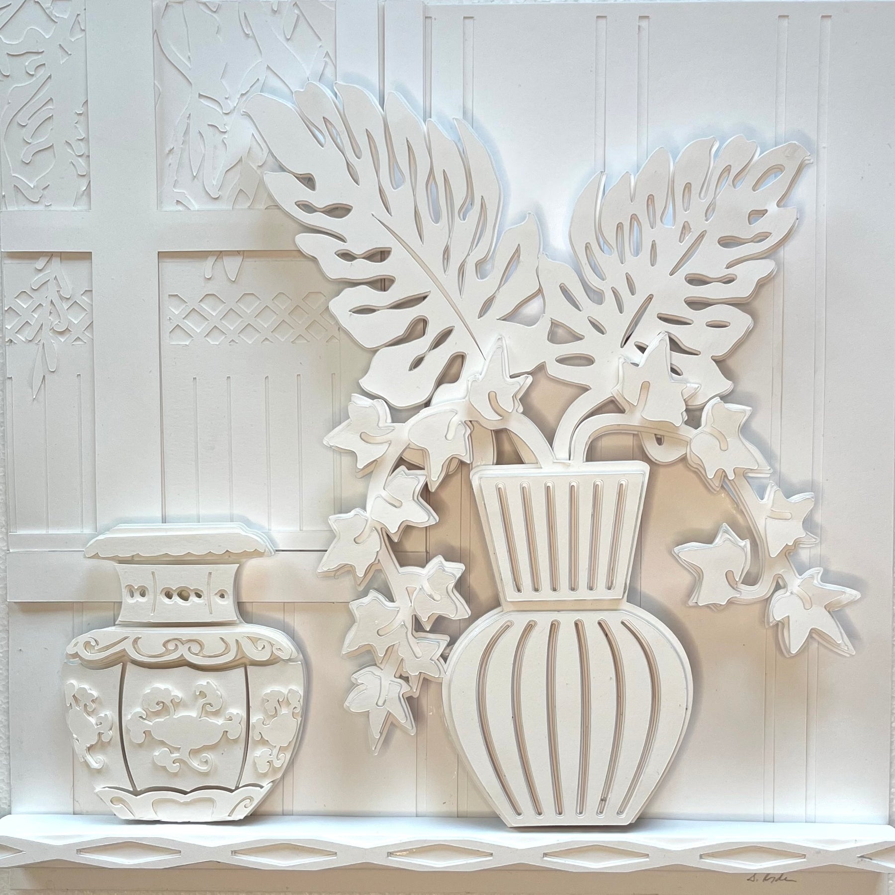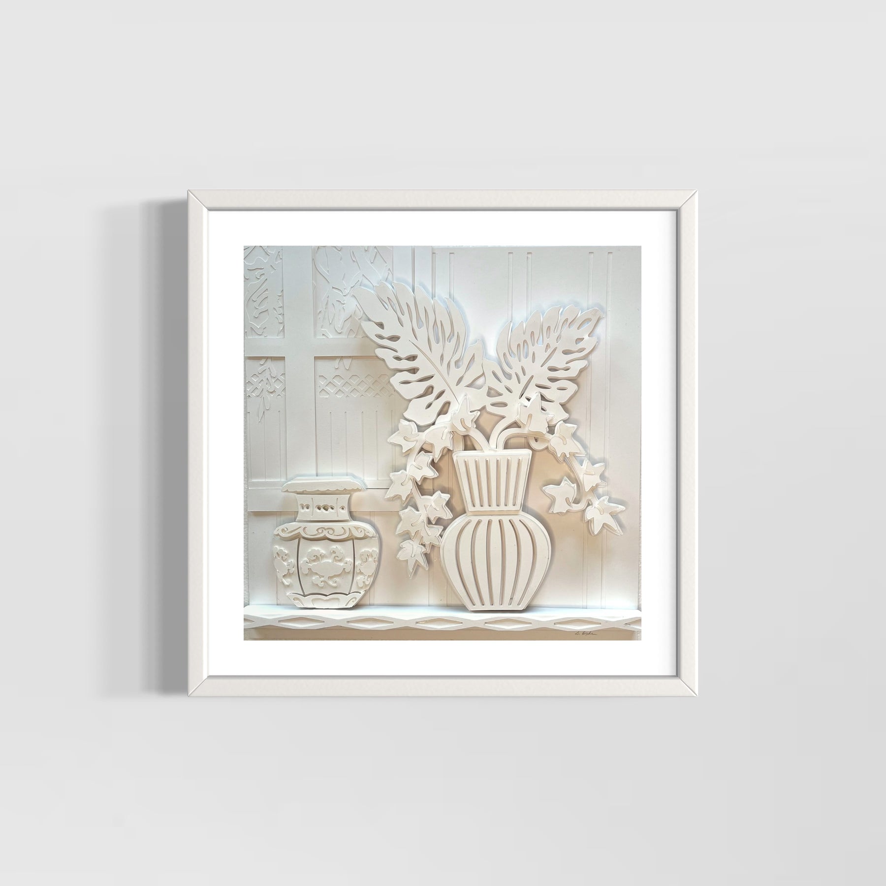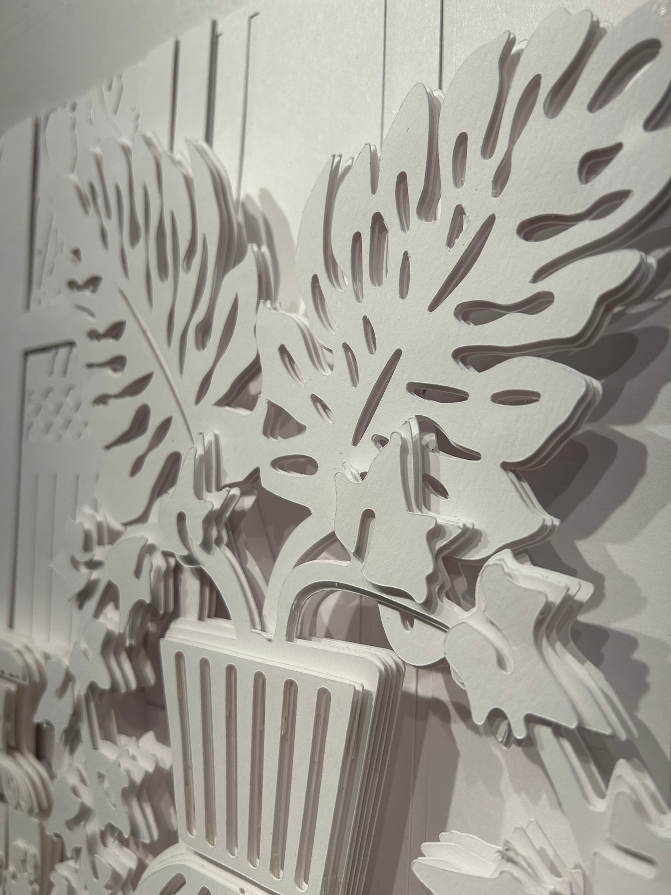 Susan Ryder's art is created by meticulously cutting and layering crisp white paper, distanced just a few millimeters apart. This technique allows for a full spectrum of colors to emerge solely from the shadows. The use of all white paper is important to allow the shadows to exist without distraction. The result is a dynamic sketch, rich with overlapping shadows that shift and change with the movement of light.