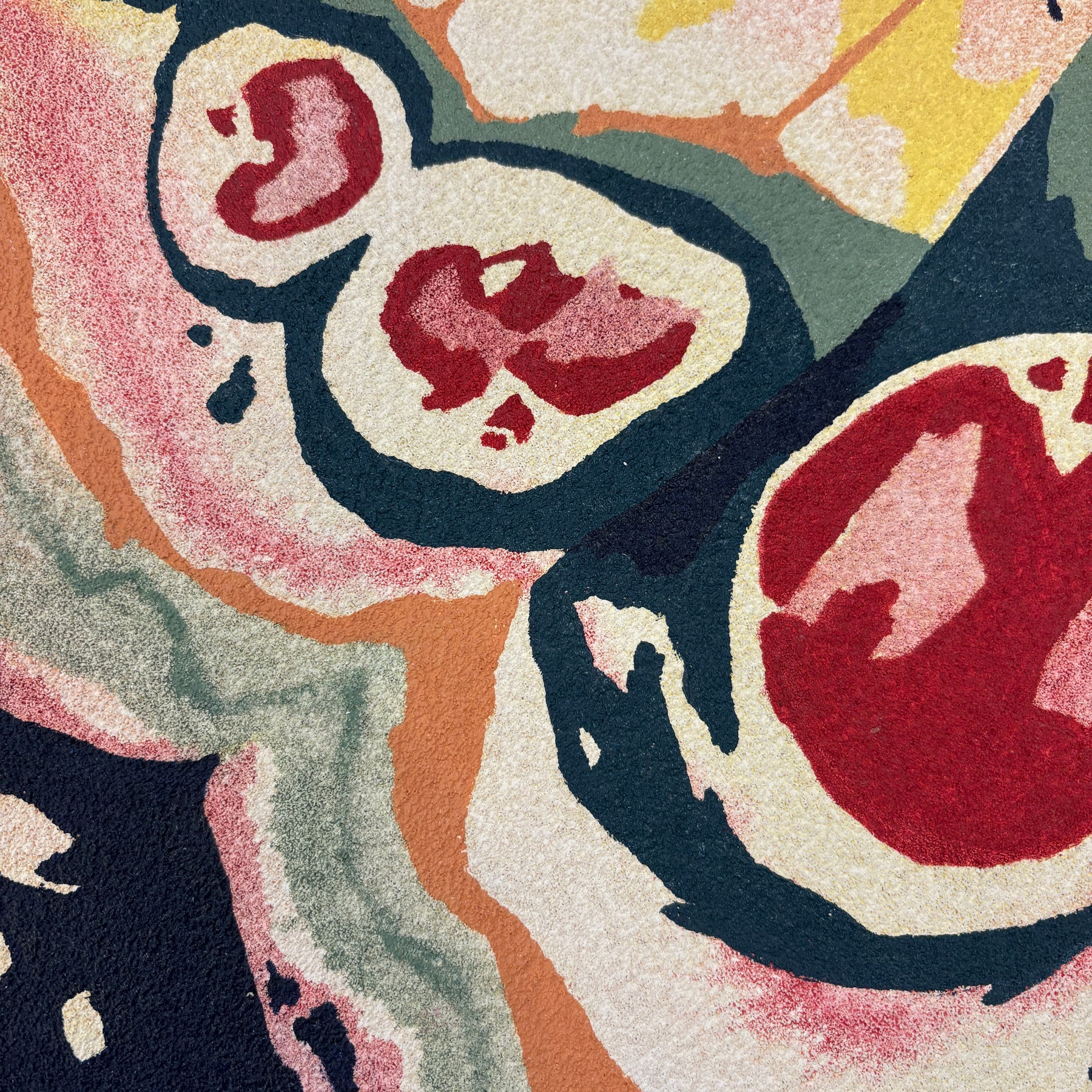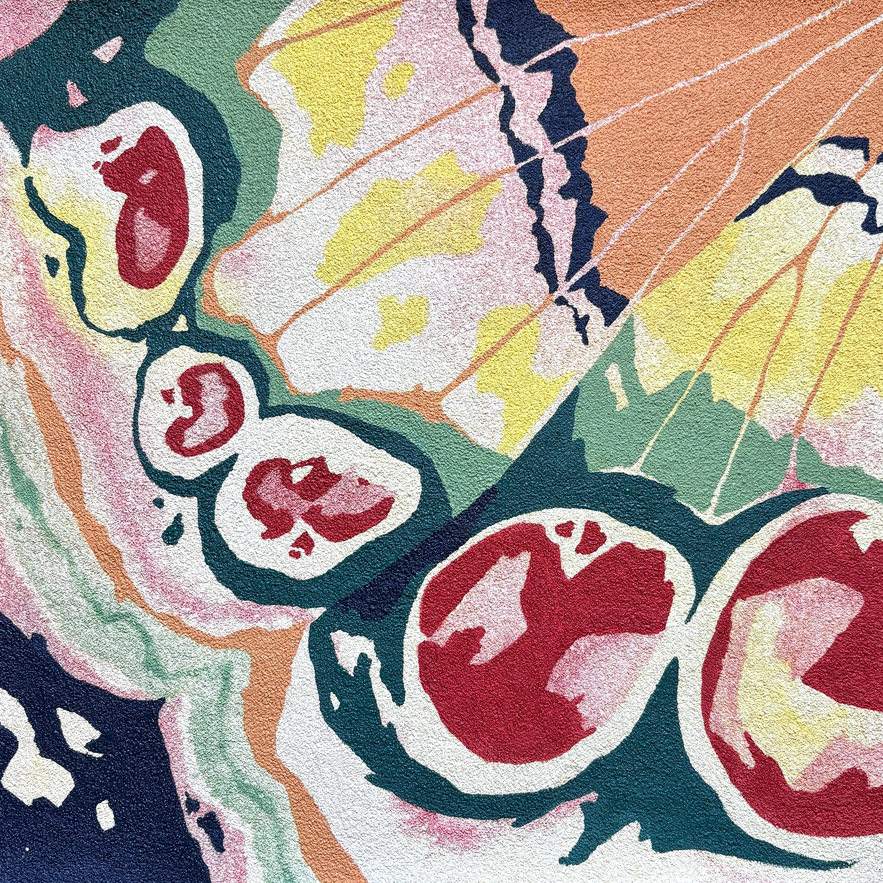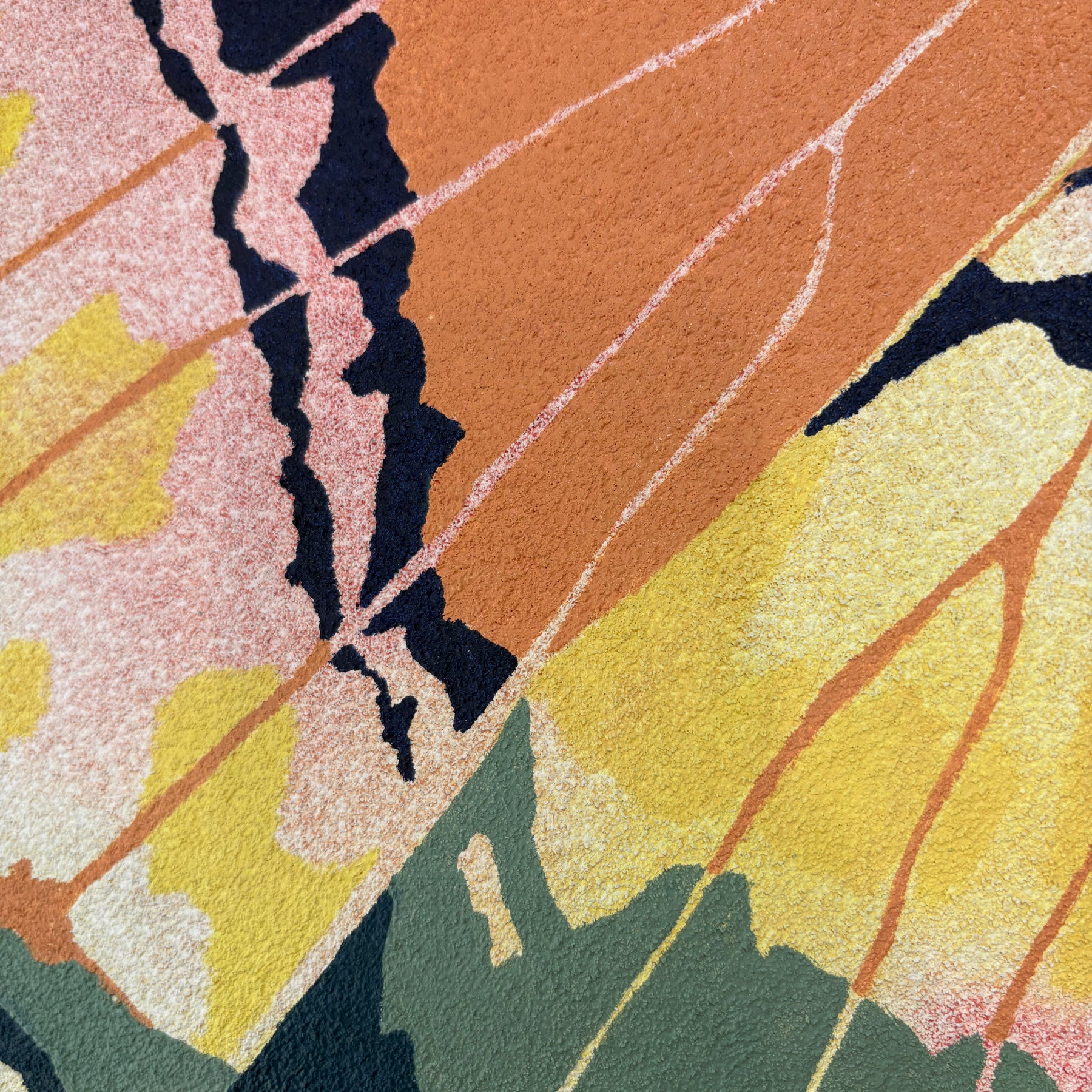 close up detail butterfly wing organic shapes design nature in red green yellow and orange gradient opaque oil paint on pumice