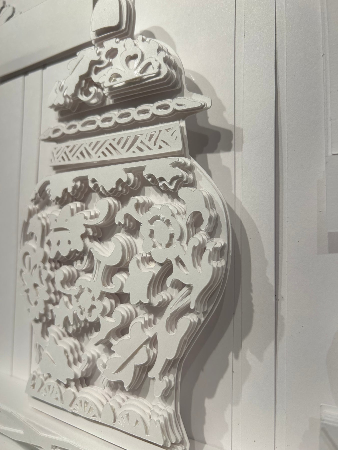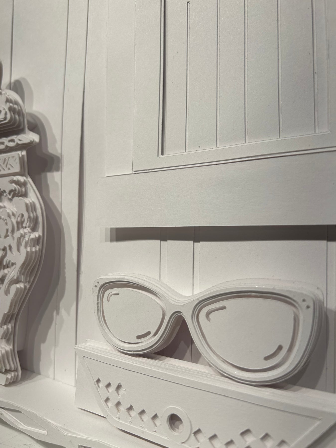 Susan Ryder's art is created by meticulously cutting and layering crisp white paper, distanced just a few millimeters apart. This technique allows for a full spectrum of colors to emerge solely from the shadows. The use of all white paper is important to allow the shadows to exist without distraction. The result is a dynamic sketch, rich with overlapping shadows that shift and change with the movement of light.