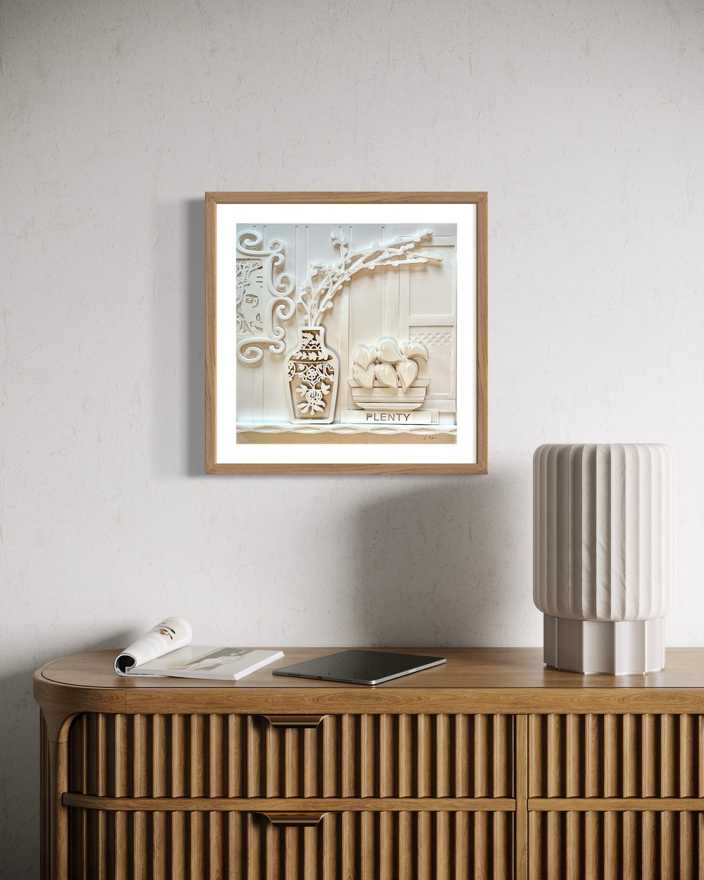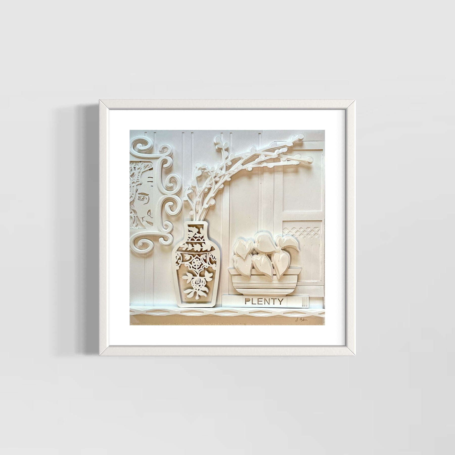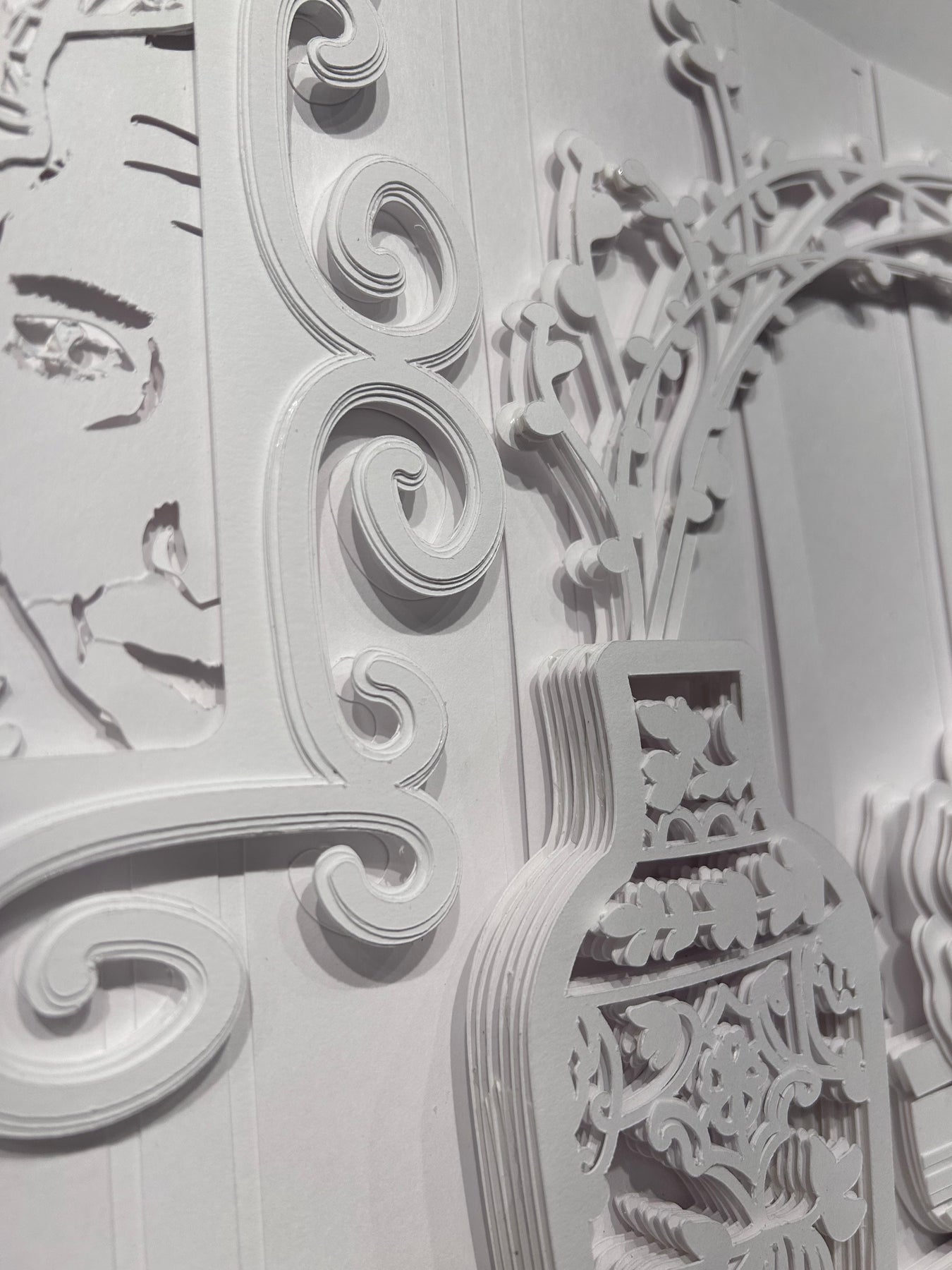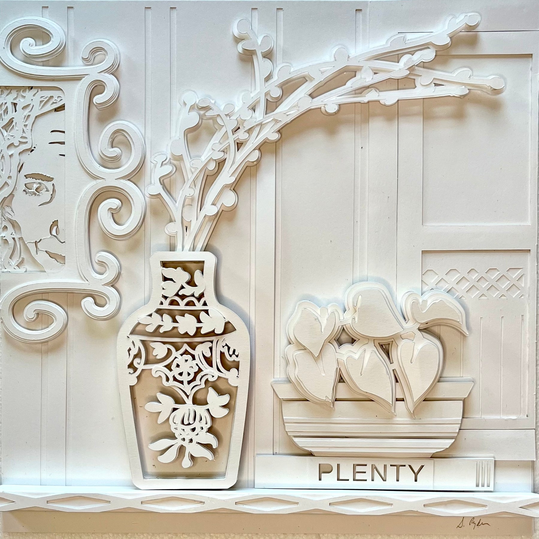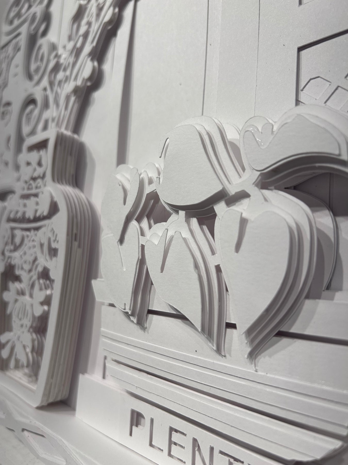 Susan Ryder's art is created by meticulously cutting and layering crisp white paper, distanced just a few millimeters apart. This technique allows for a full spectrum of colors to emerge solely from the shadows. The use of all white paper is important to allow the shadows to exist without distraction. The result is a dynamic sketch, rich with overlapping shadows that shift and change with the movement of light.
