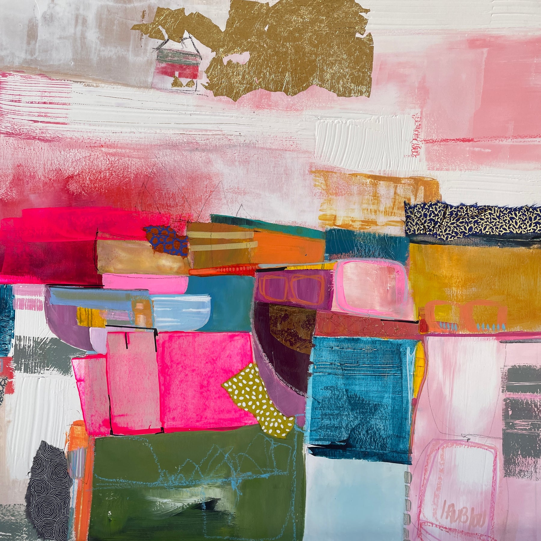 abstract geometric collage of square and semi circle shapes in fabric graphite acrylic paint gold leaf foil in pink green blue stacked and overlapping on pink and white background