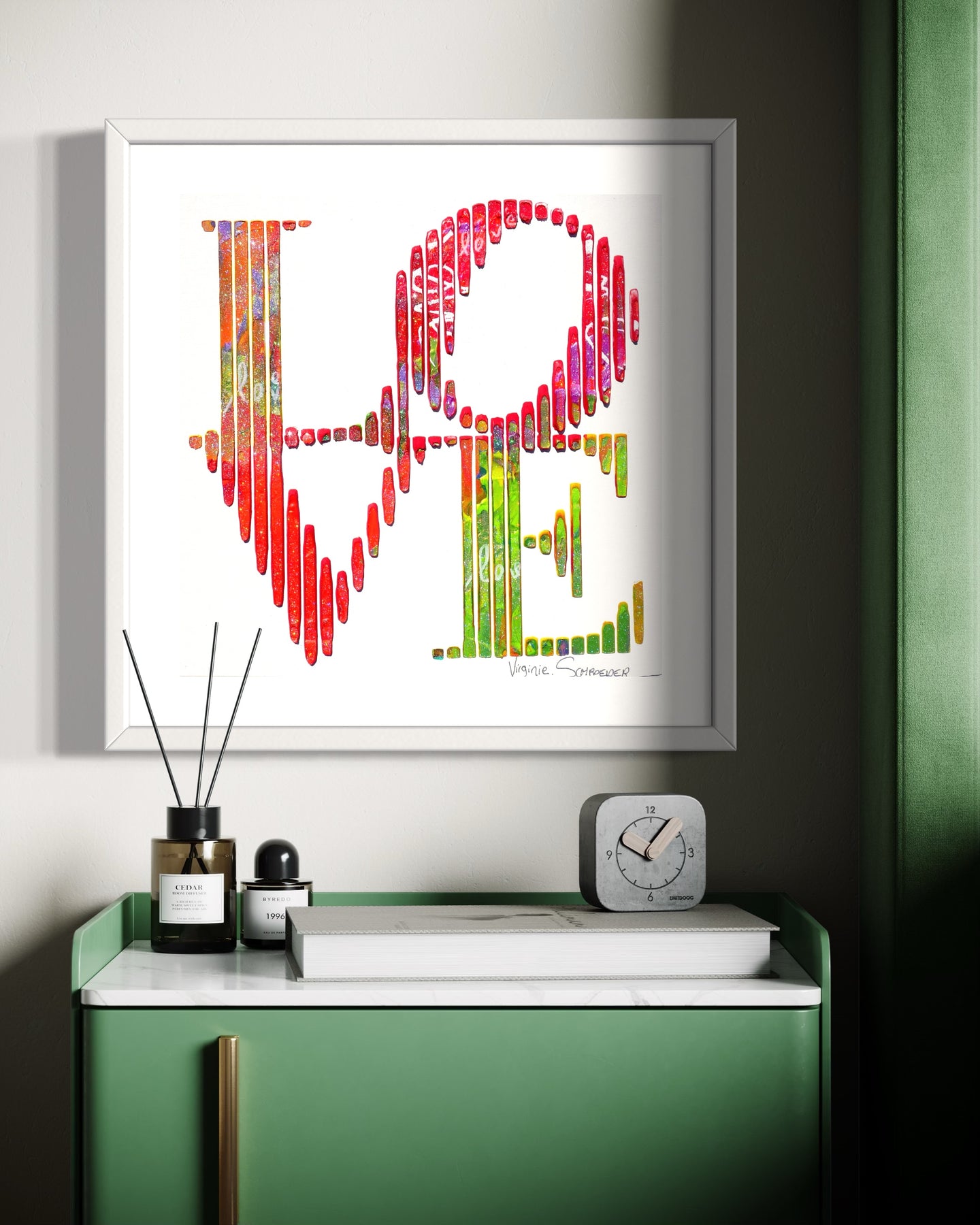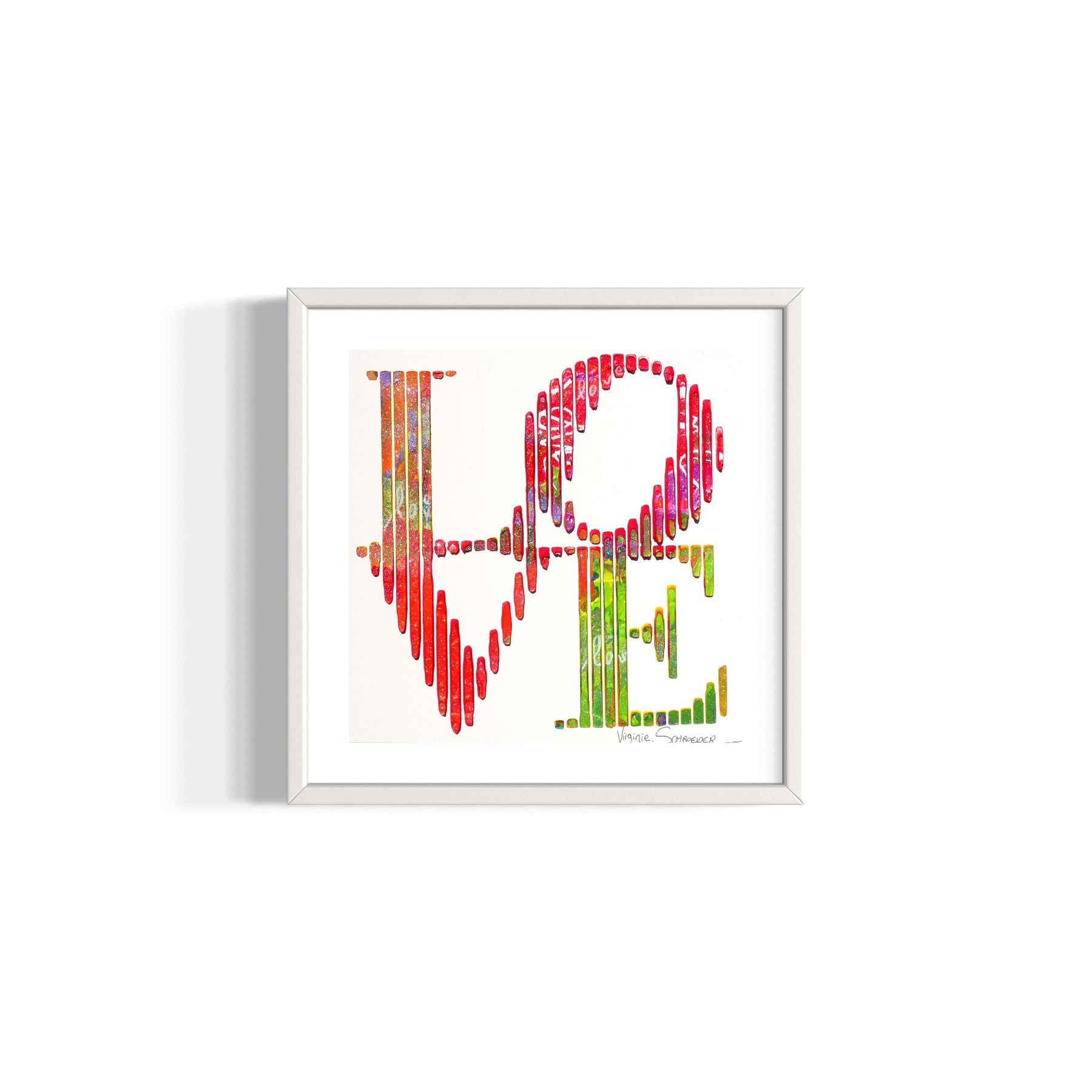 14"x14" acrylic and oil paint on canvas board image of the word LOVE.