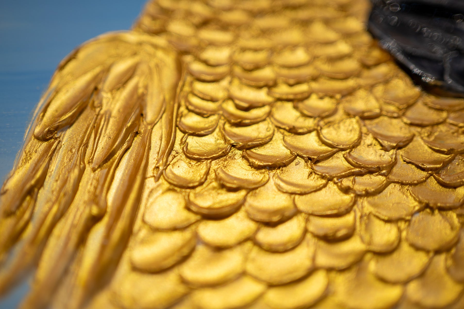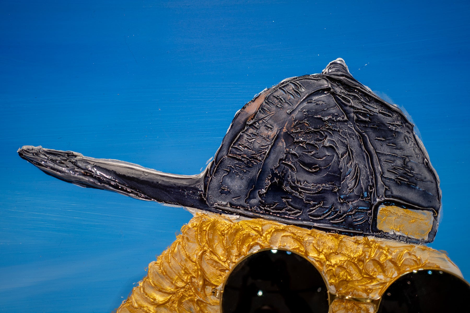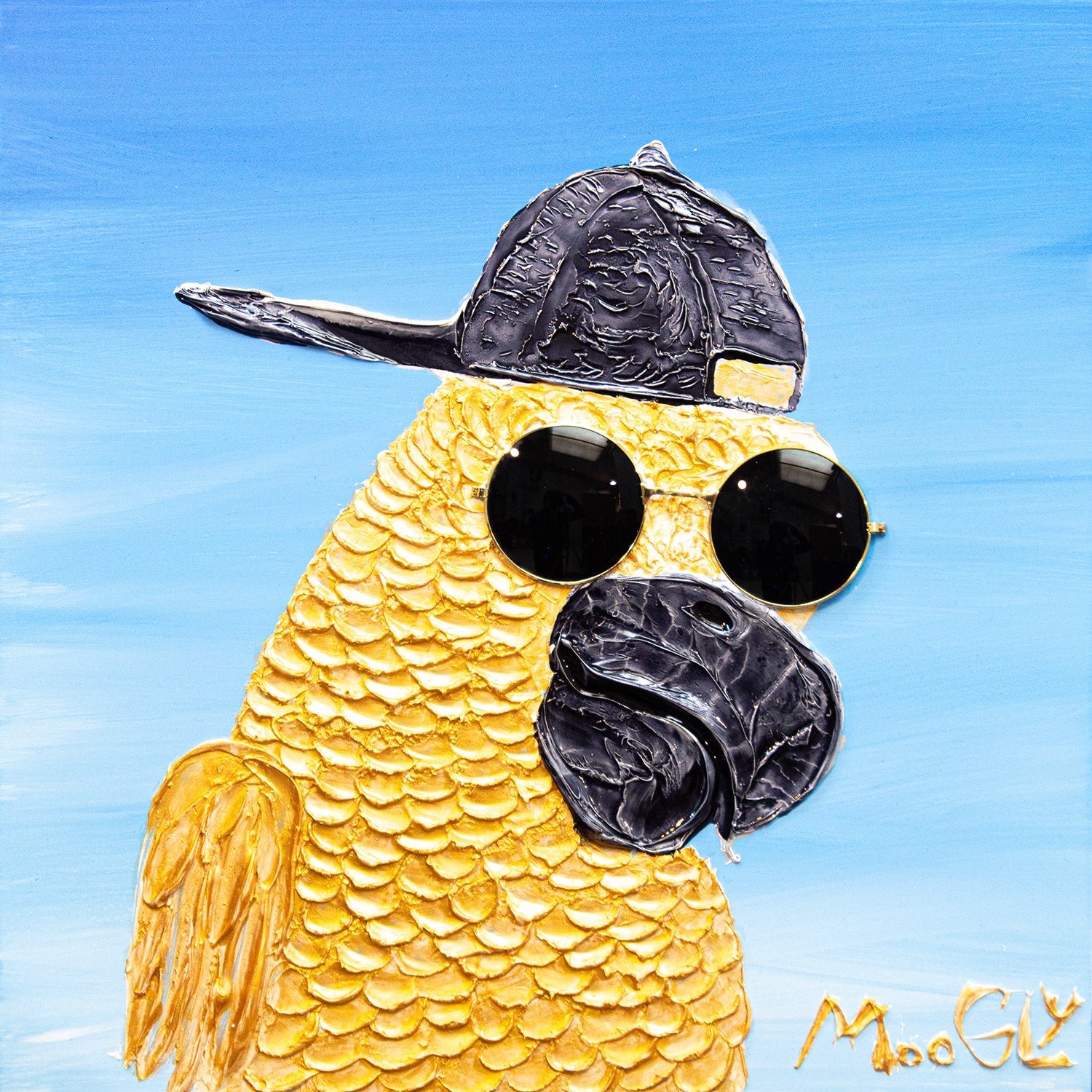 Acrylic 17" x 17" matted Success Story artwork by Moogly. Gold resin animate parrot wearing a backwards baseball cap and real sunglasses.