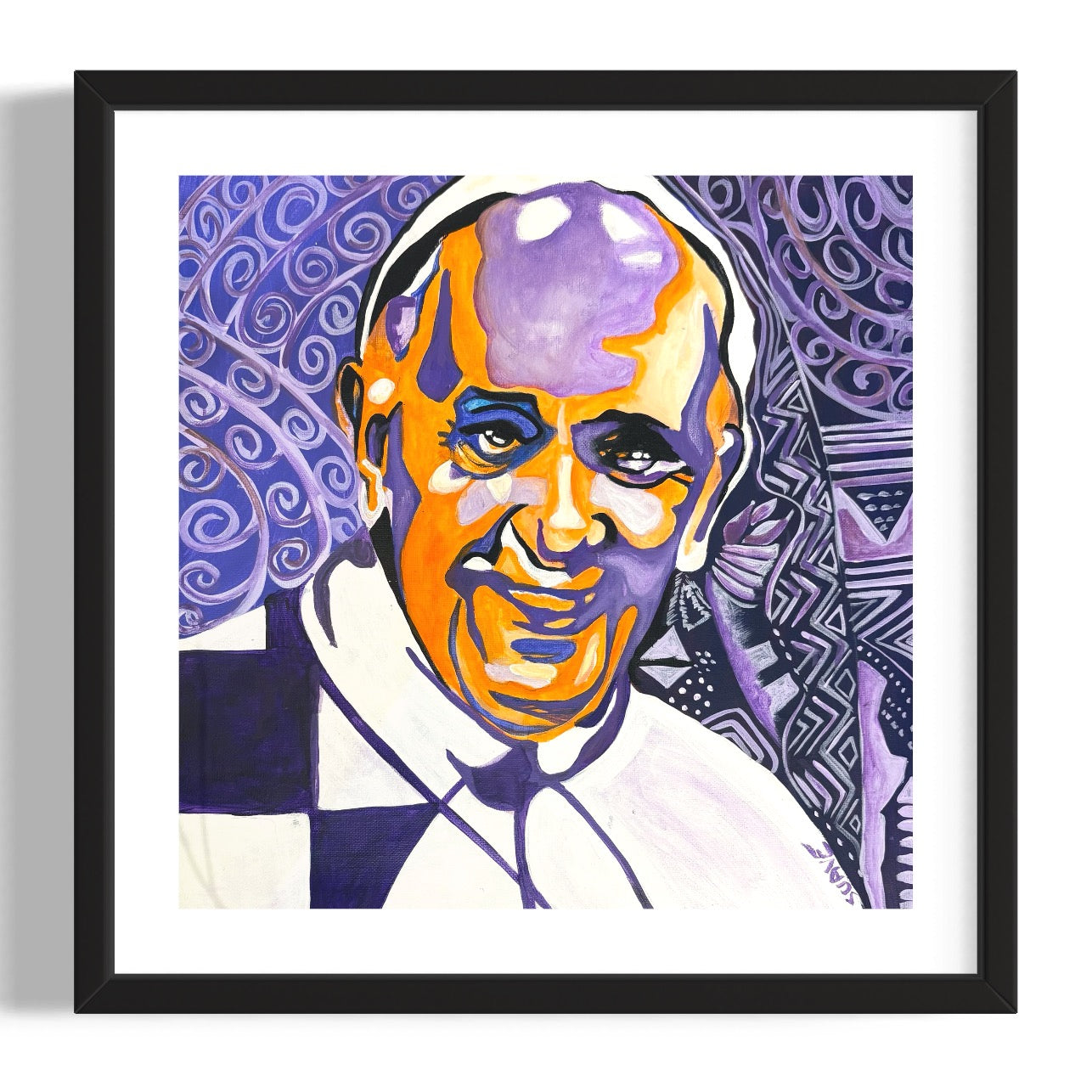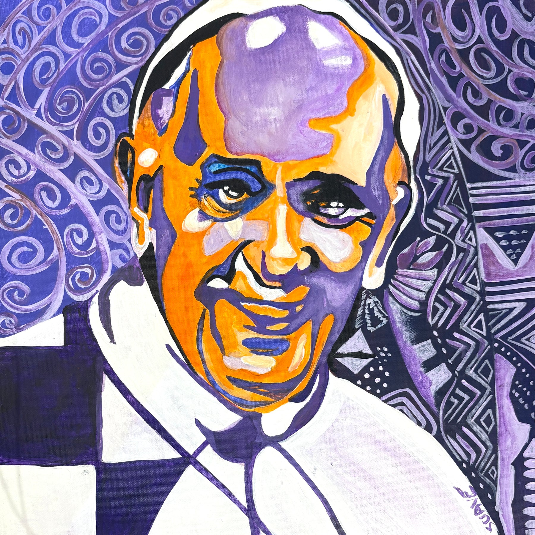 Pope Francis pop art figurative portrait in orange white and purple with decorative pattern swirls in background