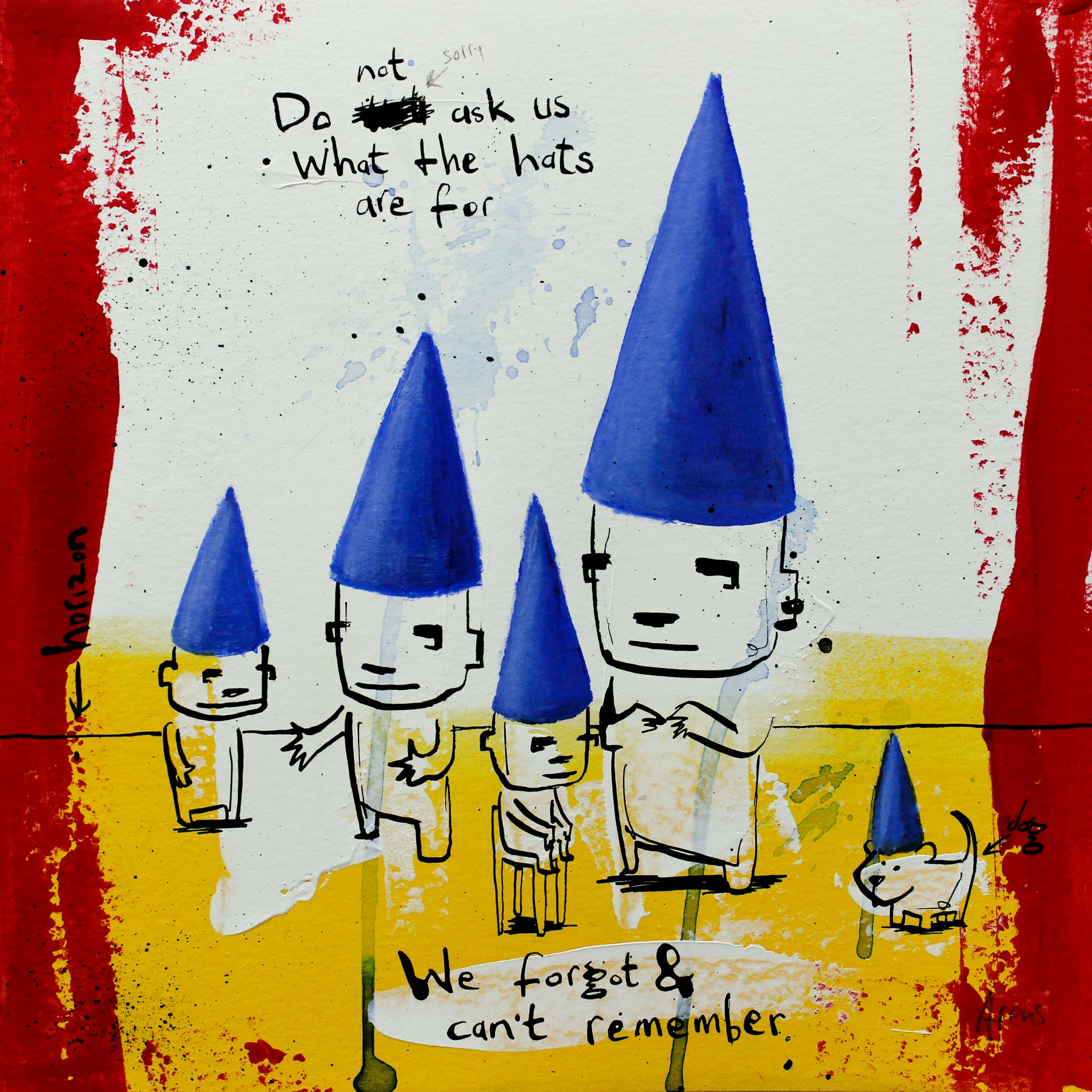 Concentrating on universally understood needs and emotions, Dutch artist Jan-Hein Arens is able to connect with every viewer and admirer of his works. Arens brings together humor and alienation through his paintings. The forefront is typically centered on a simplified figure and text that almost appears to be the thoughts of the figure. Often realistic drawings of body parts, common everyday objects or products are superimposed onto the foreground. Each piece is augmented with additional handwritten text detailing certain aspects of the piece in a comical tone. Paint splatters and rough brushstrokes fill out the remaining space in the paintings, allowing the figures and text to be the focus of each well-thought-out illustration.