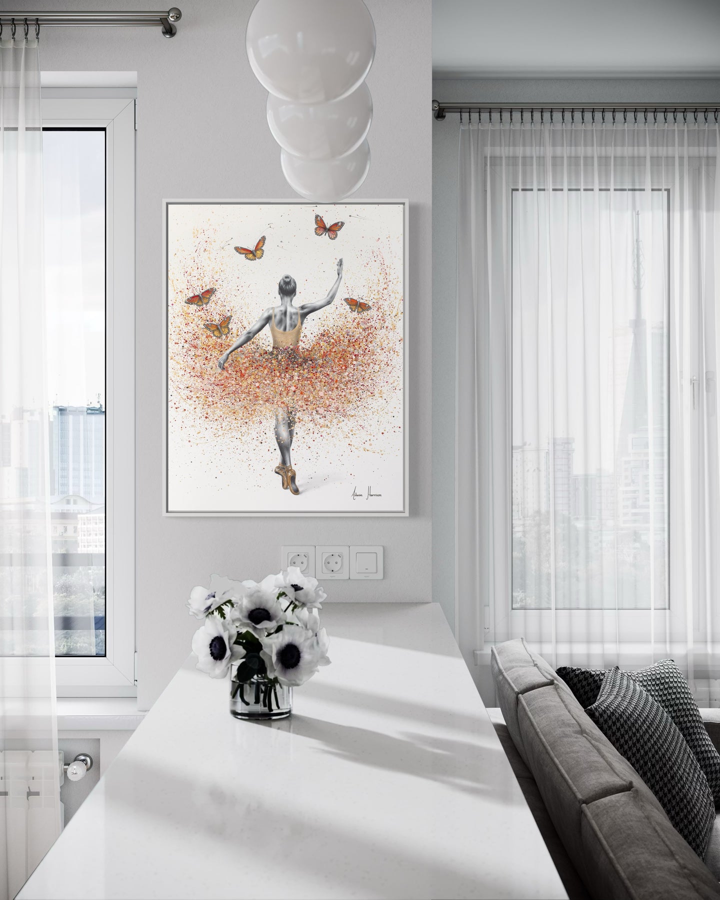 ballerina figure woman in black and white wearing orange dress with orange splatter paint tutu and orange monarch butterflies on white background