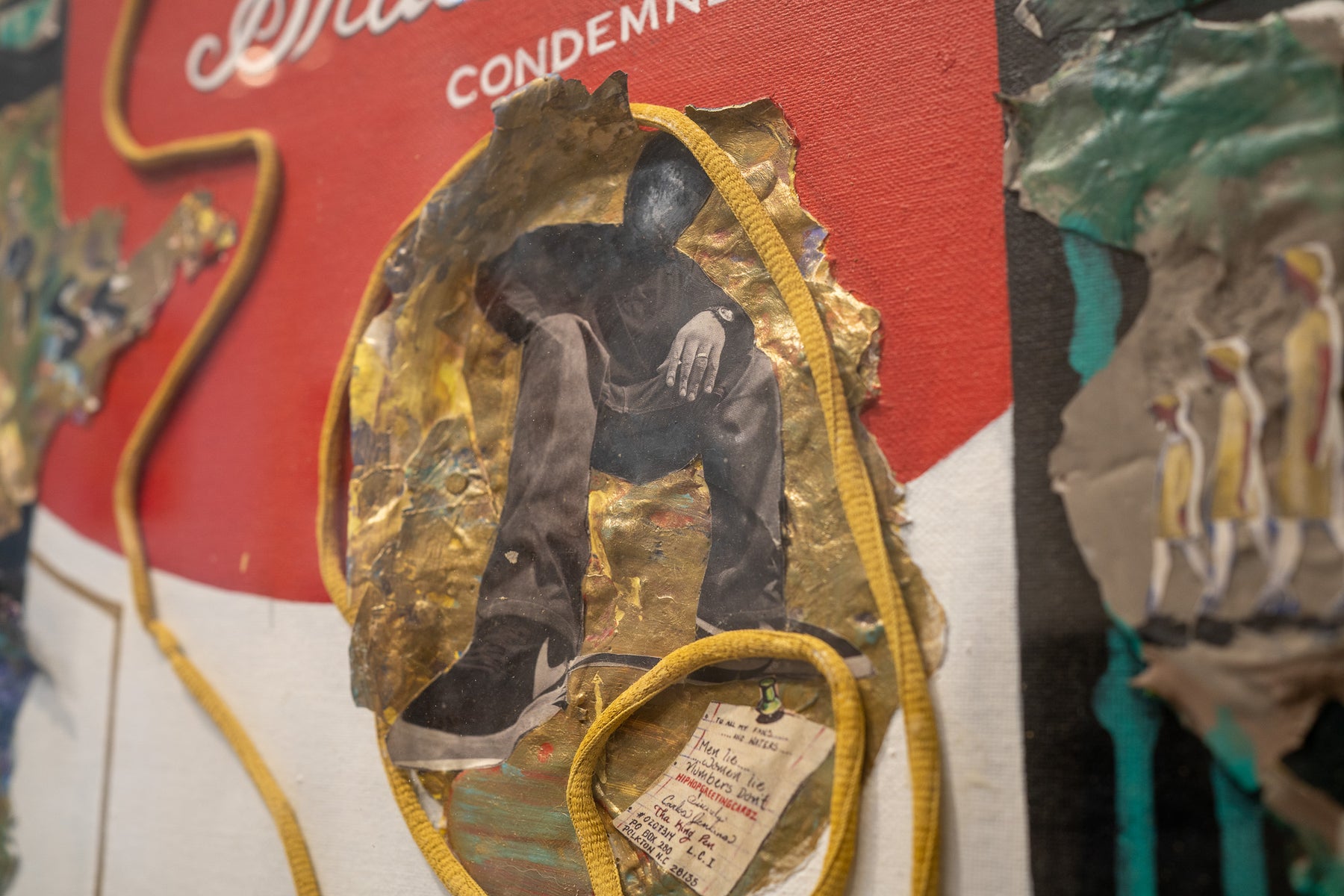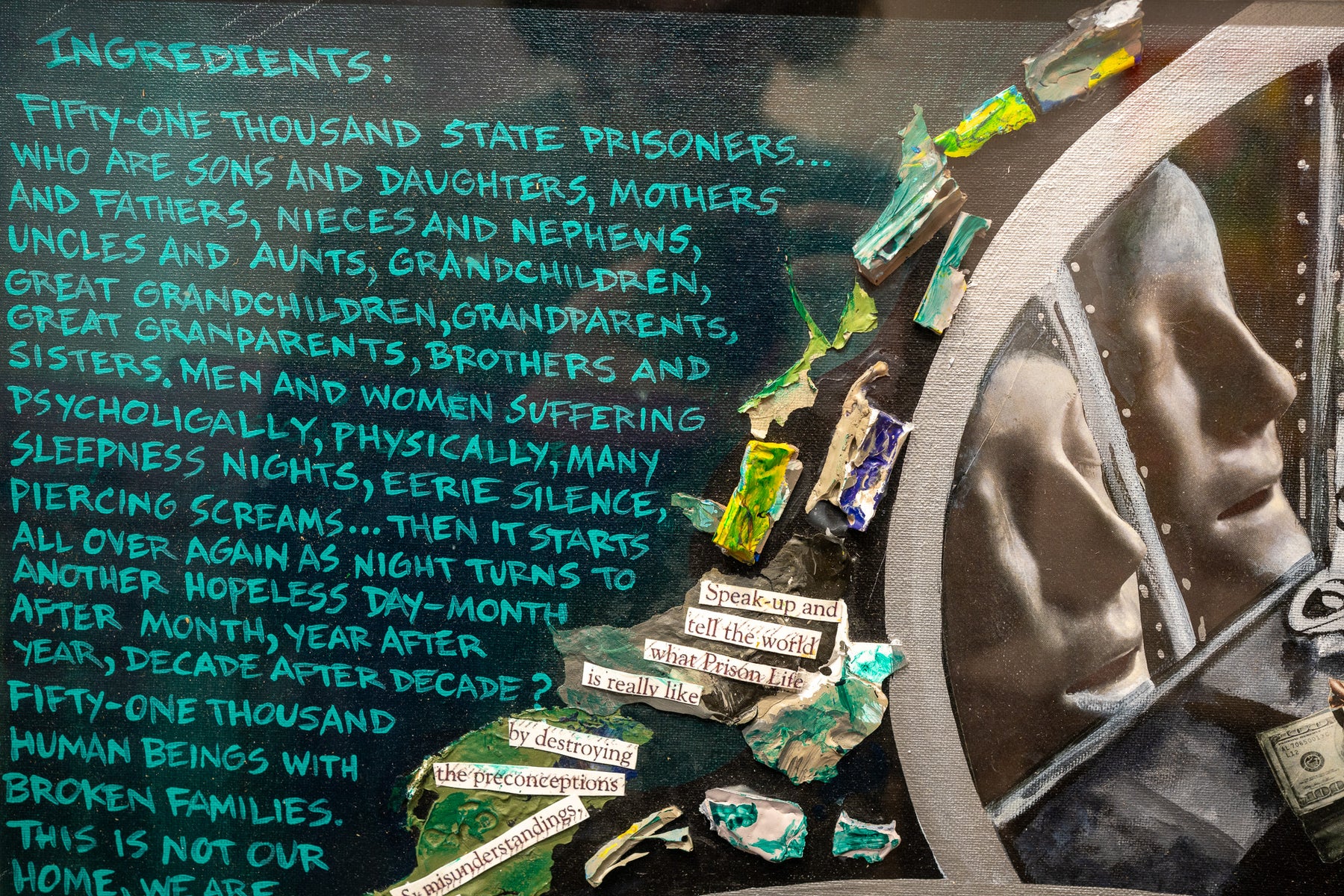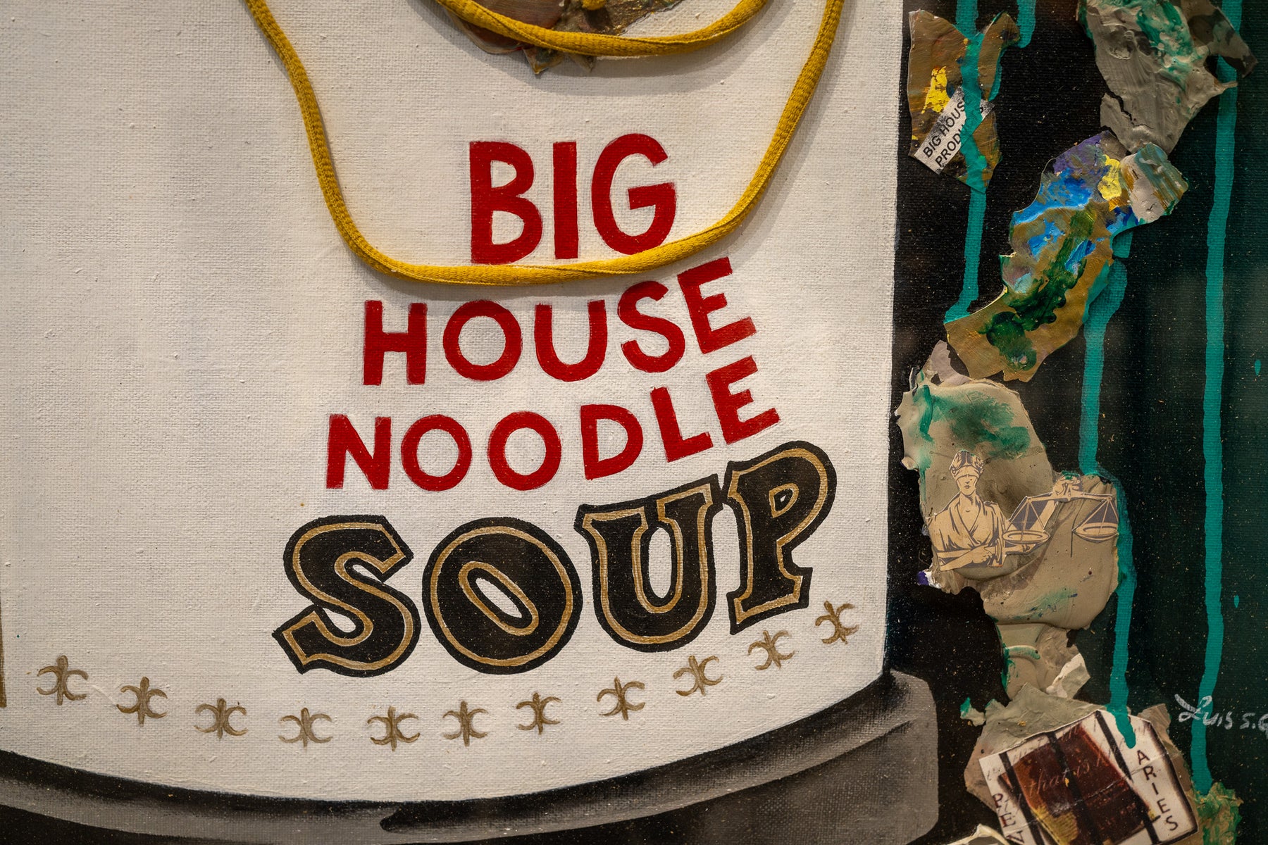 Made while serving his life sentence, this artwork is an artistic interpretation of the artist’s former prison cell where he lived for 31 years at the now closed Graterford Prison.  The creation of this artwork got Suave in deep trouble with the Department of Corrections because the mixed media items used in the work were all deemed contraband.  As a result, Suave was sentenced to 90 days of solitary confinement. The artist never regretted creating this artwork titled, BIG HOUSE NOODLE SOUP.  For those who do not know, BIG HOUSE PRODUCTS is the corporation run by the Department of Corrections to sell products created by prisoners to the free world.