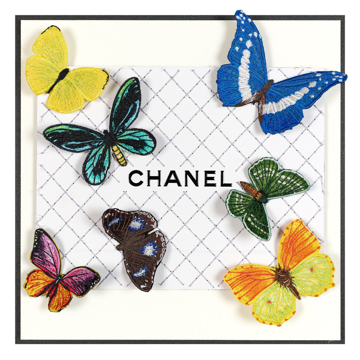The butterfly swarms are the staple pieces to any of Stephen's installations and they are the ones that started it all! Stephen is always creating new swarms in different configurations with unique background stitching for the boxes. The pieces start with a background created from luxury boxes and bags that are deconstructed. The butterflies are all embroidered in the studio and are created for each piece. Delivery time for a custom Butterfly Swarm is 4 weeks.