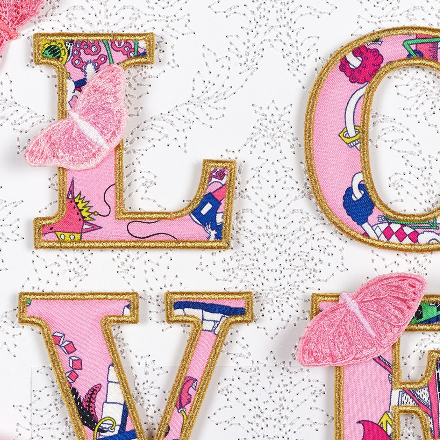 The Love pieces begin with a background created from luxury boxes and bags that have been deconstructed and then directly embroidered. The typography is made using a luxury brand silk scarf. The scarf is embroidered, appliquéd, and then affixed to laser-cut acrylic before being mounted in relief to the background. The butterflies are all individually embroidered to harmoniously blend with the scarf colors and are added to create a dimensional effect.