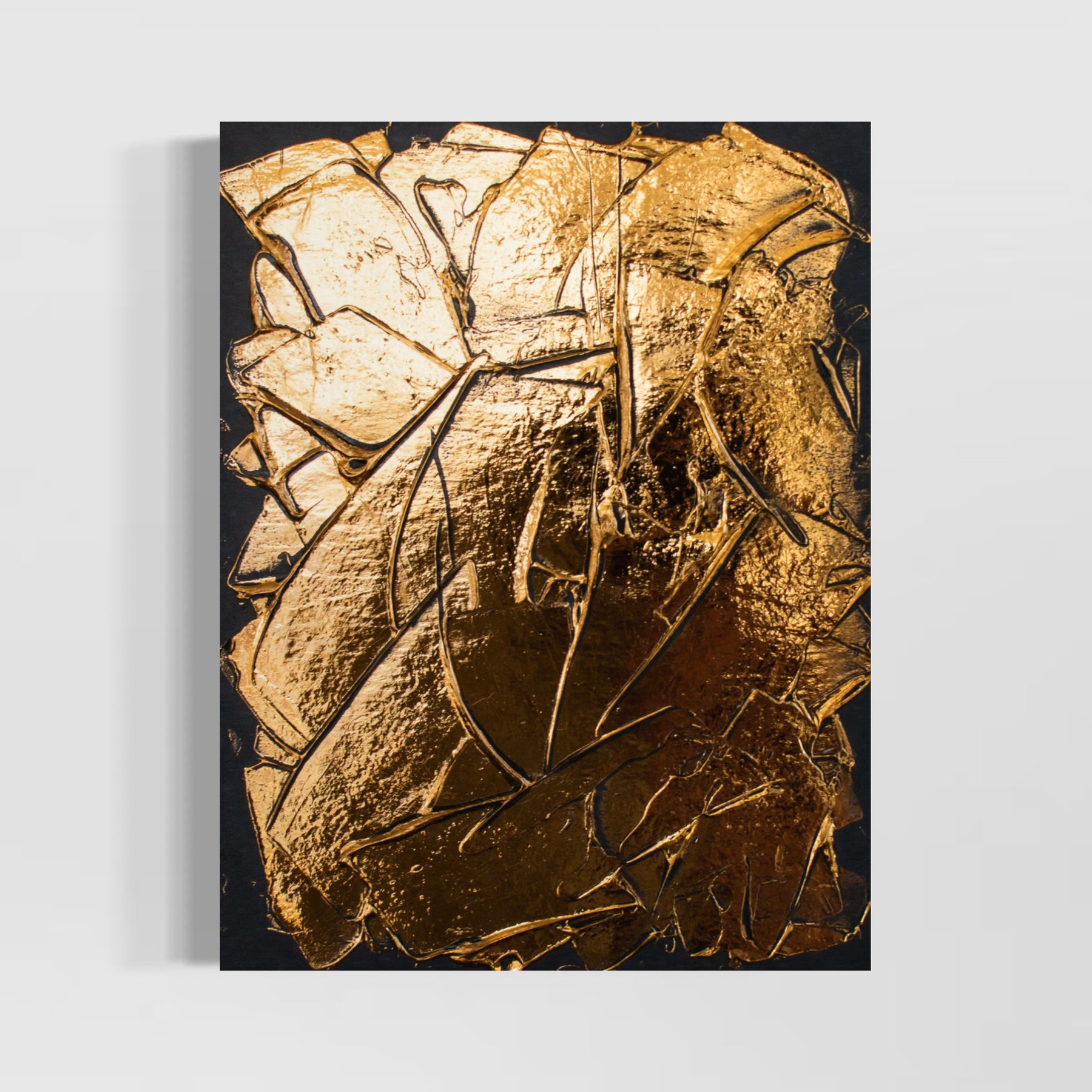 NYC based artist, M. Clark, creates light-reflecting works wherein the artist manipulates heat and pressure to fix metallic foil onto various surfaces -- there is no paint on her artworks, only gold, copper, or silver foil. Clark often uses a palette knife to help texturize her highly reflective, modern and minimalist works of art.