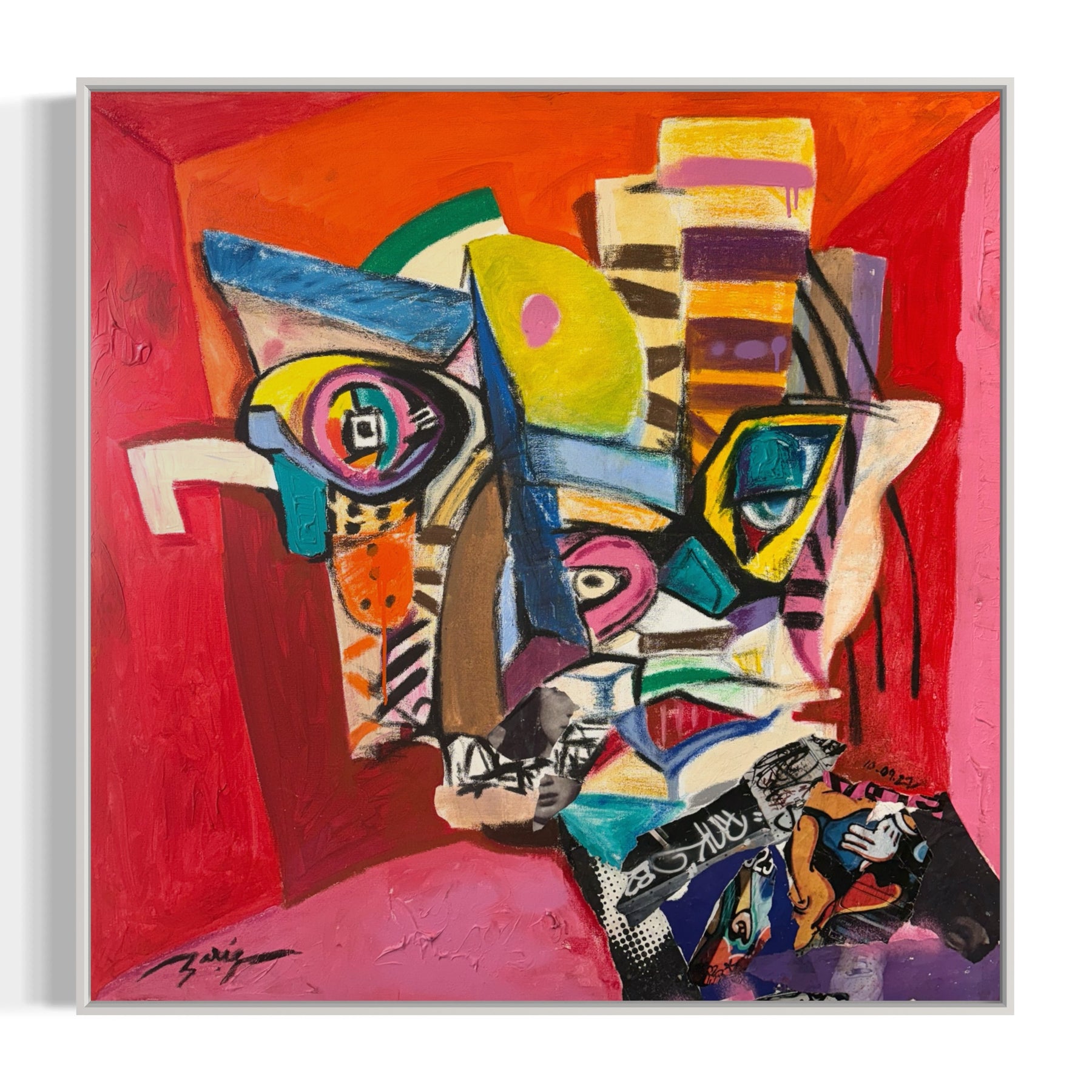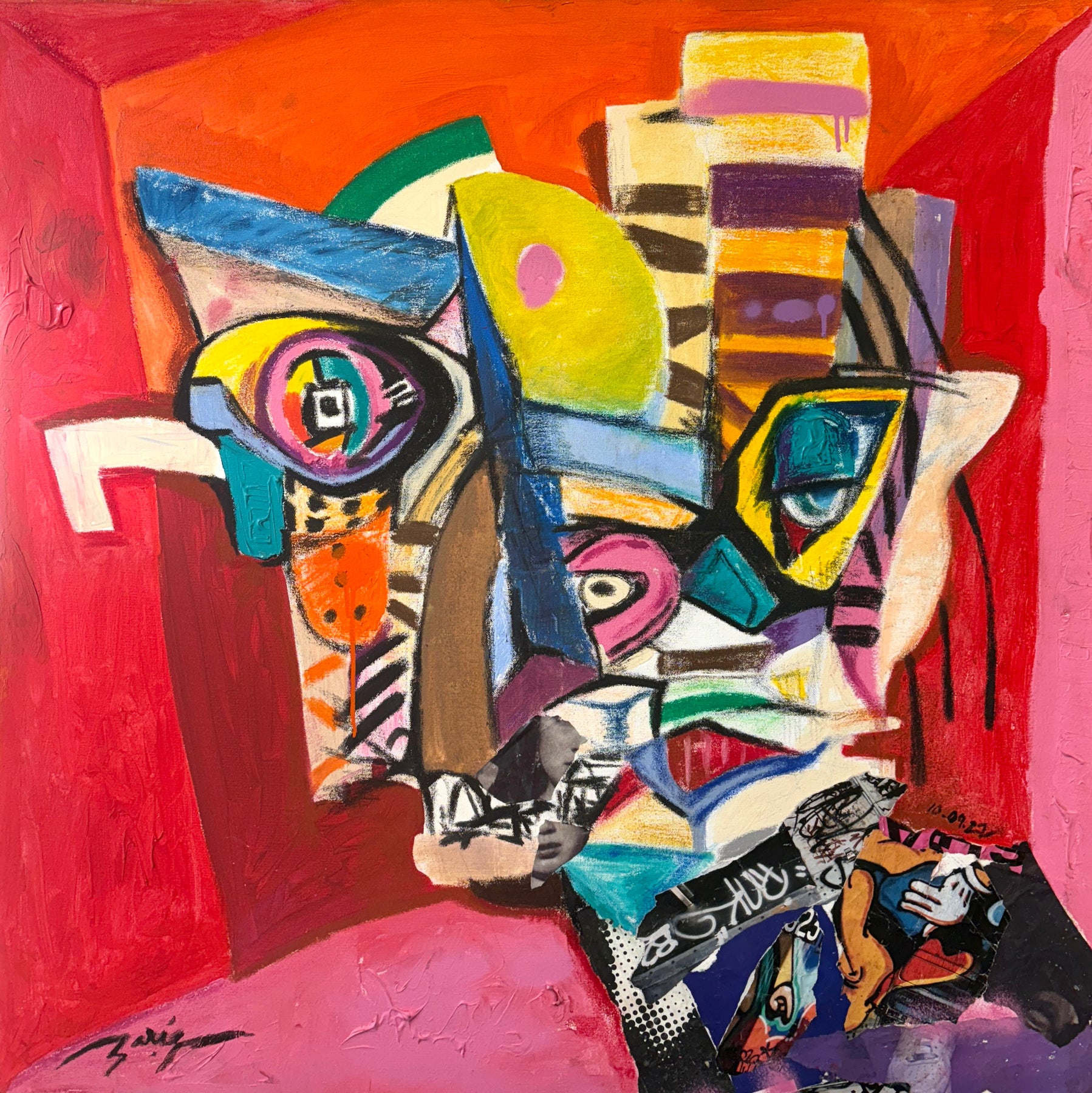 abstract portrait collage eyes bright colors and shapes with ed pink green yellow blue