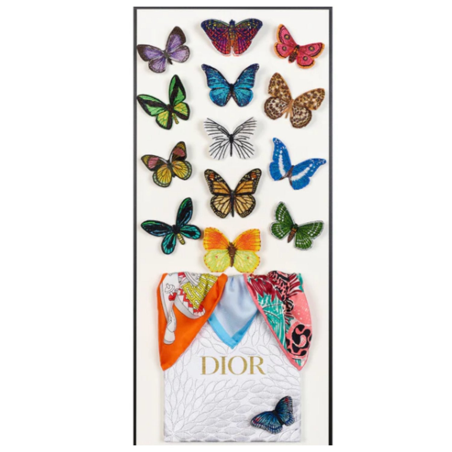 For the Butterfly Surprise pieces, Stephen wanted to recreate a shopping bag out of his up-cycled luxury pieces. The piece starts with a luxury bag that is deconstructed, embroidered and then reconstructed back into a bag shape. Luxury scarf remnants are then draped and mounted so they appear to be flowing out of the bag. Embroidered butterflies are then dimensionally mounted to appear exploding out of the bag.