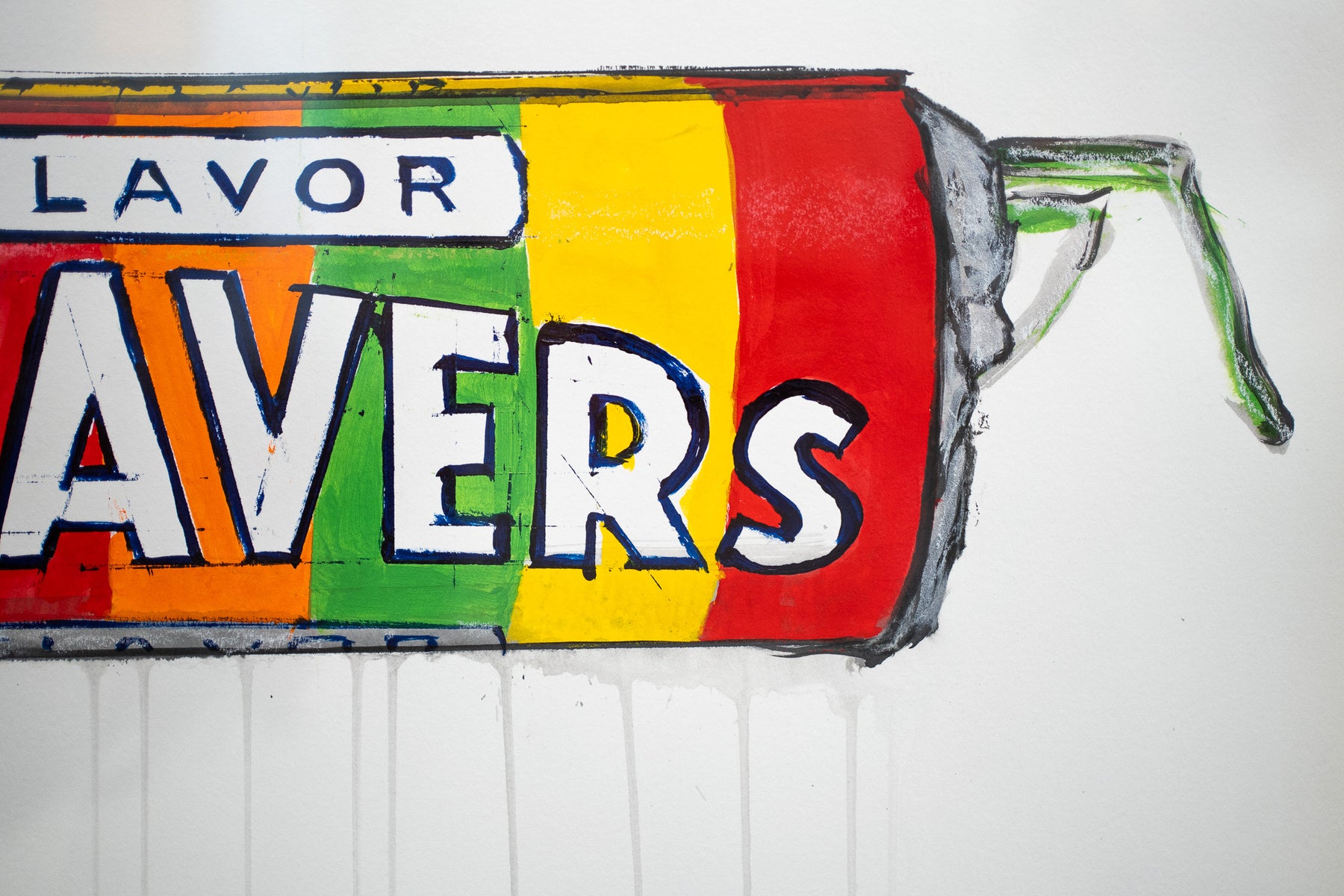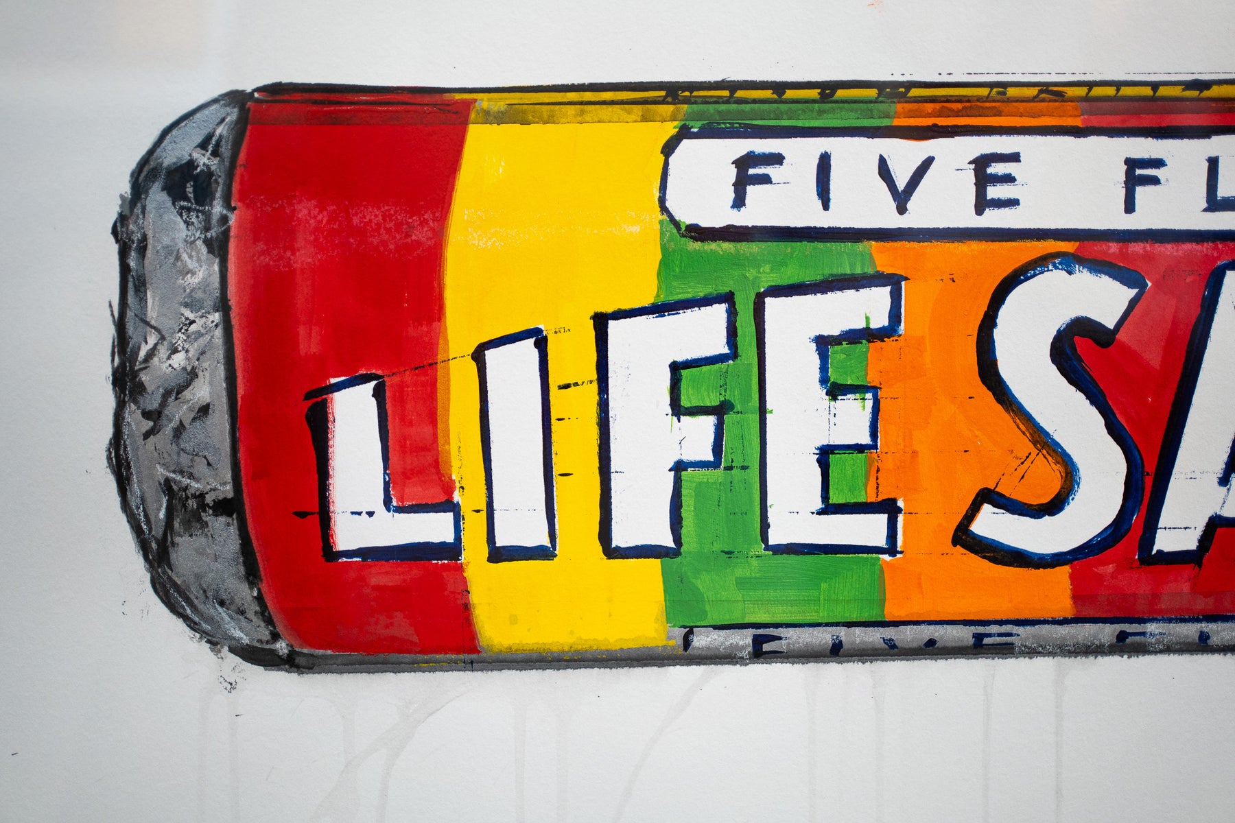 graphic life savers candy drawing in charcoal with red green orange and yellow dripping down blank white background