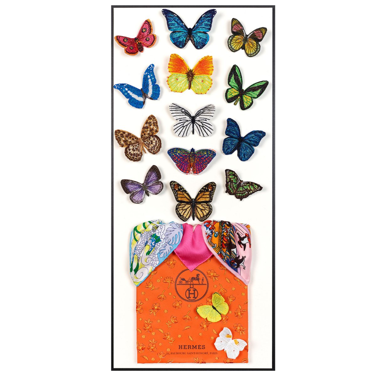 For the Butterfly Surprise pieces, Stephen wanted to recreate a shopping bag out of his up-cycled luxury pieces. The piece starts with a luxury bag that is deconstructed, embroidered and then reconstructed back into a bag shape. Luxury scarf remnants are then draped and mounted so they appear to be flowing out of the bag. Embroidered butterflies are then dimensionally mounted to appear exploding out of the bag.