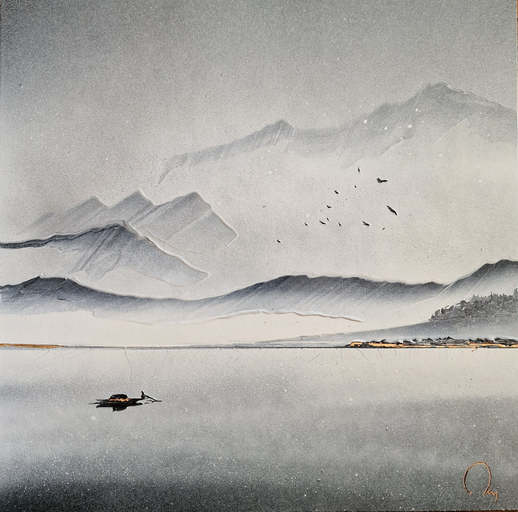 Julien Rey's story begins like all great stories: with an impossible dream. With achromatopsia (the absence of color vision), the artist sees only in black and white. Yet, this condition did not prevent him from traveling to the borders of Burma, from changing his life (he became a Buddhist monk), or from embarking on his art. From his trip to Burma, he brought back a perfect mastery of gold leaf and Chinese lacquer, a characteristic element in his work. His technique based on lacquer worked with a knife and gold leaf inlays places light at the center of his works. Marked by Zen philosophy, he creates minimal compositions that appear as suspended moments and poetic pauses. Julien Rey takes us on a journey through his paintings to urban landscapes and far-off lands.