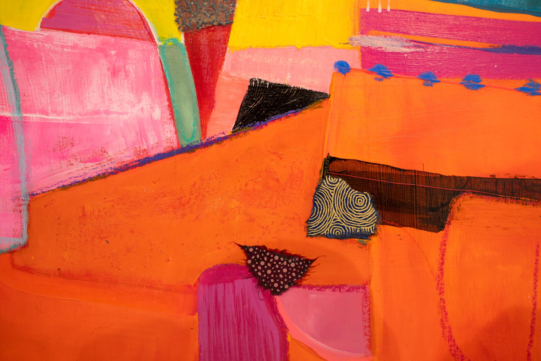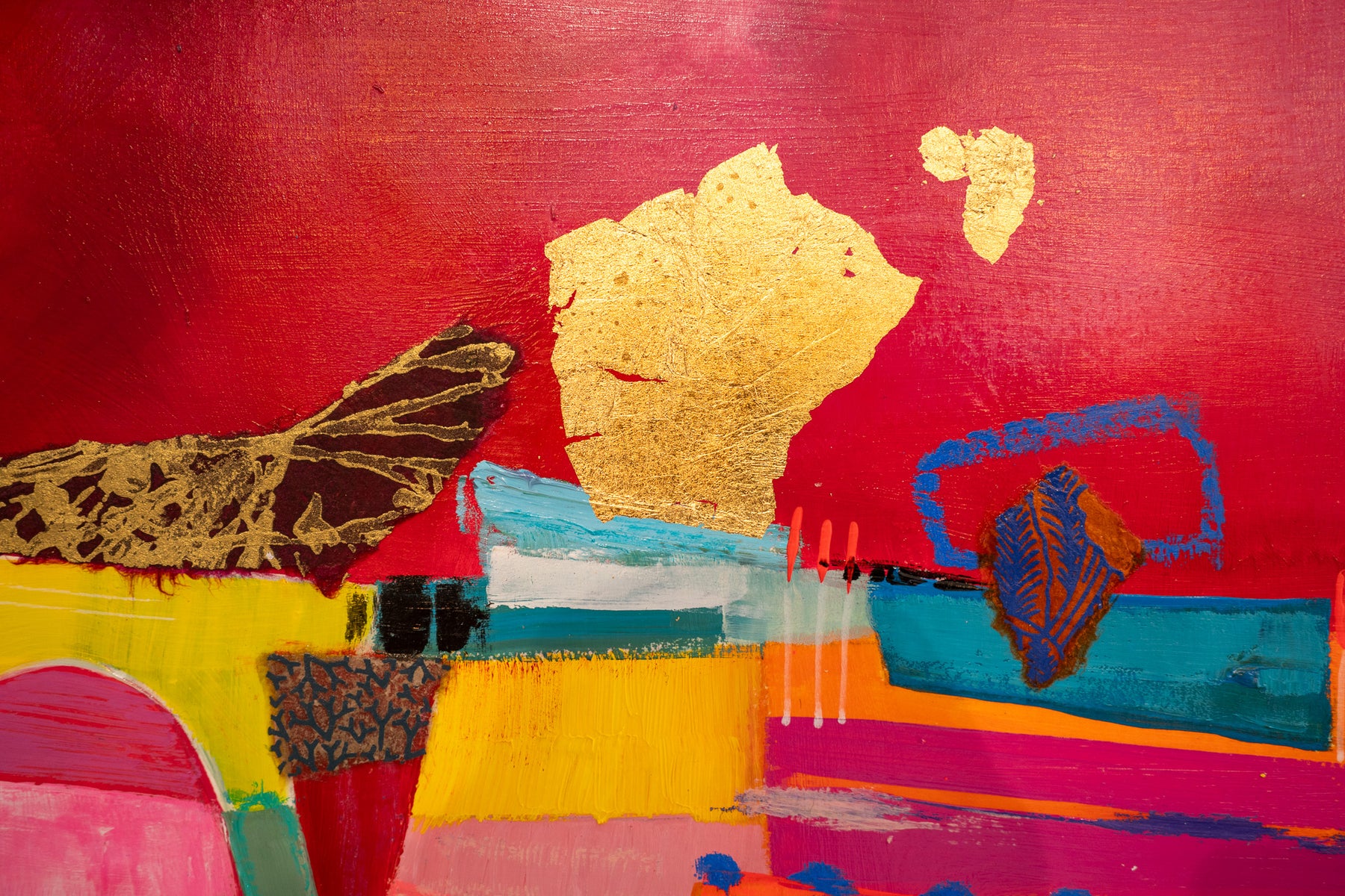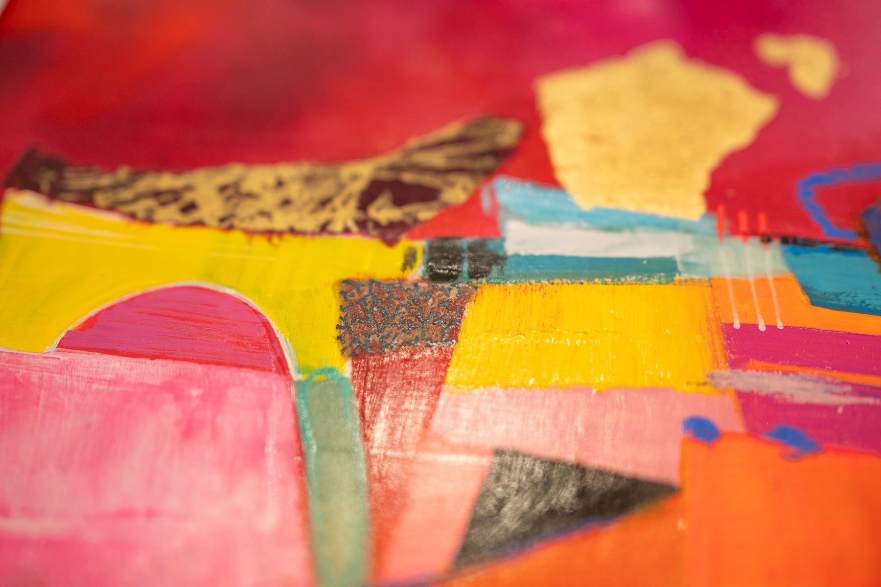 - Acrylic paint, fabric, and gold leaf on cardboard