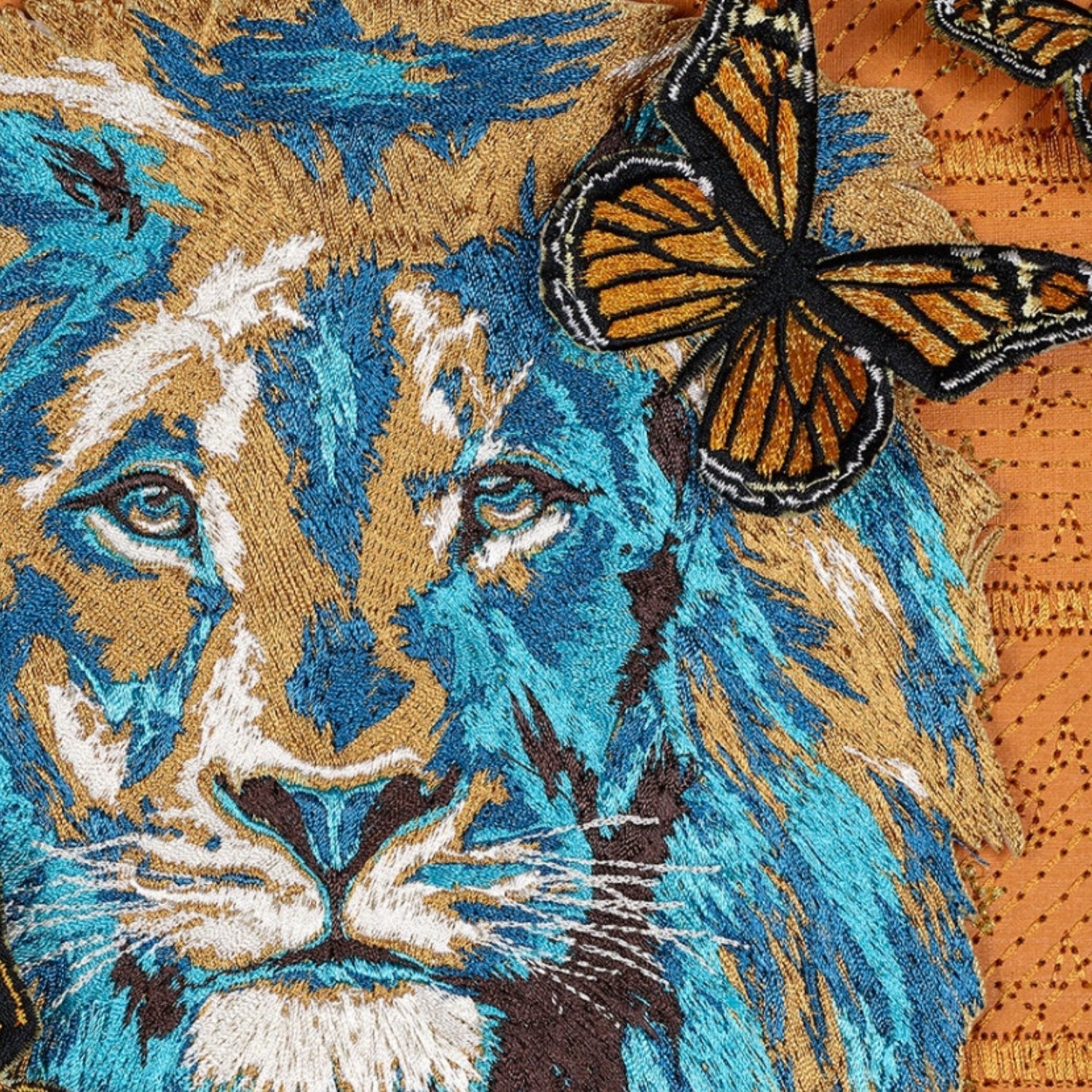 The lion represents strength and was one of the first large scale pieces that Stephen created in this series. The background is created using a single luxury bag or box decorated with stars or other decorative details and the lion is created entirely from thread. Once the lion is embroidered it is mounted in relief off of the background. The Lion pieces are available using the packaging from any brand and in multiple color variations. This is a truly customizable piece.