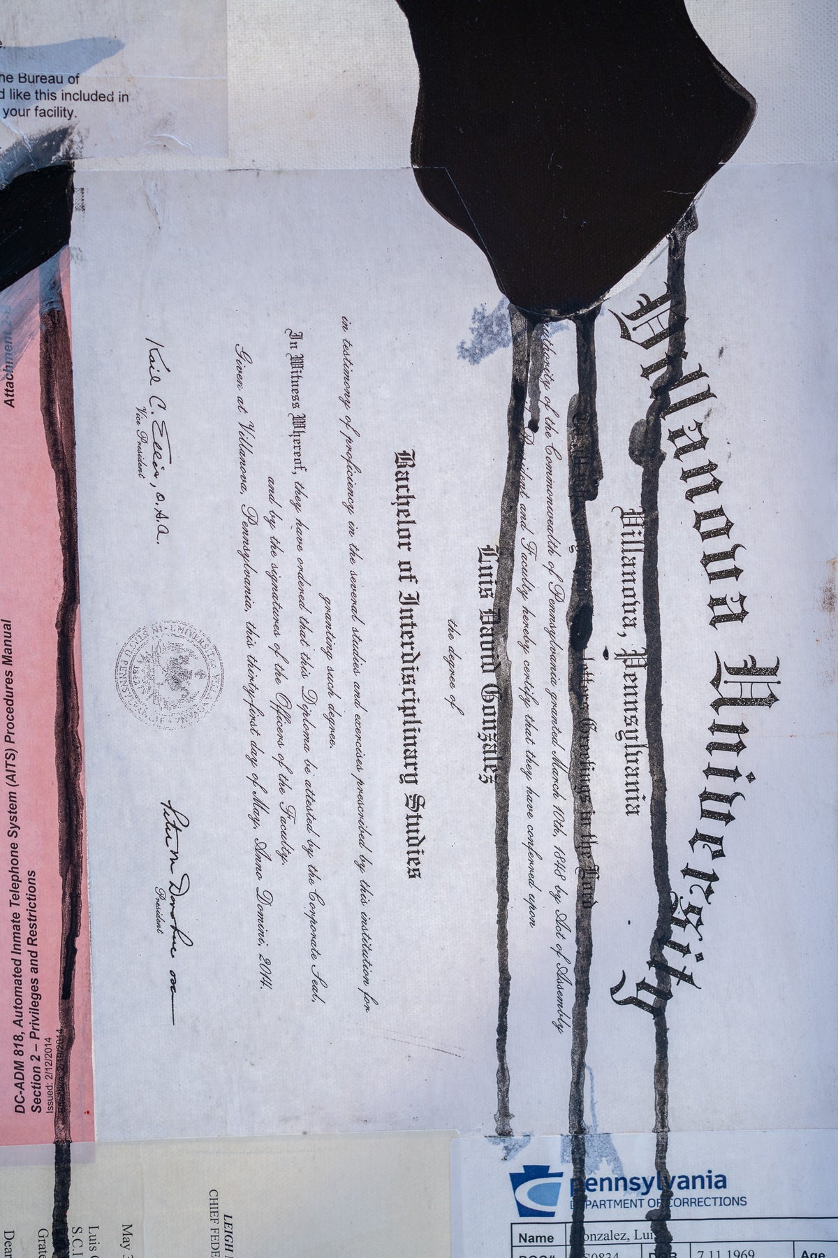 “Mama I Made It is a dedication to my mother who always believed that one day I would make it home.”  Unfortunately, Suave was released in 2017, but his mother passed in 2009.  Maria Gonzalez visited her son every week for 24 years. What the viewer sees behind the face of the artist’s mother is the official and actual paperwork that is required to process an official release from prison – mental health evaluations, judge orders, security passes, the artist’s college degree, legal mail from the artist’s lawyer, court testimonies, and staffing notifications.