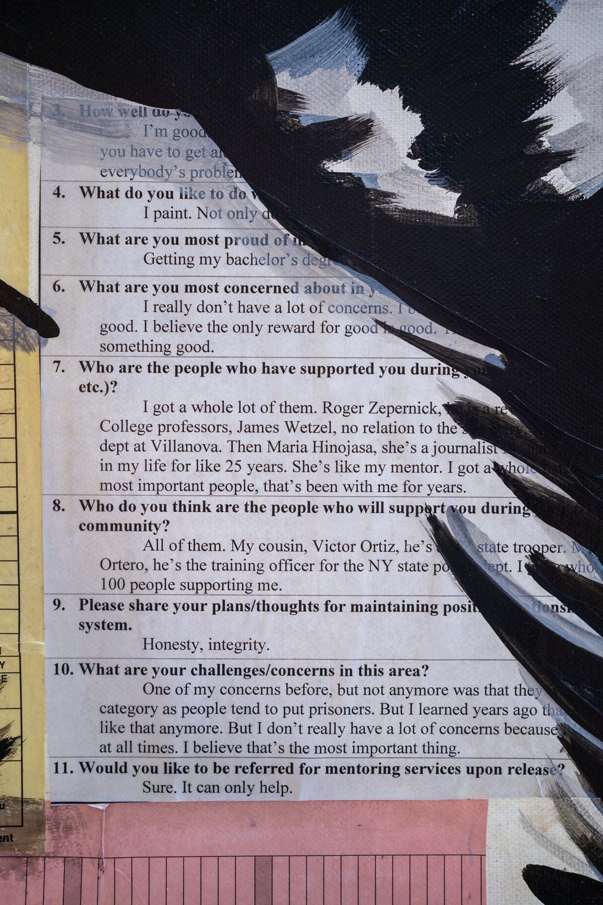 • Acrylic and official Department of Corrections documents from the artist’s prison experience