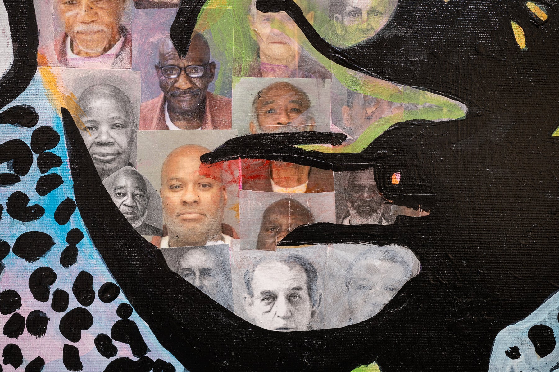 When an inmate gets sick in prison, they are typically charged $5 for a doctor’s visit, however due to the fact inmates make between 10 and 50 cents per hour for work, many sick inmates decline care because they cannot afford to pay the $5 doctor’s fee. As a result, many prisoners don’t report their illness to the institutional medical department, and instead try to treat themselves with a tylenol. The end result is often fatal. The individual prisoners featured here in this painting were all friends of Suave’s, and each received a life sentence. Tragically, every man depicted here died while in prison because they did not have the $5 to cover the service charges to see a doctor. “No matter where you are – no one should be denied medical treatment for the lack of $5.”