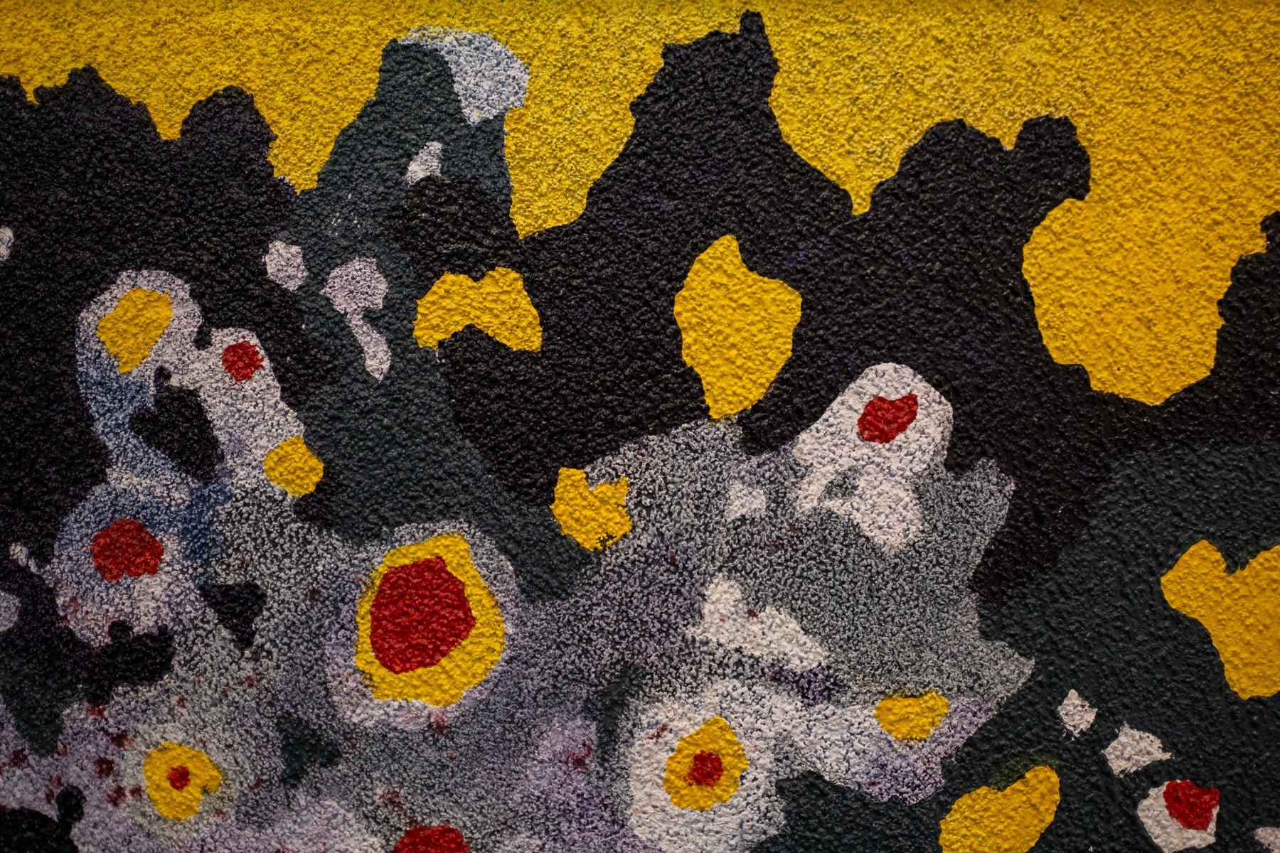 abstract expressionist splotches of blue green and yellow with red dots fish scale shiny textured pumice canvas