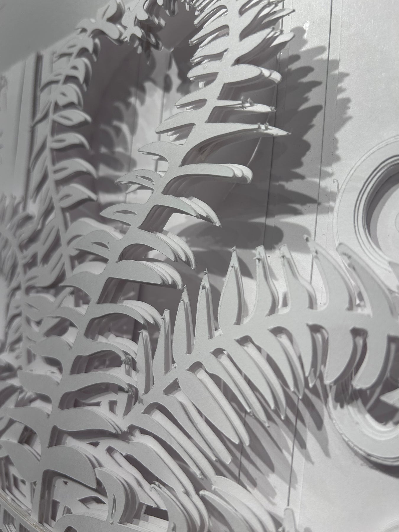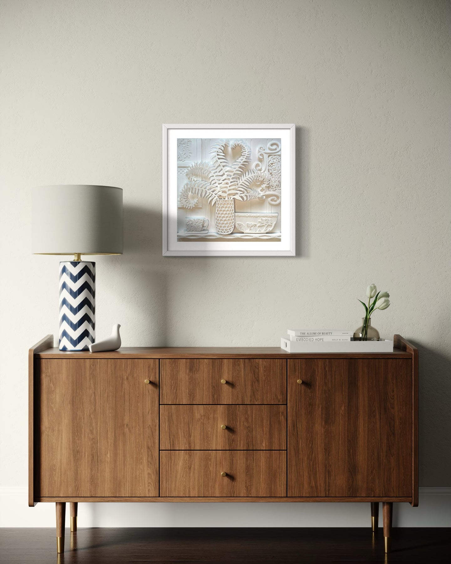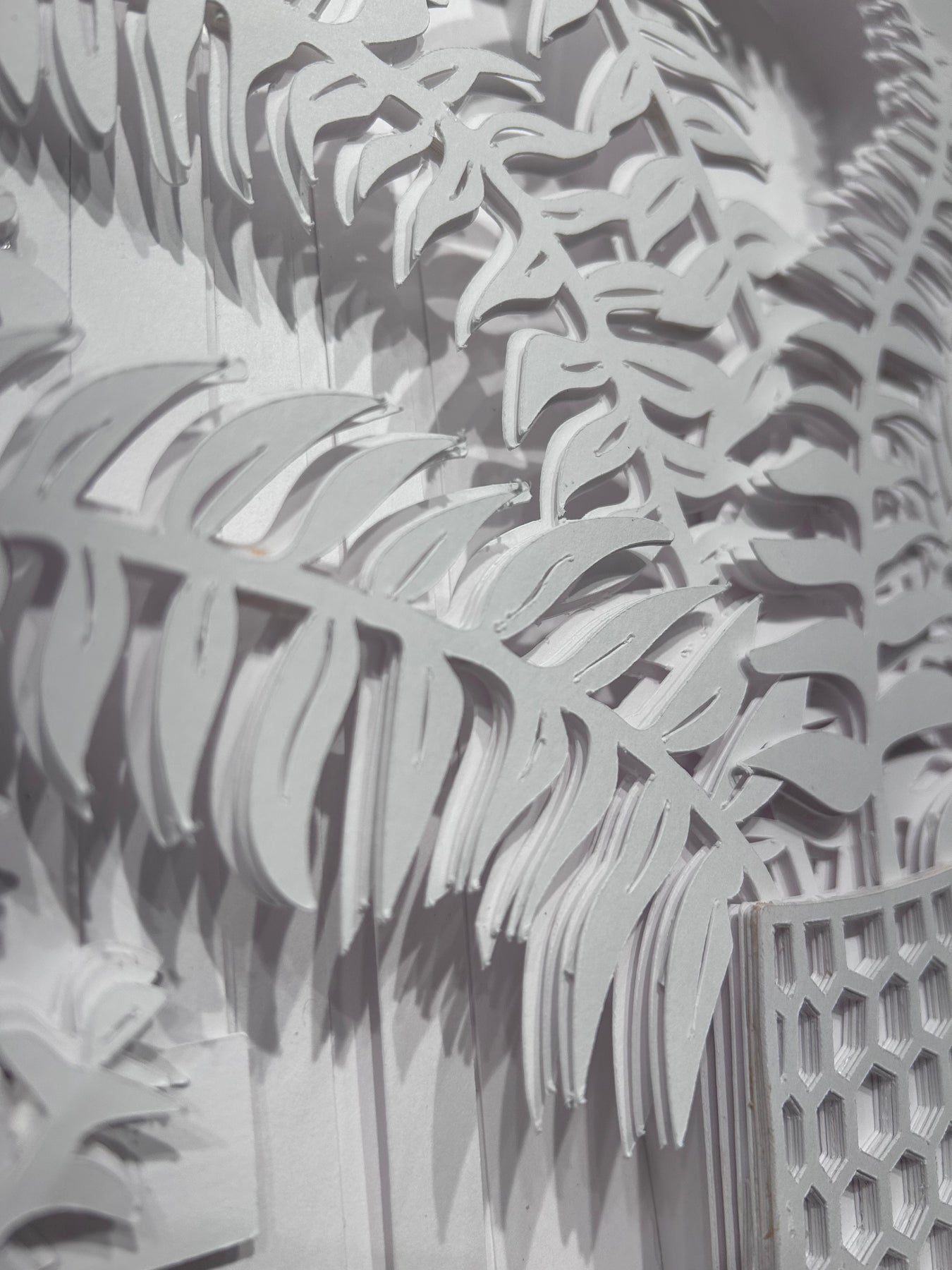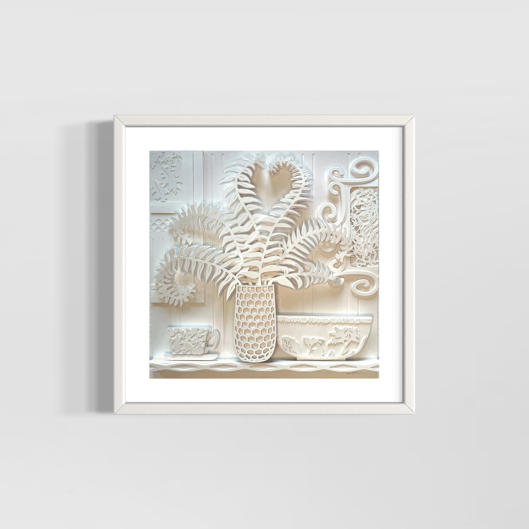 14"x14" layered white paper forming a vase with a fern over a wall.