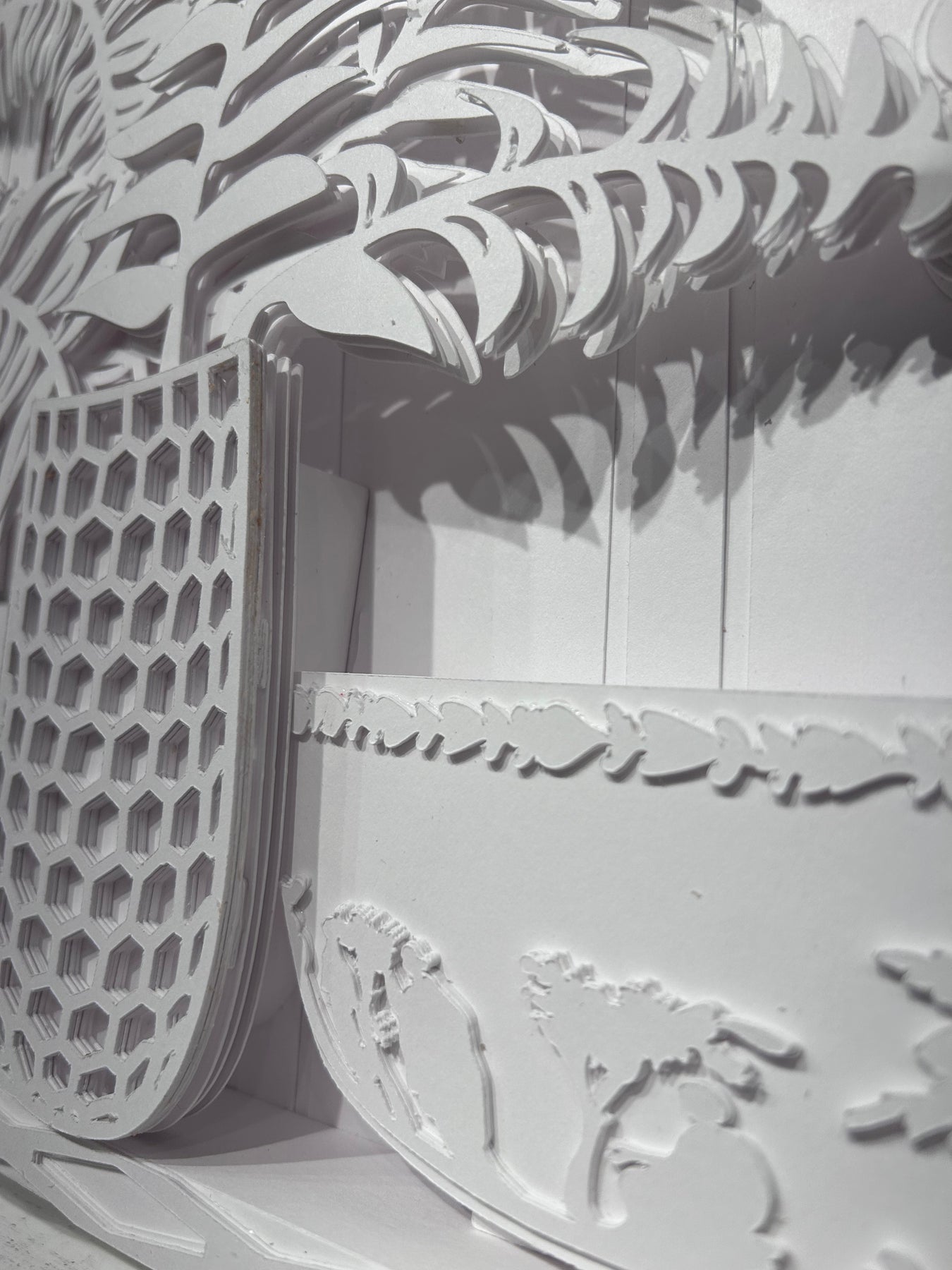 Susan Ryder's art is created by meticulously cutting and layering crisp white paper, distanced just a few millimeters apart. This technique allows for a full spectrum of colors to emerge solely from the shadows. The use of all white paper is important to allow the shadows to exist without distraction.  The result is a dynamic sketch, rich with overlapping shadows that shift and change with the movement of light.